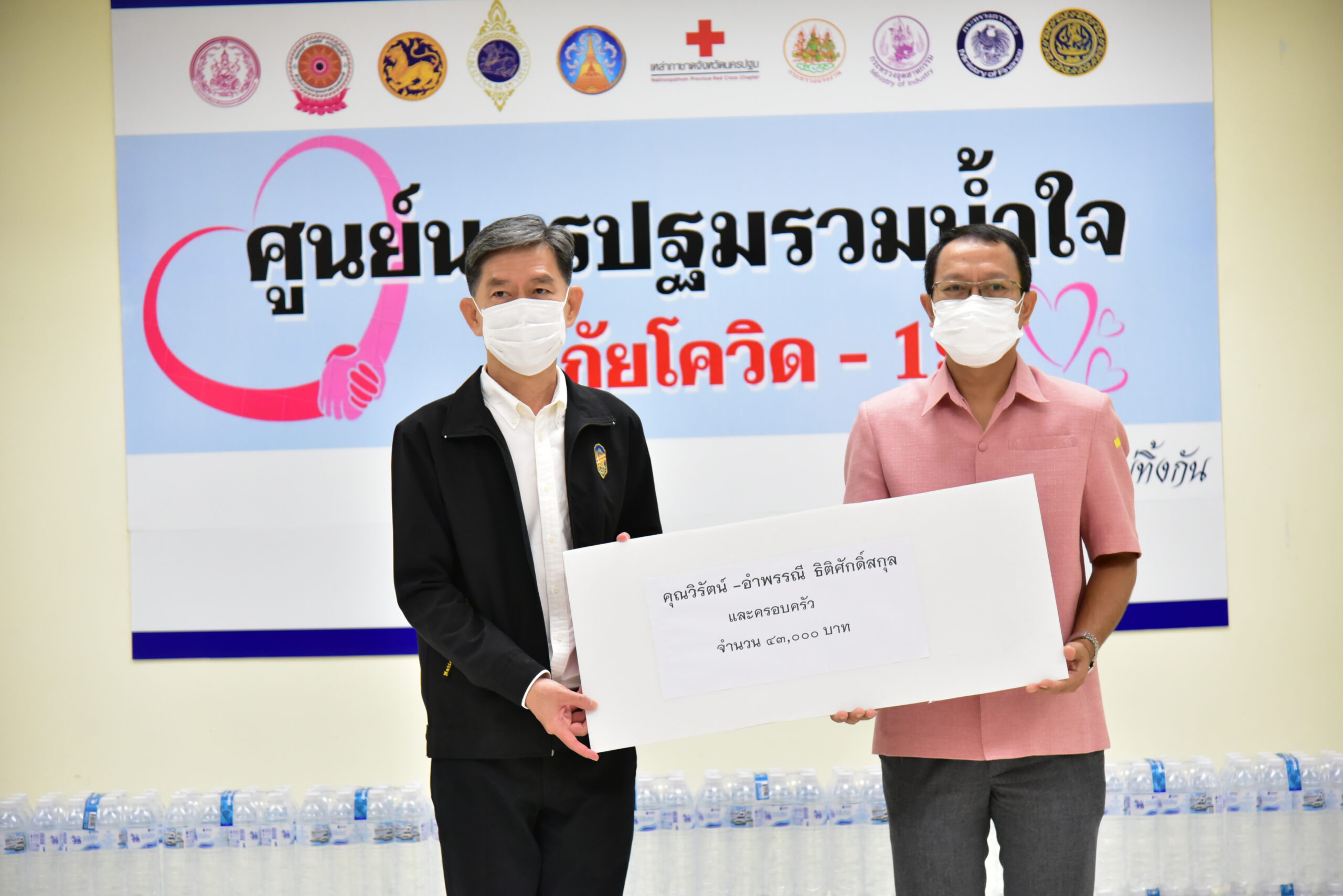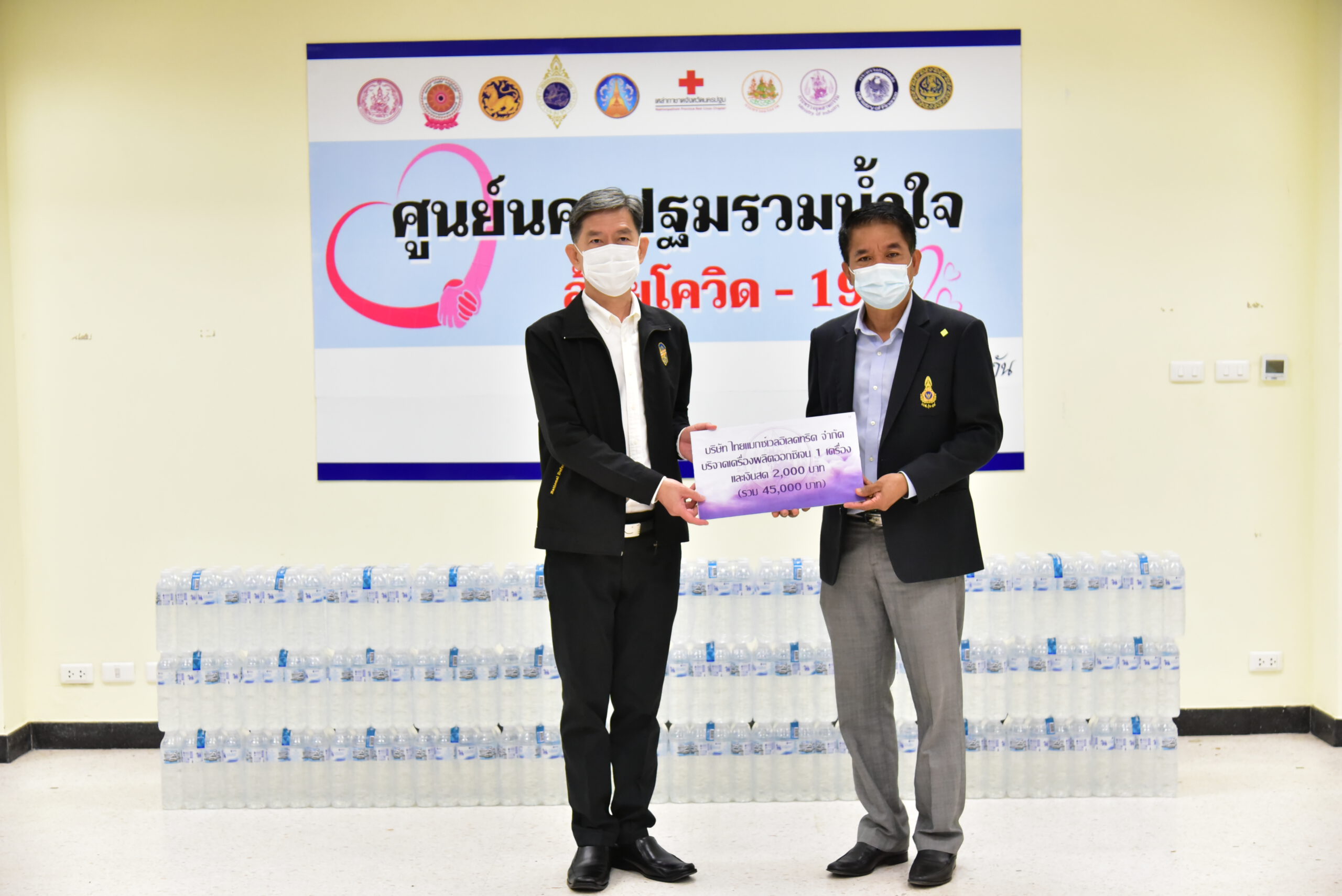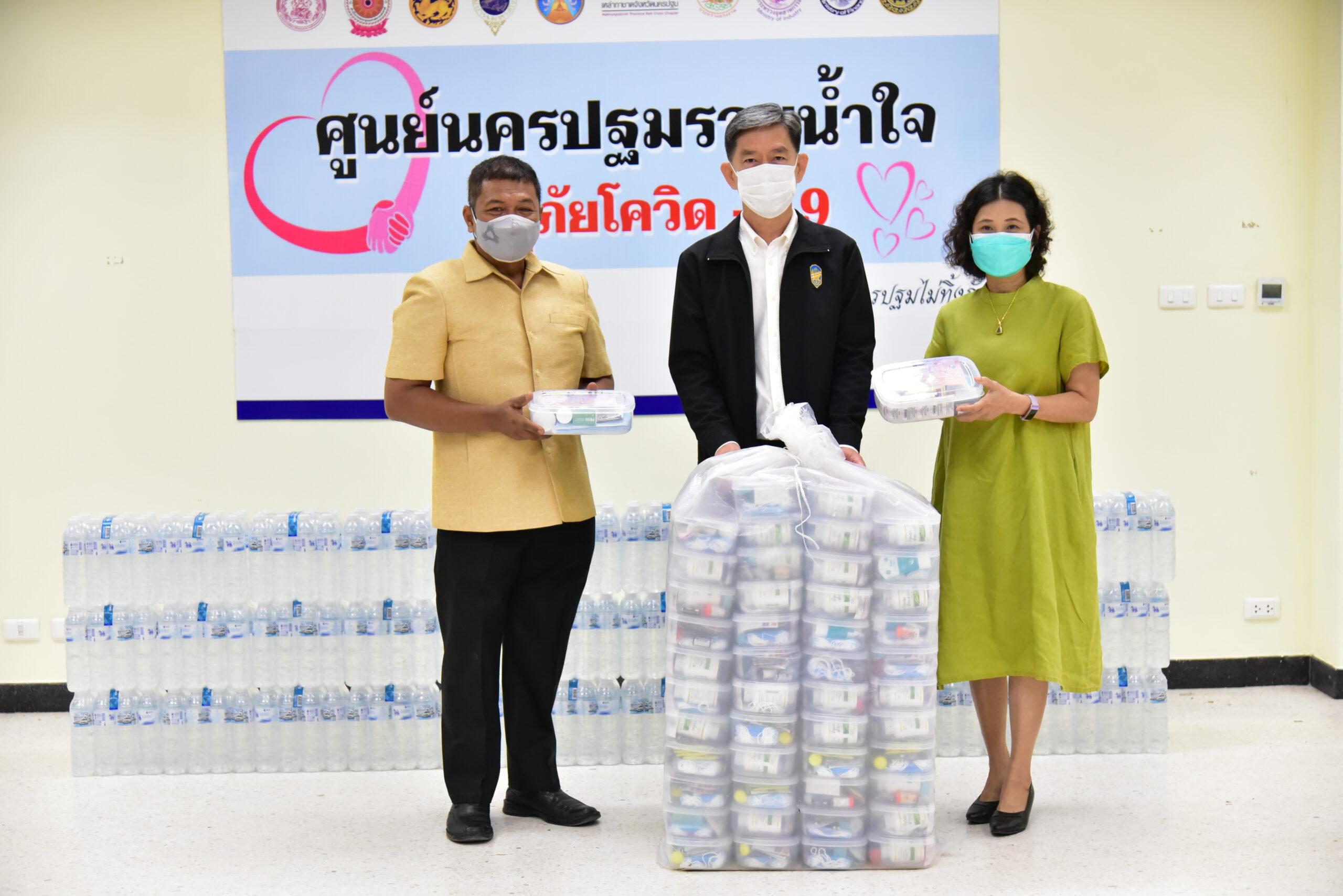 นายสุรศักดิ์ เจริญศิริโชติ ผู้ว่าราชการจังหวัดนครปฐม พร้อมด้วย นายรัฐศาสตร์ ชิดชู รองผู้ว่าราชการจังหวัด และหัวหน้าส่วนราชการ ร่วมรับมอบเงินและสิ่งของบริจาคจากภาคเอกชน สมาคม และบุคคล เพื่อช่วยเหลือผู้ที่ได้รับผลกระทบจากการแพร่ระบาดของโรคติดเชื้อไวรัสโควิด-19 ตลอดจนสนับสนุนโรงพยาบาลในจังหวัดจัดซื้ออุปกรณ์ทางการแพทย์ ได้แก่ เงินสดรวมทั้งสิ้น 52,000 บาท ข้าวสาร 1,000ถุง เครื่องผลิตออกซิเจน รวม 11 เครื่อง เจลแอลกฮอล์ 2,400 หลอด น้ำดื่ม อาหารสำเร็จรูป ตลอดจนกล่องอุ่นใจ เพื่อสนับสนุนการปฏิบัติภารกิจเกี่ยวกับการป้องกันและยับยั้งการแพร่ระบาดของโรคโควิด-19