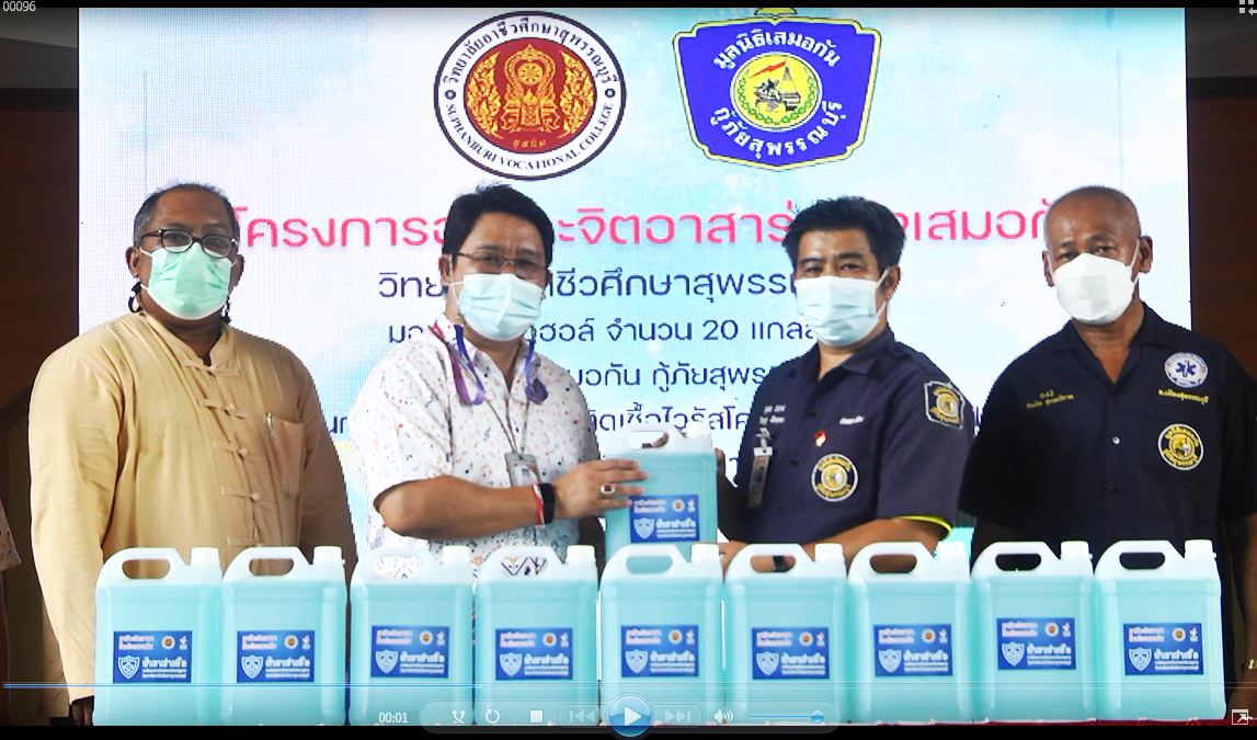 ดร.ศรากร บุญปถัมภ์ ผอ.วิทยาลัยอาชีวศึกษาสุพรรณบุรีกล่าวว่าขณะนี้เชื้อไวรัสโควิด 19 ยังระบาดรุนแรงวิทยาลัยอาชีวศึกษาสุพรรณบุรี ขอเป็นส่วนหนึ่งที่จะช่วยดูแลบุคลากรทางการแพทย์รวมถึงบุคลากรที่เกี่ยวข้องวันนี้วิทยาลัยฯคณะผู้บริหาร ครูอาจารย์บุคลากรของวิทยาลัยทุกคนได้ร่วมแรงร่วมใจจัดทำเจลแอลกอฮอล์ล้างมือซึ่งเป็นอุปกรณ์ฆ่าเชื้อมอบให้กับมูลนิธิเสมอกันกู้ภัยสุพรรณบุรี ซึ่งเป็นบุคลากรจิตอาสาด่านหน้าจำนวน 20 แกนลอนเพื่อไปใช้ดูแลประชาชนในพื้นที่จังหวัดสุพรรณบุรี ให้รอดปลอดภัยจากเชื้อโควิด19 ซึ่งการมอบแอลกอฮอล์ครั้งนี้เป็นไปตามนโยบายของสำนักงานคณะกรรมการการอาชีวศึกษา ก่อนหน้านี้วิทยาลัยอาชีวศึกษาสุพรรณบุรี ยังได้จัดทำอาหารกลางวัน 1,500 กล่องมอบให้กับบุคลากรทางการแพทย์โรงพยาบาลศูนย์เจ้าพระยายมราชและโรงพยาบาลสนาม พร้อมจัดทำเจลแอลกอฮอล์ น้ำยาล้างจาน สบู่ล้างมือ น้ำยาปรับผ้านุ่ม มอบให้กับทางจังหวัดสุพรรณบุรีเพื่อนำไปมอบให้กับโรงพยาบาลสนามต่างๆ ซึ่งทางวิทยาลัยอาชีวศึกษาสุพรรณบุรี ขอเป็นกำลังใจให้กับบุคลากรทางแพทย์ อสม.เจ้าหน้าที่ผู้ปฏิบัติงานด่านหน้าโดยเฉพาะอาสาสมัครกู้ภัย