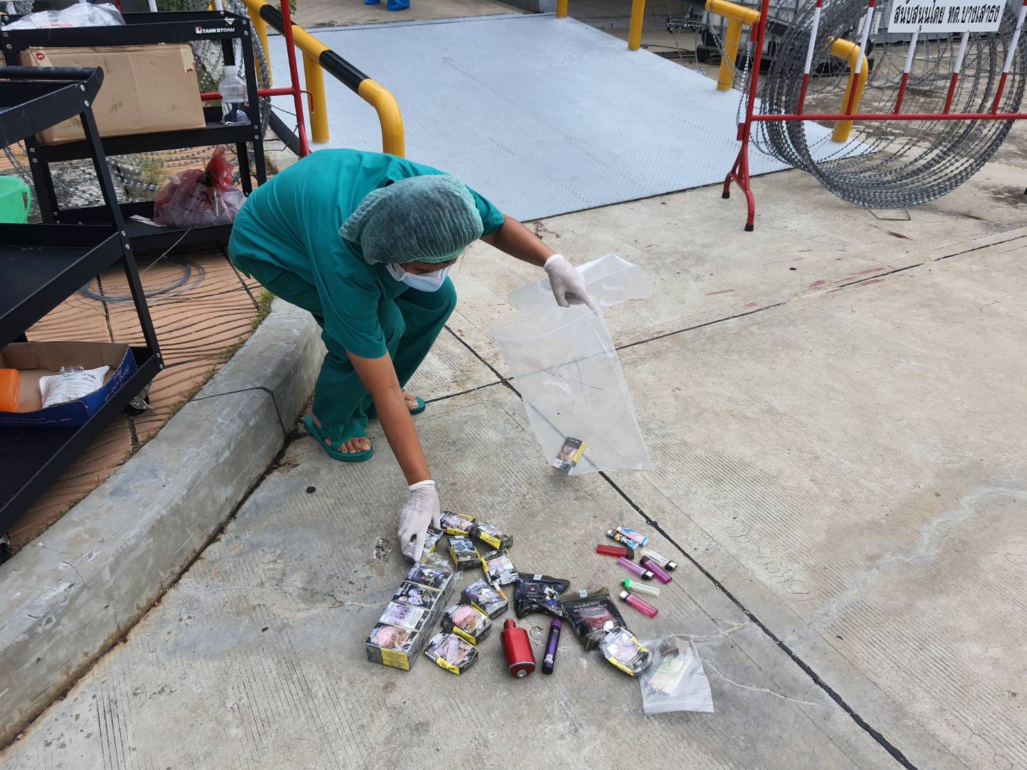 *****ขณะที่เจ้าหน้าที่เข้าตรวจค้นพบผู้ป่วยบางราย ทั้งชาย หญิง เข้ามานั่งปะปนกันอยู่ ทั้งๆที่เจ้าหน้าที่ได้ทำการคัดแยกให้อยู่คนละที่แล้ว ทั้งที่เจ้าหน้าที่พยาบาลที่ดูแลคอยเตือนอยู่ตลอดเวลา แต่ผู้ป่วยบางรายไมยอมฟังและยังฝ่าฝืนกฎอยู่ตลอด เจ้าหน้าที่จึงให้กลับไปอยู่ที่พักของตนและทำการตรวจค้น จากการตรวจค้นพบบุหรี่ และบุหรี่ไฟฟ้าพร้อมนำยาจำนวนหนึ่ง เจ้าหน้าที่จึงยึดมาเก็บไว้ เนื่องจากห้ามสูบบุหรี่ภายใน รพ.สนามสมุทรปราการรวมใจ 5 WHA