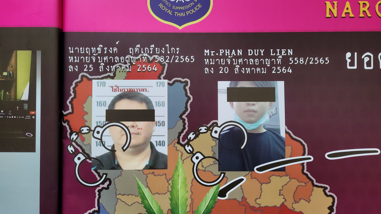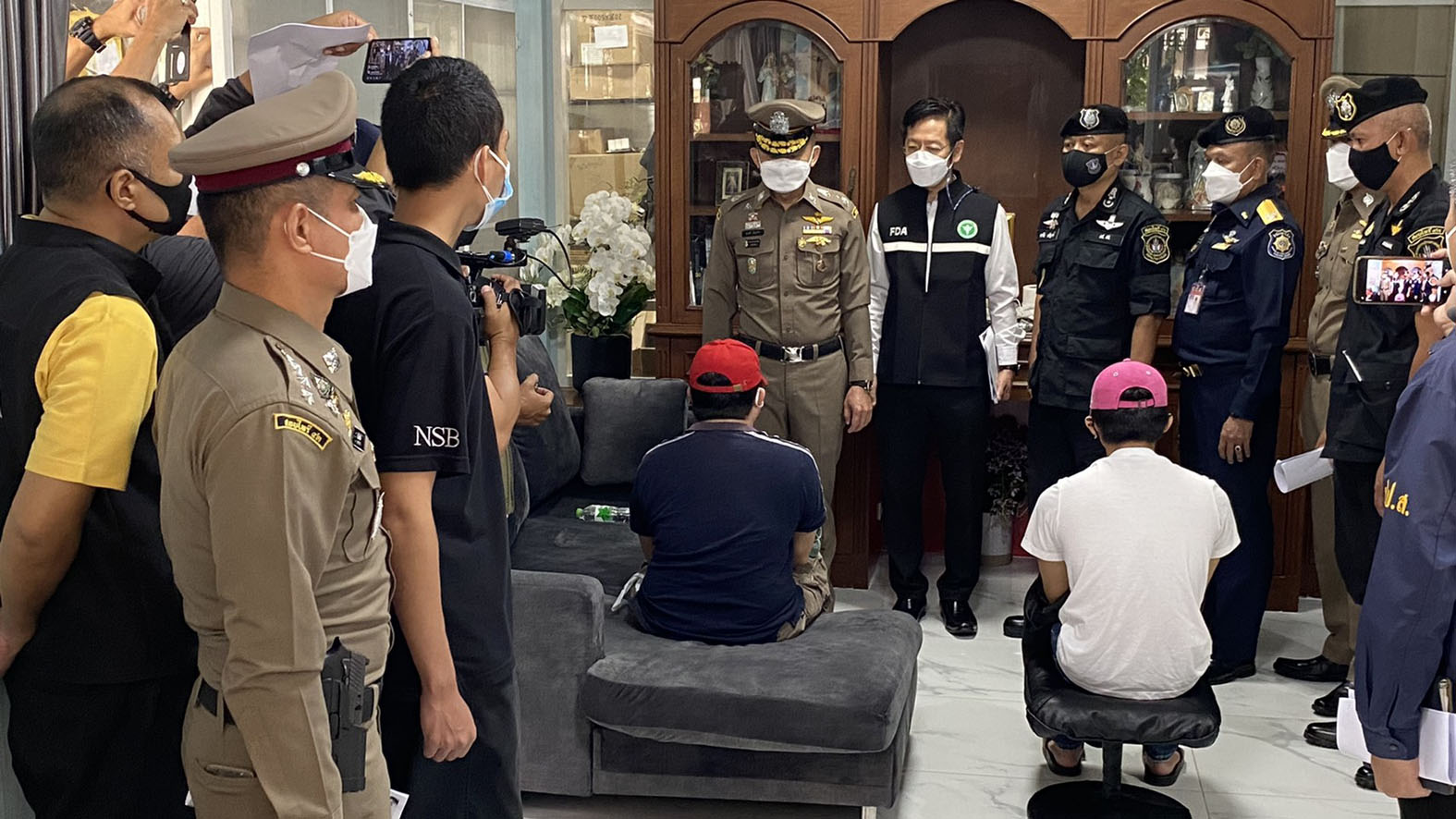 *****เมื่อเวลา 10.30 น.วันที่ 27 สิงหาคม 2564 พล.ต.ท.มนตรี ยิ้มแย้ม ผบช.ปส. นายวิชัยไชยมงคล เลขาธิการ ป.ป.ส. นายแพทย์ไพศาล ดั่นคุ้ม เลขาธิการคณะกรรมการอาหารและยา พ.ต.อ. ภูมิมินทร์ สิงหสุต รอง ผบก.ภ.จว.สมุทรปราการ พ.ต.อ.อาทิตย์ ซิ้มเจริญ ผกก.สภ.สำโรงเหนือ พร้อม พร้อมกำลังเจ้าหน้าที่ชุดปราบปรามยาเสพติด ได้เดินทางมาที่บ้านเลขที่ 9/53 หมู่บ้าน ธนาภิรมย์ ถ.ศรีนครินทร์ ต.เทพารักษ์ อ.เมือง จ.สมุทรปราการ ร่วมกันแถลงผลการจับกุมผลการจับกุมสองผู้ต้องหาร่วมกัน ร่วมกันผลิตเพื่อจำหน่ายยาเสพติดให้โทษประเภท 5 (กัญชา) และผลิตเครื่องสำอางไม่ได้จดแจ้งผลิตเครื่องสำอางปลอม ประกอบ นายฤทธิรงค์ อายุ 49 ปี และ Mr.PHAN สัญชาติเวียดนาม อายุ 22 ปี