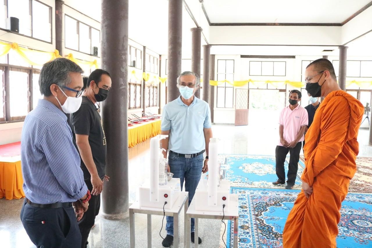 วิทยาลัยเทคโนโลยีอุตสาหกรรมและการจัดการ มหาวิทยาลัยเทคโนโลยีราชมงคลศรีวิชัย วิทยาเขตนครศรีธรรมราช พื้นที่ขนอม นำโดย ดร.สุพร ฤทธิภักดี หัวหน้าสาขาวิศวกรรม อาจารย์อภิรัญธ์ จันทร์ทอง หัวหน้าหลักสูตรวิศวกรรมไฟฟ้า ผู้ช่วยศาสตราจารย์ ดร.อาคม ลักษณะสกุล อาจารย์ประจำหลักสูตรวิชาวิสวกรรมไฟฟ้าและ อาจารย์ชูเกียรติ ชูสกุล อาจารย์ประจำหลักสูตรวิศวกรรมโยธา พร้อมด้วยนักศึกษาและคณะทำงาน ส่งมอบเครื่องจ่ายแอลกอฮอล์เจลอัตโนมัติเพื่อลดการสัมผัส ให้กับหน่วยงานในพื้นที่ขนอม จำนวน 9 เครื่อง 5 หน่วยงาน ได้แก่ กองทุนพัฒนาไฟฟ้าขนอม สำนักงานสาธารณสุขอำเภอขนอม สถานีตำรวจภูธรอำเภอขนอม โรงพยาบาลส่งเสริมสุขภาพตำบลบ้านท่าจันทน์ วัดจันทน์ธาตุทาราม และโรงเรียนวัดคีรีวง พร้อมทดสอบการใช้งานและการเก็บรักษา