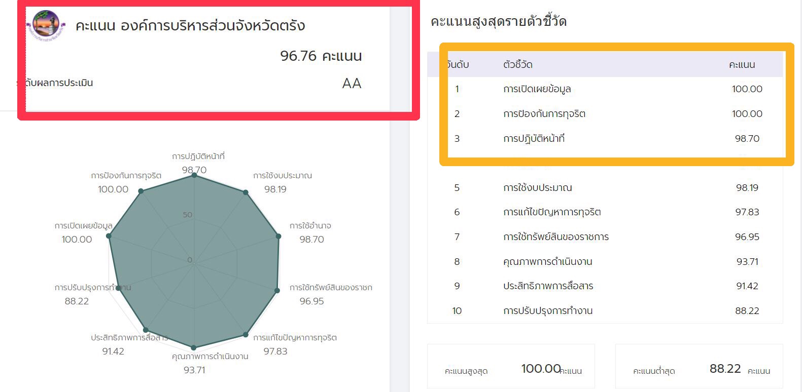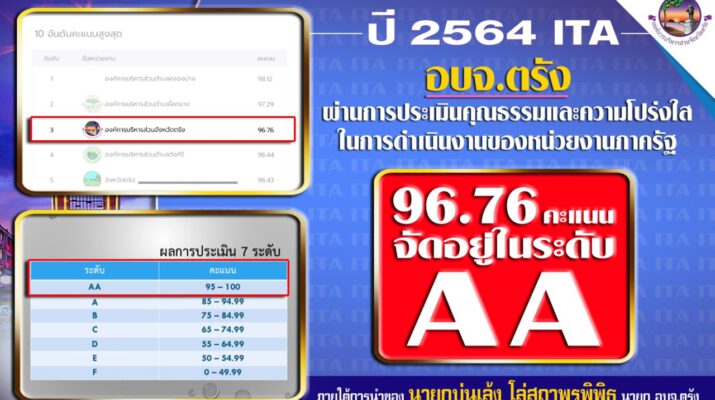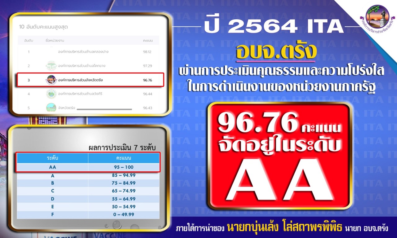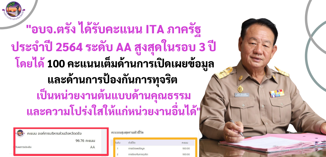 ตรัง อบจ.ได้รับคะแนน ITA ภาครัฐ ประจำปี 2564 ระดับ AA สูงสุดในรอบ 3 ปี โดยได้ 100 คะแนนเต็มด้านการเปิดเผยข้อมูลและด้านการป้องกันการทุจริต บรรลุความสำเร็จในการเป็นหน่วยงานต้นแบบด้านคุณธรรมและความโปร่งใสให้แก่หน่วยงานอื่นได้
