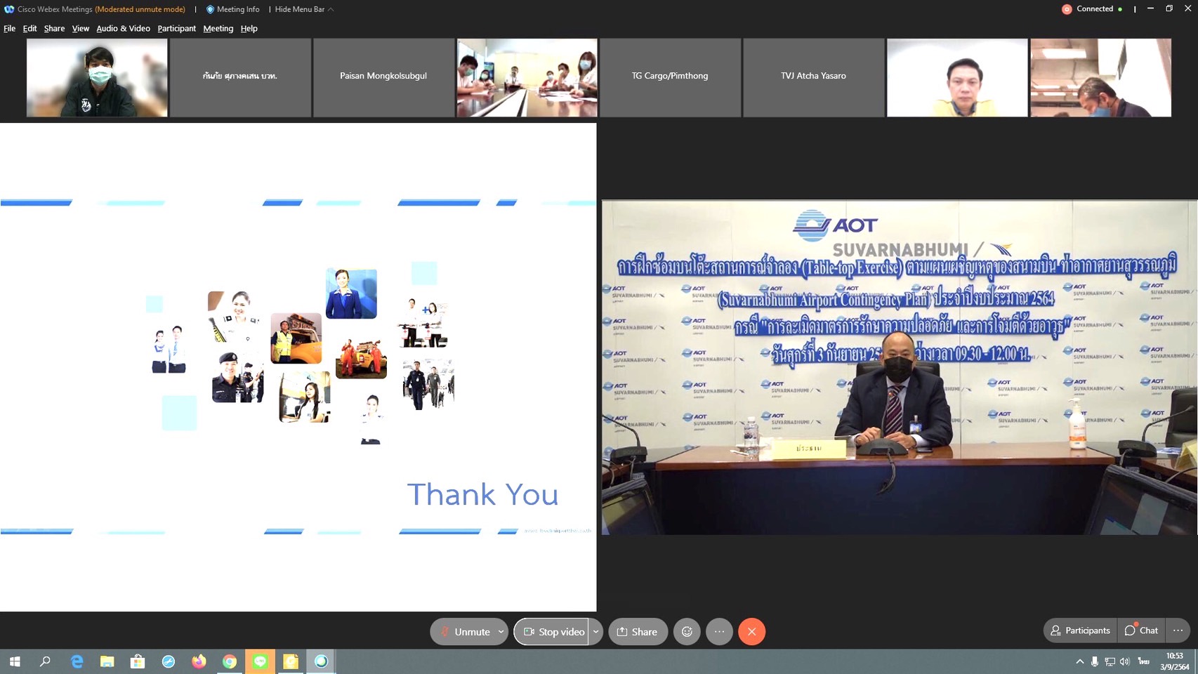 *****เมื่อเวลา 09.30 น. วันที่ 3 ก.ย.2564 นายกิตติพงศ์ กิตติขจร รองผู้อำนวยการท่าอากาศยานสุวรรณภูมิ (สายปฏิบัติการ 1) บริษัท ท่าอากาศยานไทย จำกัด (มหาชน) (ทอท.) เป็นประธานในจัดการฝึกซ้อมบนโต๊ะสถานการณ์จำลอง (Table-top Exercise) ตามแผนเผชิญเหตุของสนามบิน ท่าอากาศยานสุวรรณภูมิ ประจำปี 2564 ผ่านระบบ Video Conference โดยมีวัตถุประสงค์เพื่อให้ผู้เกี่ยวข้องได้เข้าใจบทบาทหน้าที่ ความรับผิดชอบตามที่กำหนดไว้ และสามารถนำไปปฏิบัติในสถานการณ์การกระทำอันเป็นการแทรกแซงโดยมิชอบด้วยกฎหมายได้อย่างมีประสิทธิภาพ