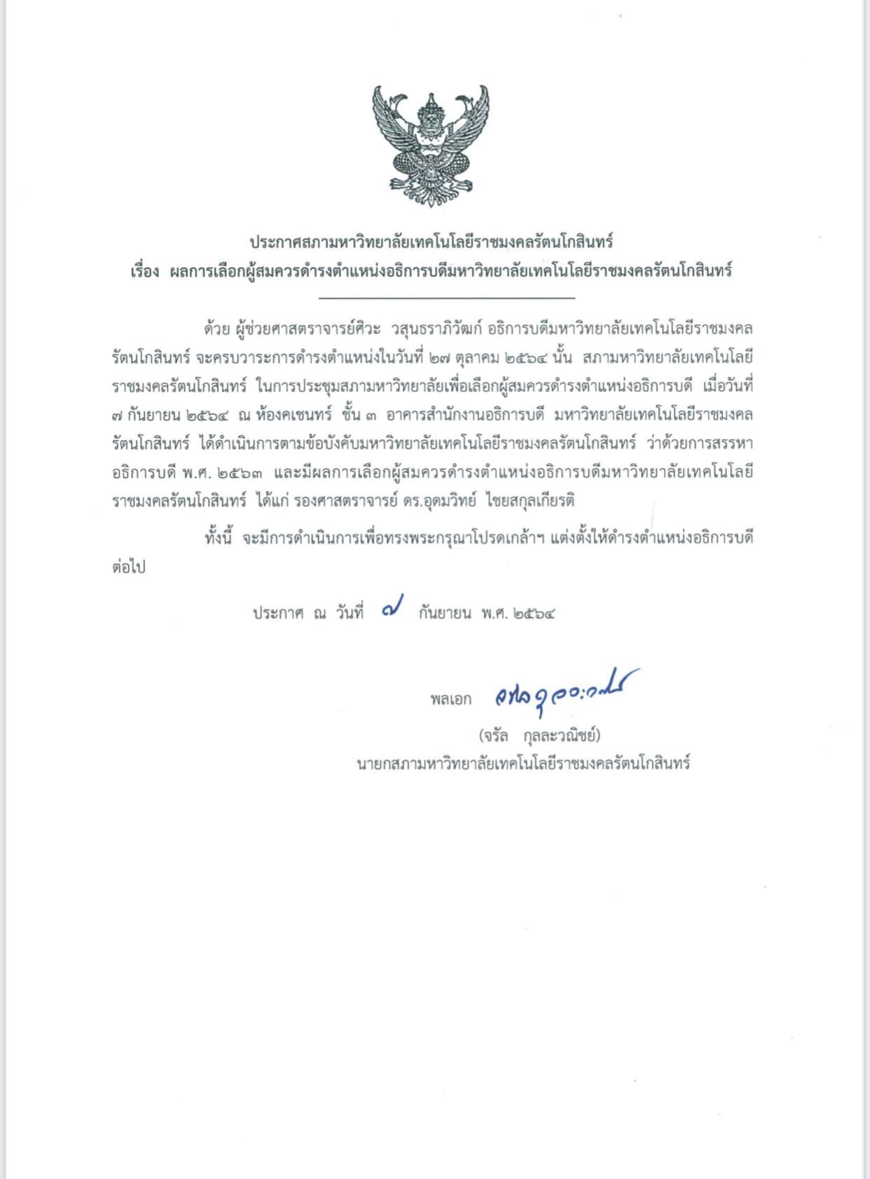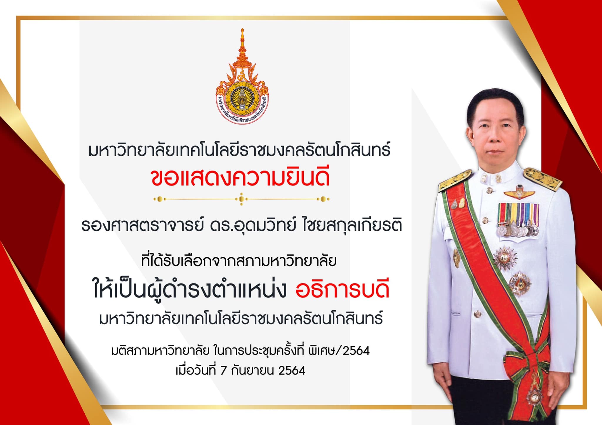 คณะผู้บริหาร www.TCNEWSSTATION.COM ขอแสดงความยินดี กับ รองศาสตราจารย์ ดร.อุดมวิทย์ ไชยสกุลเกียรติ ที่ได้รับเลือกจากมติสภามหาวิทยาลัย ให้เป็นผู้สมควรดำรงตำแหน่งอธิการบดีมหาวิทยาลัยเทคโนโลยีราชมงคลรัตนโกสินทร์ ตำบลศาลายา อำเภอพุทธมณฑล จังหวัดนครปฐม ในการสรรหา เมื่อวันที่ 7 กันยายน 2564