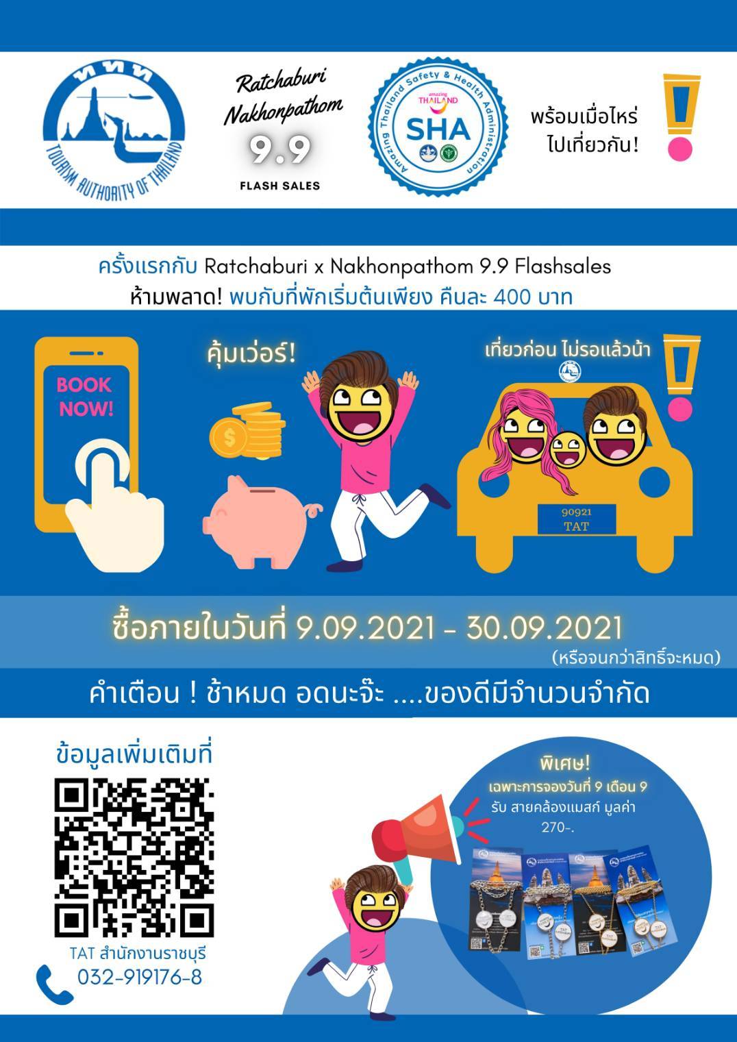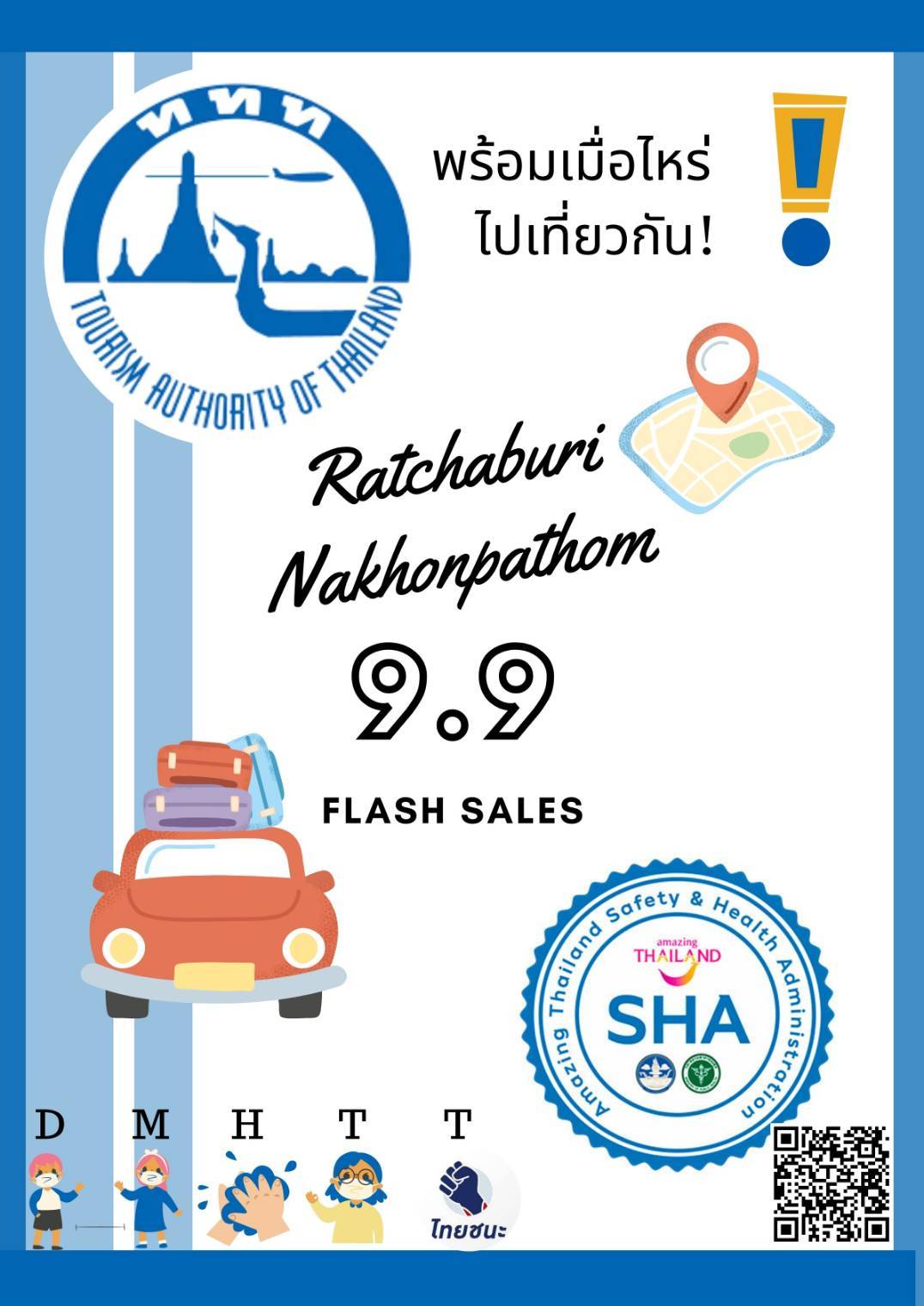 นางสาวสรียา บุญมาก ผู้อำนวยการการท่องเที่ยวแห่งประเทศไทย สำนักงานราชบุรี กล่าวกับผู้สื่อข่าวว่า ขณะนี้สถานการณ์การแพร่ระบาดของเชื้อโรคไวรัสโควิด – 19 เริ่มดีขึ้น และรัฐบาลได้เตรียมแผนการเปิดประเทศเพื่อให้อุตสาหกรรมการท่องเที่ยวของไทยกลับมาฟื้นตัวอีกครั้ง แต่เนื่องจากชาวไทยส่วนใหญ่ยังคงมีความกังวลเกี่ยวกับความปลอดภัยในการเดินทางท่องเที่ยวยังต่างจังหวัด ดังนั้น ททท. สำนักงานราชบุรี จึงได้ร่วมกับผู้ประกอบการที่พักที่ได้รับมาตรฐานความปลอดภัยด้านสุขอนามัย (Amazing Thailand Safety and Health Administration – SHA) ในพื้นที่จังหวัดราชบุรีและจังหวัดนครปฐม จัดกิจกรรมส่งเสริมการขายห้องพักล่วงหน้า ในลักษณะของการซื้อก่อนแล้วไปเที่ยวภายหลังเมื่อพร้อม “Ratchaburi & Nakhonpathom 9.9 Flash Sales” โดยมีสถานประกอบการที่พักประเภทโรงแรม รีสอร์ท โฮมสเตย์ ทั้งขนาดเล็กและขนาดใหญ่ที่มีความพร้อมของทั้งสองจังหวัดเข้าร่วมขาย จำนวน 23 แห่ง ประกอบด้วย