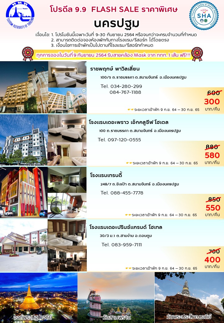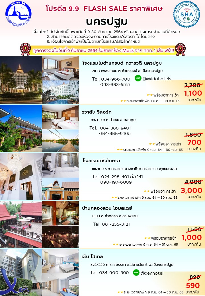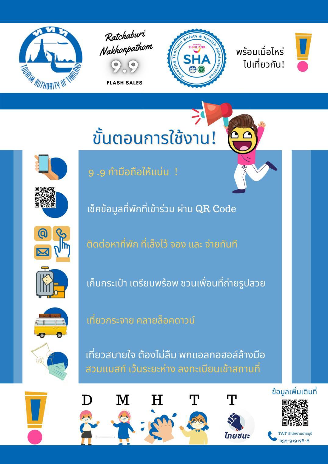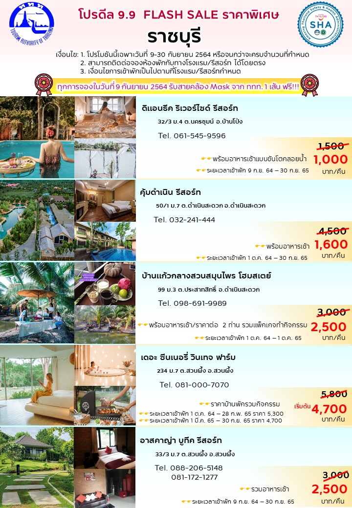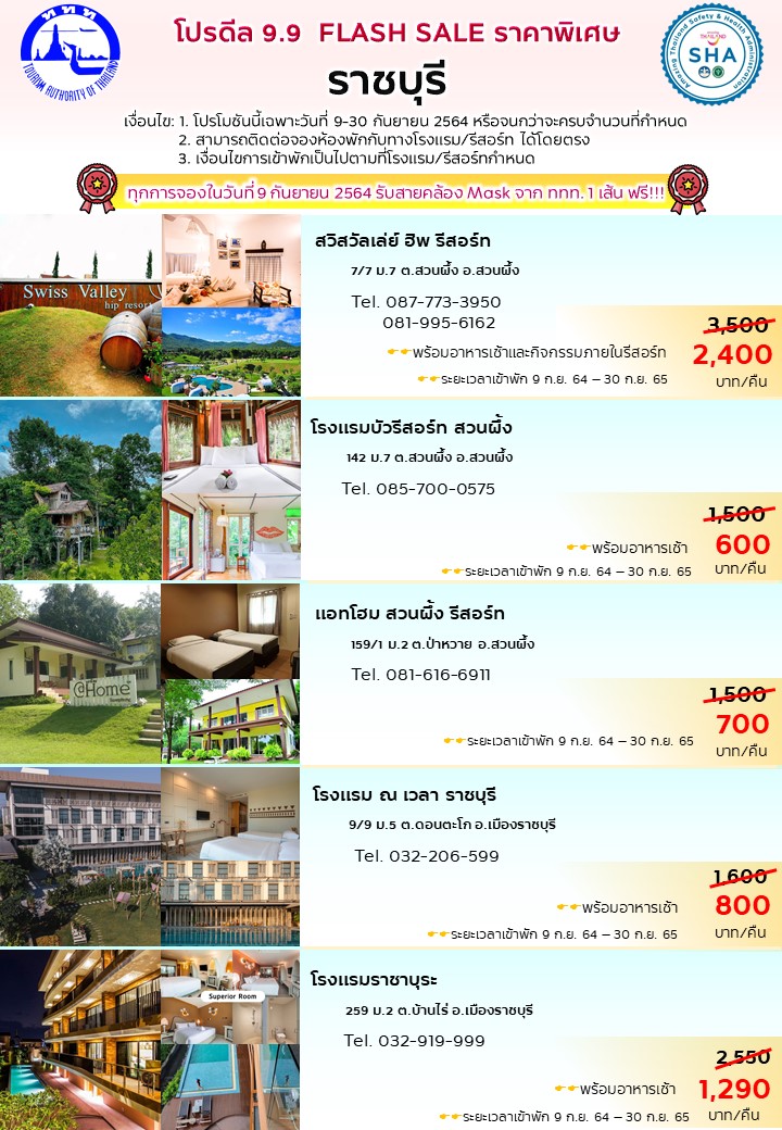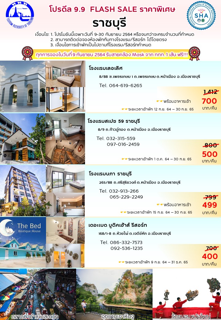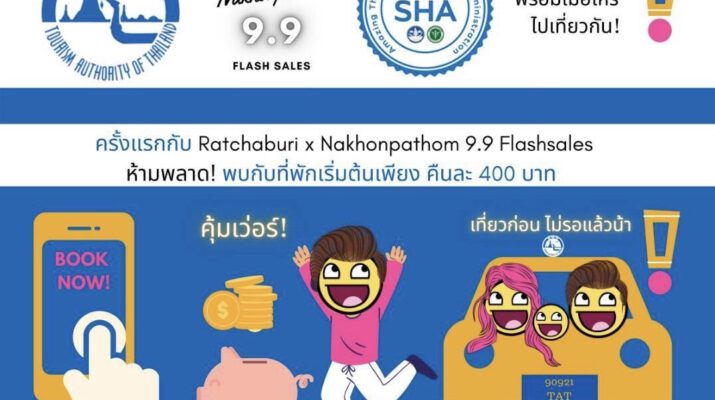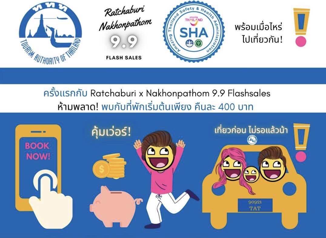 ททท. สำนักงานราชบุรี ร่วมกับสถานประกอบการที่พักที่ได้รับมาตรฐาน SHA ในพื้นที่จังหวัดราชบุรีและจังหวัดนครปฐม จัดกิจกรรมส่งเสริมการขาย ซื้อไว้ก่อนไปนอนทีหลัง “Ratchaburi & Nakhonpathom 9.9 Flash Sales” ระหว่างวันที่ 9 – 30 กันยายน 2564