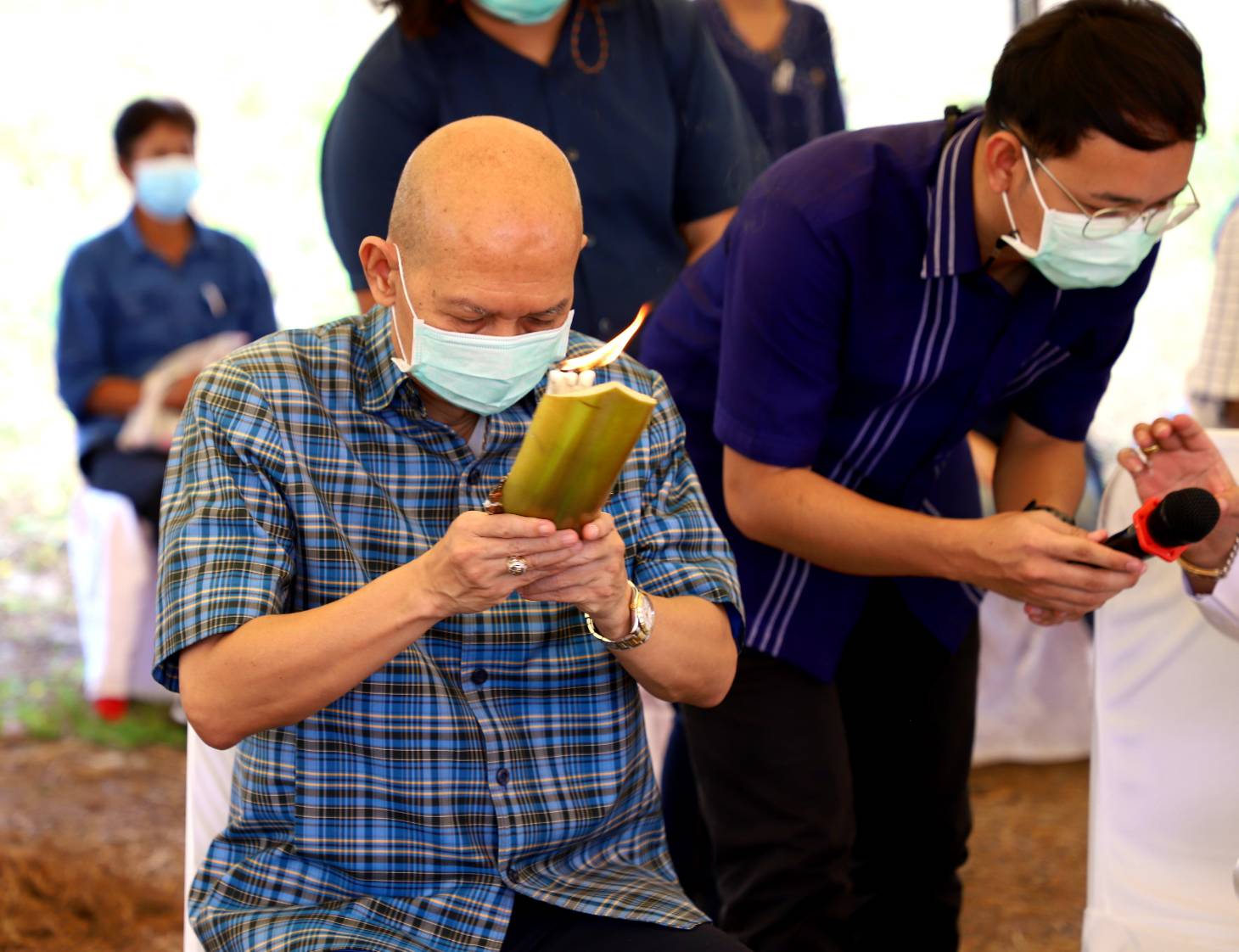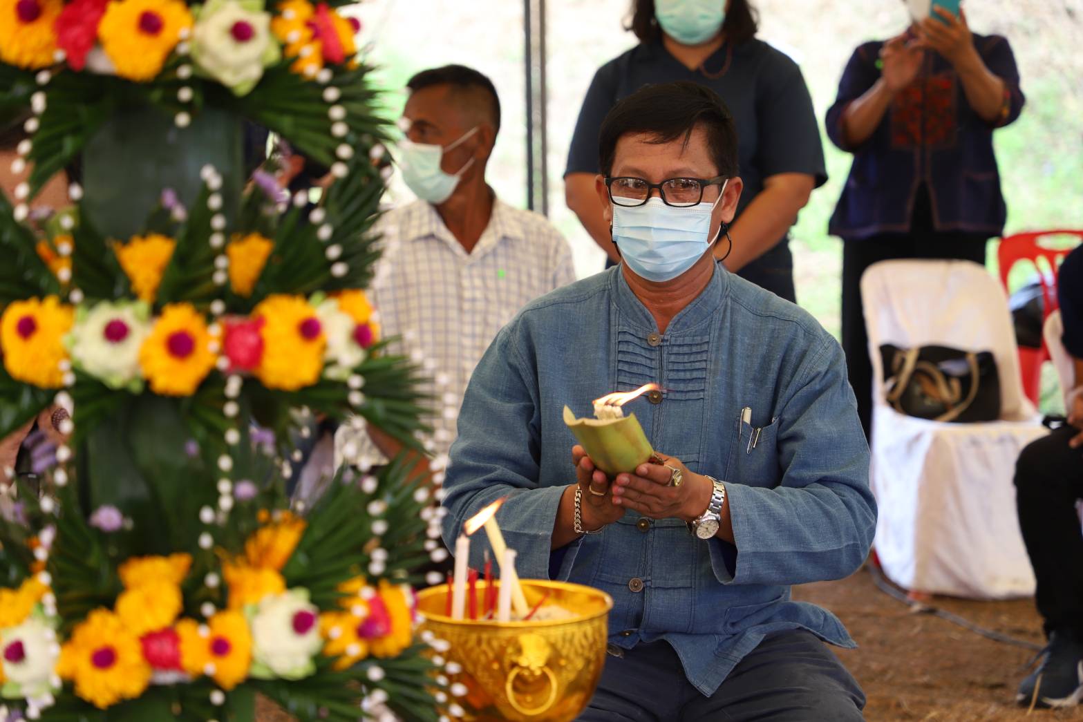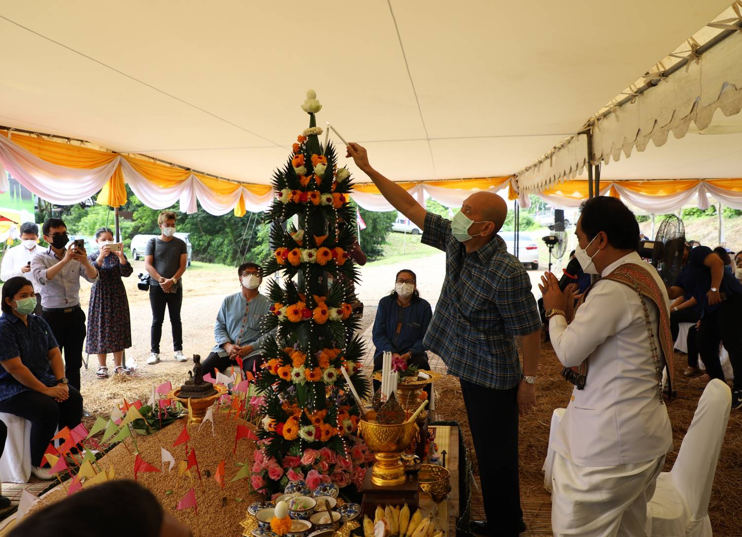 นายไพฑูรย์ รื่นสุข กล่าวว่า โครงการส่งเสริมการดำเนินงานตามหลักปรัชญาเศรษฐกิจพอเพียง และขยายผลโครงการอันเนื่องมาจากพระราชดำริ เพื่อพัฒนาการผลิตข้าวในพื้นที่แปลงนาทุ่งมะขามหย่อง ได้ดำเนินการจัดทำแปลงสาธิตการผลิตเมล็ดพันธุ์ข้าว พันธุ์ กข43 โดยเริ่มปลูกข้าวเมื่อวันที่ 1 มิถุนายน 2564 และได้นำเทคโนโลยีมาใช้ควบคู่กับการจัดการศัตรูพืชแบบผสมผสานตลอดฤดูกาลผลิต ขณะนี้ข้าวในแปลงนา มีอายุครบ 97 วัน ซึ่งเป็นระยะที่เหมาะสมต่อการเก็บเกี่ยวข้าว จึงได้ดำเนินการจัดงาน “สืบสานคุณค่า วิถีชาวนาไทย” ระหว่างวันที่ 8 – 9 กันยายน 2564 สำหรับกิจกรรมในวันนี้จะนำผลผลิตจากการเก็บเกี่ยวข้าวส่วนหนึ่งจากเมื่อวานนำมาใช้ในพิธีรับขวัญพระแม่โพสพ ซึ่งผลผลิตข้าวในปีนี้มีคุณภาพดี แต่มีฝนทำให้ไม่เหมาะที่นำไปปรับปรุงเป็นพันธุ์ข้าว จึงจะนำข้าวที่เก็บเกี่ยวในครั้งนี้ไปขายและนำรายได้ขึ้นทูลเกล้าฯ ถวายแด่สมเด็จพระกนิษฐาธิราชเจ้า กรมสมเด็จพระเทพรัตนราชสุดาฯ สยามบรมราชกุมารี ต่อไป