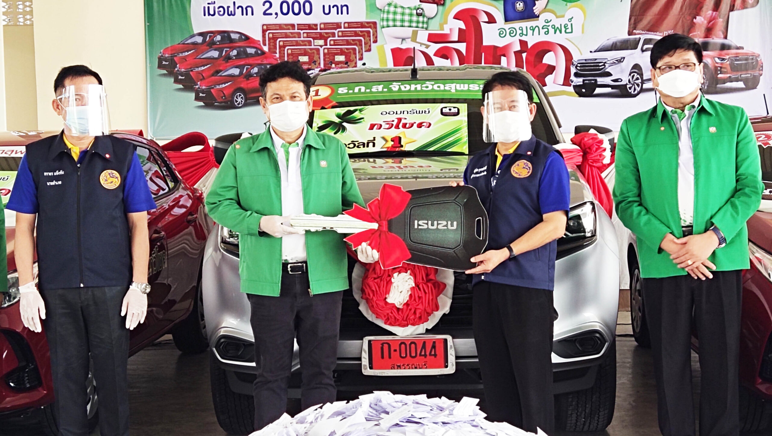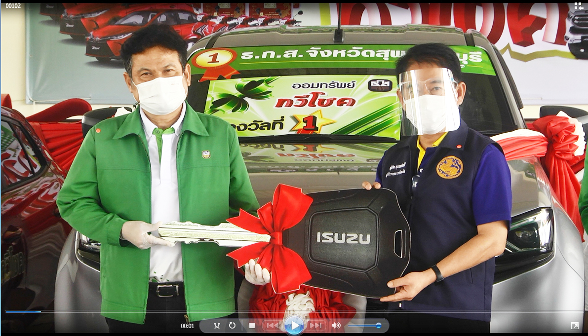 โดยรางวัลที่ 1 เป็นรถยนต์ 7 ที่นั่ง 1 คันมูลค่ากว่า 1 ล้านบาท รางวัลที่ 2 จำนวน 3 รางวัล เป็นรถยนต์เก๋ง 3 คัน รางวัลที่ 3 รถจักรยานยนต์ 13 รางวัล รางวัลที่ 4 ทองคำแท่ง น้ำหนัก 1 สลึง 680 รางวัล รวม 697 รางวัล รวมมูลค่าของรางวัล 7,983,260 บาท (เจ็ดล้าน เก้าแสน แปดหมื่น สองร้อย หกสิบ บาทถ้วน) สำหรับผู้โชคดีได้รับรางวัลที่ 1 ได้รถยนต์ 7 ที่นั่ง ได้แก่นายเอี่ยม-นางสาวศิร์พิชชา น้อยสุริวงษ์ ลูกค้า ธ.ก.ส.สาขาเดิมบางนางบวช รางวัลที่ 2 มี 3 รางวัล 1.นางสาวชนัดดา ธิติมาธัญญา ลูกค้าสาขาสองพี่น้อง 2.นายธีรวุฒิ ตั้งสัมพันธ์ ลูกค้าสาขาเดิมบางนางบวช และ 3.นางนัยนา มะนาวหวาน ลูกค้าสาขาเดิมบางนางบวช