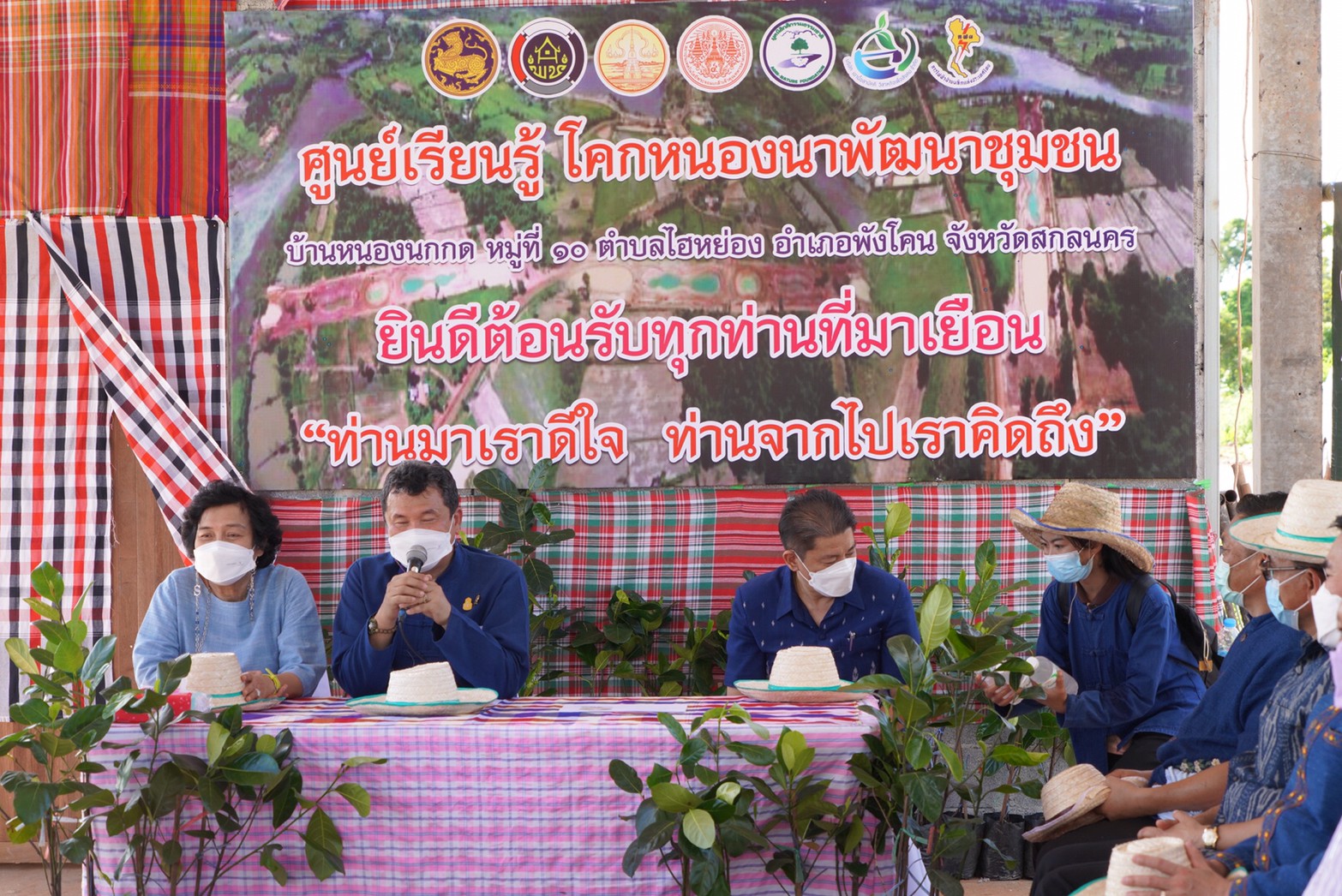 นายสุทธิพงษ์ จุลเจริญ อธิบดีกรมการพัฒนาชุมชน กล่าวว่า ขอขอบคุณ ผู้ว่าราชการจังหวัดสกลนคร รองผู้ว่าราชการจังหวัดสกลนคร นายอำเภอพังโคน นายกอบจ.สกลนคร และพี่น้องครัวเรือนบ้านหนองนกกดทุกท่านที่ได้ร่วมมือในการขับเคลื่อนงานโครงการฯ อย่างเต็มที่ในการสร้างพื้นที่ให้เป็นแหล่งเรียนรู้ เพื่อสร้างความมั่นคงในชีวิต บรรเทาความเดือดร้อนให้แก่คนในชุมชน โดยเฉพาะในช่วงวิกฤตการแพร่ระบาดของโรคติดเชื้อไวรัสโคโรนา 2019 โครงการพัฒนาพื้นที่ต้นแบบการพัฒนาคุณภาพชีวิตตามหลักทฤษฎีใหม่ประยุกต์สู่ “โคก หนอง นา” จะทำให้ระบบนิเวศดีขึ้น ทำให้มีแหล่งพื้นที่จัดเก็บน้ำฝนได้หลายล้านลูกบาศก์ มีความมั่นคงทางอาหาร พอกิน พอใช้ พออยู่ พอร่มเย็น รวมถึงยังเป็นแหล่งเพาะพันธุ์พืชผักสวนครัว และพืชสมุนไพรอีกมากมาย หากน้อมนำเอาหลักการปรัชญาของเศรษฐกิจพอเพียงและทฤษฎีใหม่มาประยุกต์ใช้ตามแนวทางของพระบาทสมเด็จพระบรมชนกาธิเบศร มหาภูมิพลอดุลยเดชมหาราช บรมนาถบพิตร