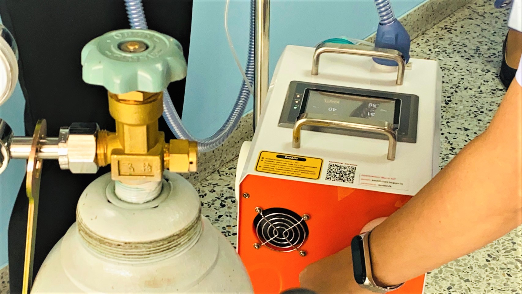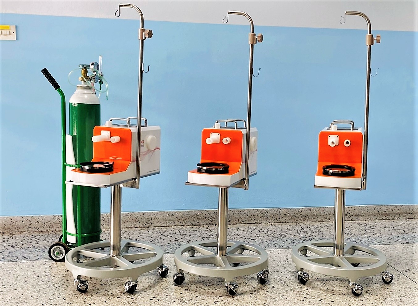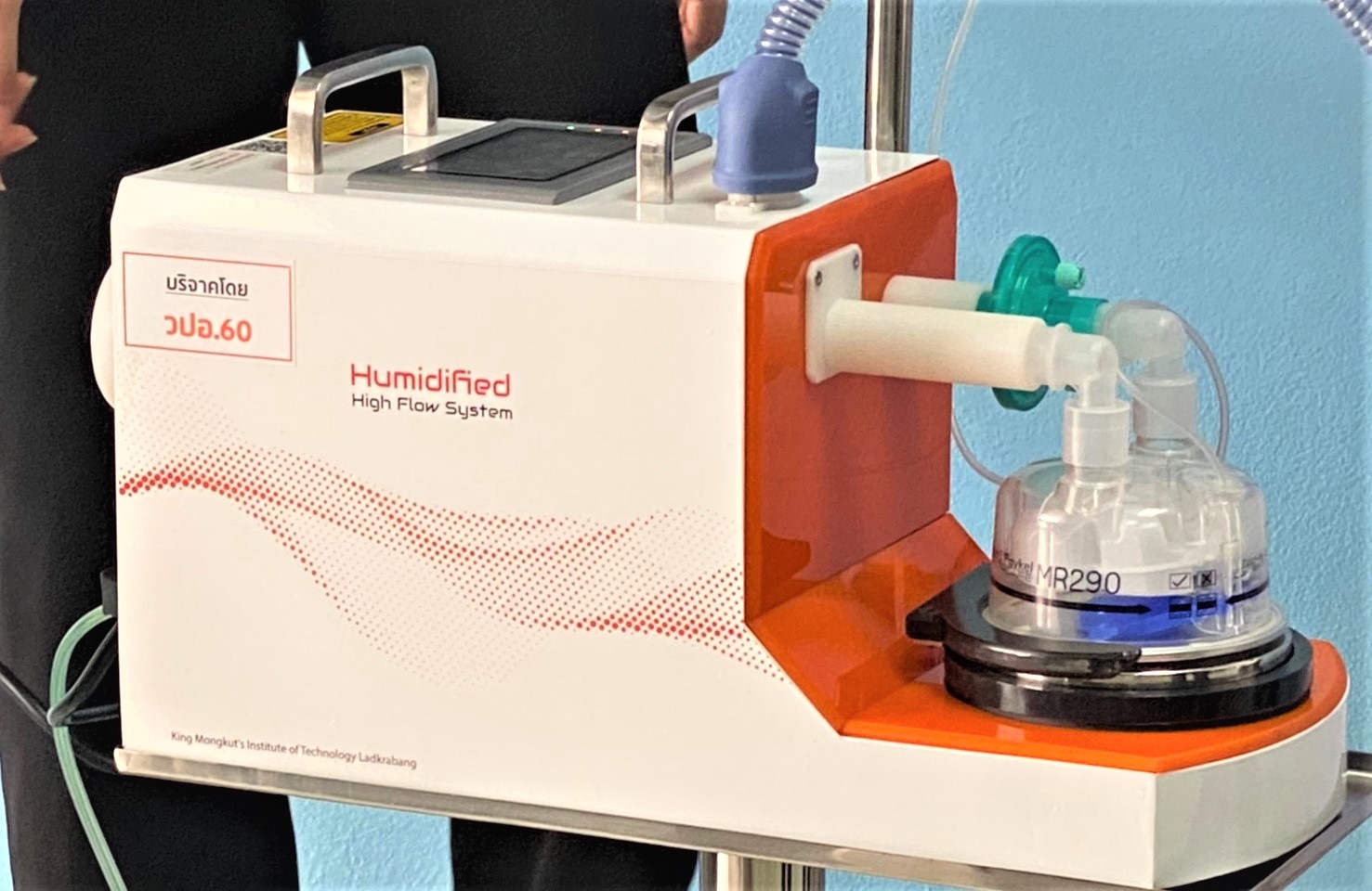 สำหรับเครื่องจ่ายออกซิเจน KMITL High flow ออกแบบและพัฒนาขึ้นโดย คณะวิศวกรรมศาสตร์ สถาบันเทคโนโลยี พระจอมเกล้าเจ้าคุณทหารลาดกระบัง (สจล.) ซึ่งได้คิดค้นและพัฒนาต้นแบบ “เครื่องจ่ายออกซิเจน KMITL High Flow” เป็นเครื่องจ่ายออกซิเจนในอัตราการไหลสูงเป็นครั้งแรก ที่มาพร้อมระบบมอนิเตอร์ทางไกลระบบการแสดงผลที่สามารถปรับการตั้งค่าต่างๆ ผ่านแอพลิเคชั่น เพื่อลดการสัมผัสระหว่างบุคลากรทางการแพทย์และผู้ป่วยผ่านระบบติดตามระยะไกล เพื่อต่อลมหายใจ ช่วยคนไทยพ้นภัยโควิด-19
