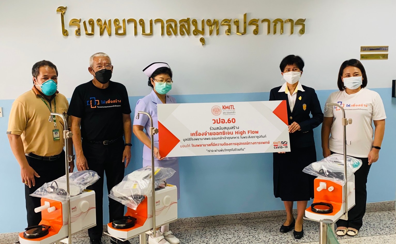 โดยมี นฤมล ล้อมทอง รองประธานนักศึกษา วปอ.60 เป็นผู้แทนมอบเครื่องจ่ายออกซิเจน พร้อมด้วย บรรณสาร จันทร์สมศักดิ์ กรรมการและผู้จัดการมูลนิธิโรงพยาบาลพระจอมเกล้าเจ้าคุณทหาร และผศ.ดร.รัชนี กุลยานนท์ รองอธิการบดีฝ่ายวิจัยและนวัตกรรม สถาบันเทคโนโลยีพระจอมเกล้าเจ้าคุณทหารลาดกระบัง(สจล.) ร่วมในการส่งมอบนวัตกรรม KMITL High Flow เพื่อเป็นประโยชน์แก่โรงพยาบาลต่อไป