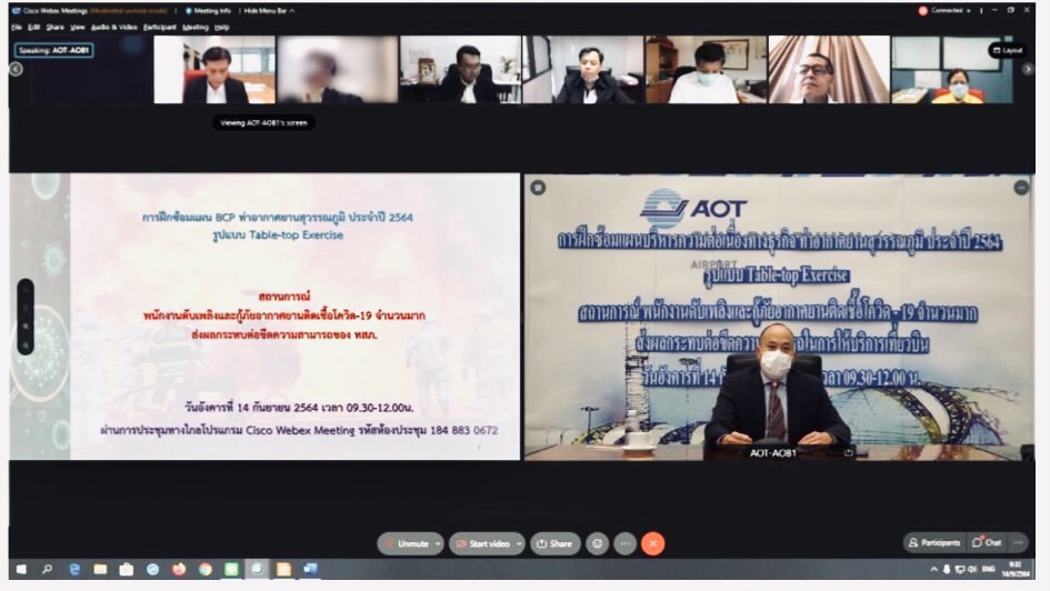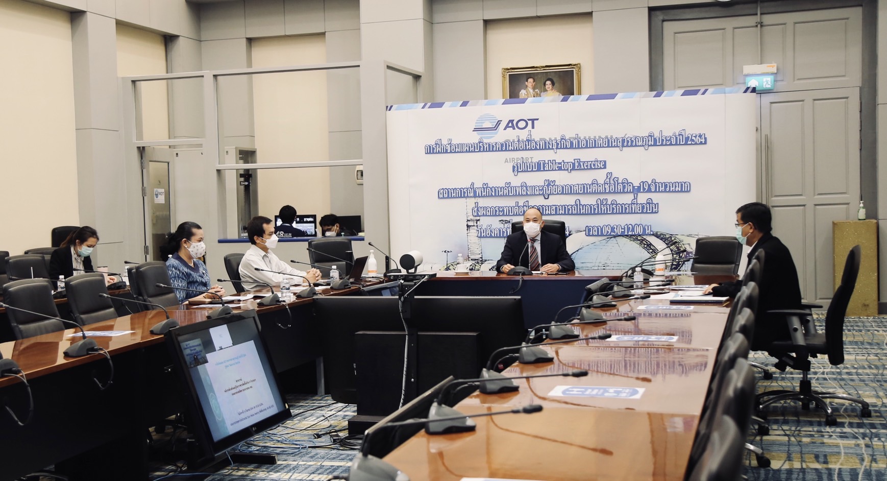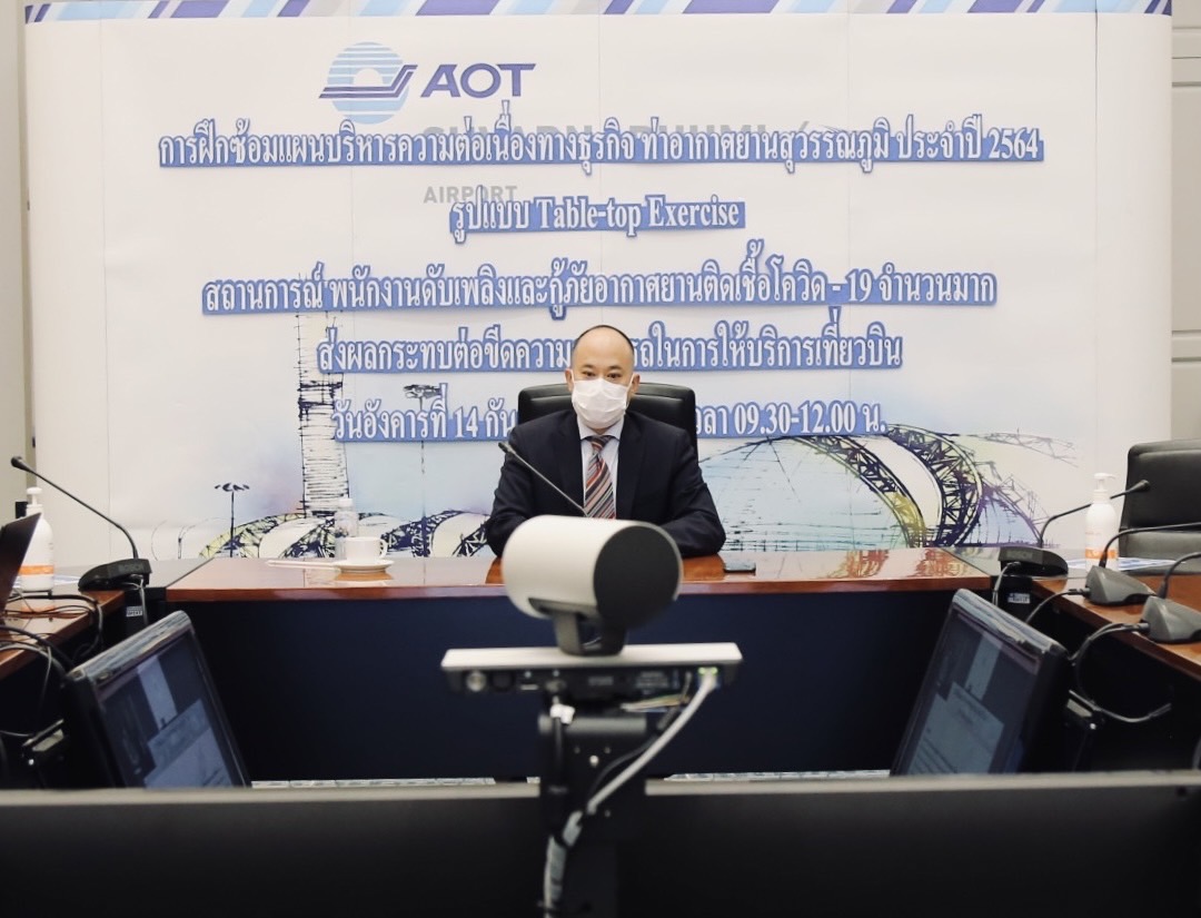 บริษัท ท่าอากาศยานไทย จำกัด (มหาชน) (ทอท.) เป็นประธานจัดการฝึกซ้อมแผนบริหารความต่อเนื่องทางธุรกิจ (Business Continuity Plan : BCP) ประจำปี 2564 เปิดเผยว่าเนื่องจากในปัจจุบันประเทศไทยอยู่ภายใต้การแพร่ระบาดของโรคติดเชื้อไวรัสโคโรนา 2019(COVID-19) ส่งผลให้ท่าอากาศยานสุวรรณภูมิ (ทสภ.) ต้องจัดการฝึกซ้อมในรูปแบบบนโต๊ะสถานการณ์จำลอง (Table-top Exercise) โดยประชุมทางไกลผ่านระบบ Video Conference ซึ่งมีวัตถุประสงค์เพื่อให้หน่วยงานทั้งภายในและภายนอกที่เป็นคณะทำงานได้เข้าใจบทบาทหน้าที่ ความรับผิดชอบตามที่กำหนดไว้ในแผน BCP และสามารถนำไปปฏิบัติได้อย่างมีประสิทธิภาพ การฝึกซ้อมได้กำหนดสถานการณ์จำลอง กรณี พนักงานดับเพลิงและกู้ภัยอากาศยาน ทสภ. ติดเชื้อไวรัสโคโรนา 2019(COVID-19) เป็นจำนวนมาก ส่งผลกระทบให้ต้องลดขีดความสามารถในการให้บริการอากาศยานลง เนื่องจากไม่สามารถรักษาระดับการป้องกันด้านดับเพลิงและกู้ภัย (Level of protection) ที่เพียงพอได้ตามมาตรฐานที่กำหนดไว้ของการดับเพลิงและกู้ภัยสนามบิน (Aerodrome category for rescue and fire fighting)