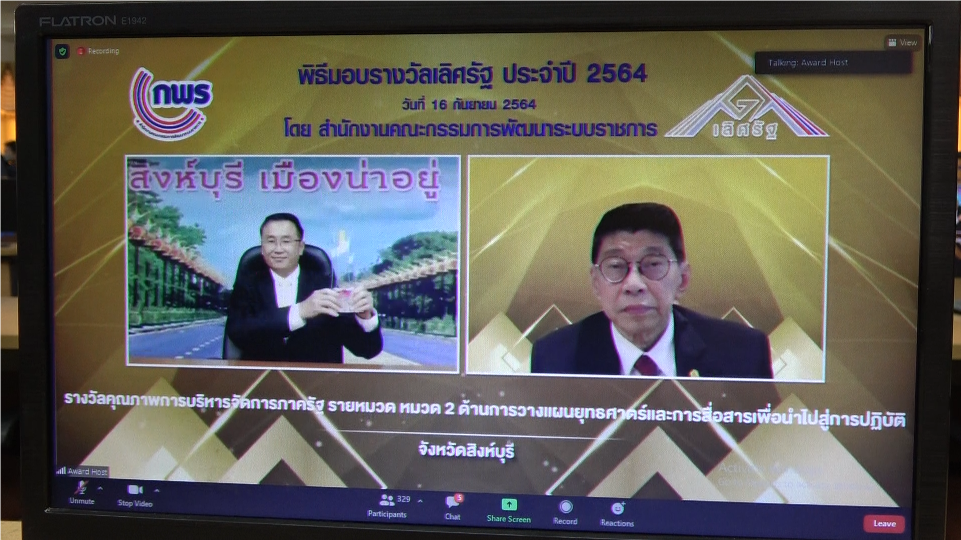 ผู้ว่าราชการจังหวัดสิงห์บุรี รับมอบรางวัลเลิศรัฐ ด้านการวางแผนยุทธศาตร์และการสื่อสารเพื่อนำไปสู่การปฏิบัติ ปี 2564