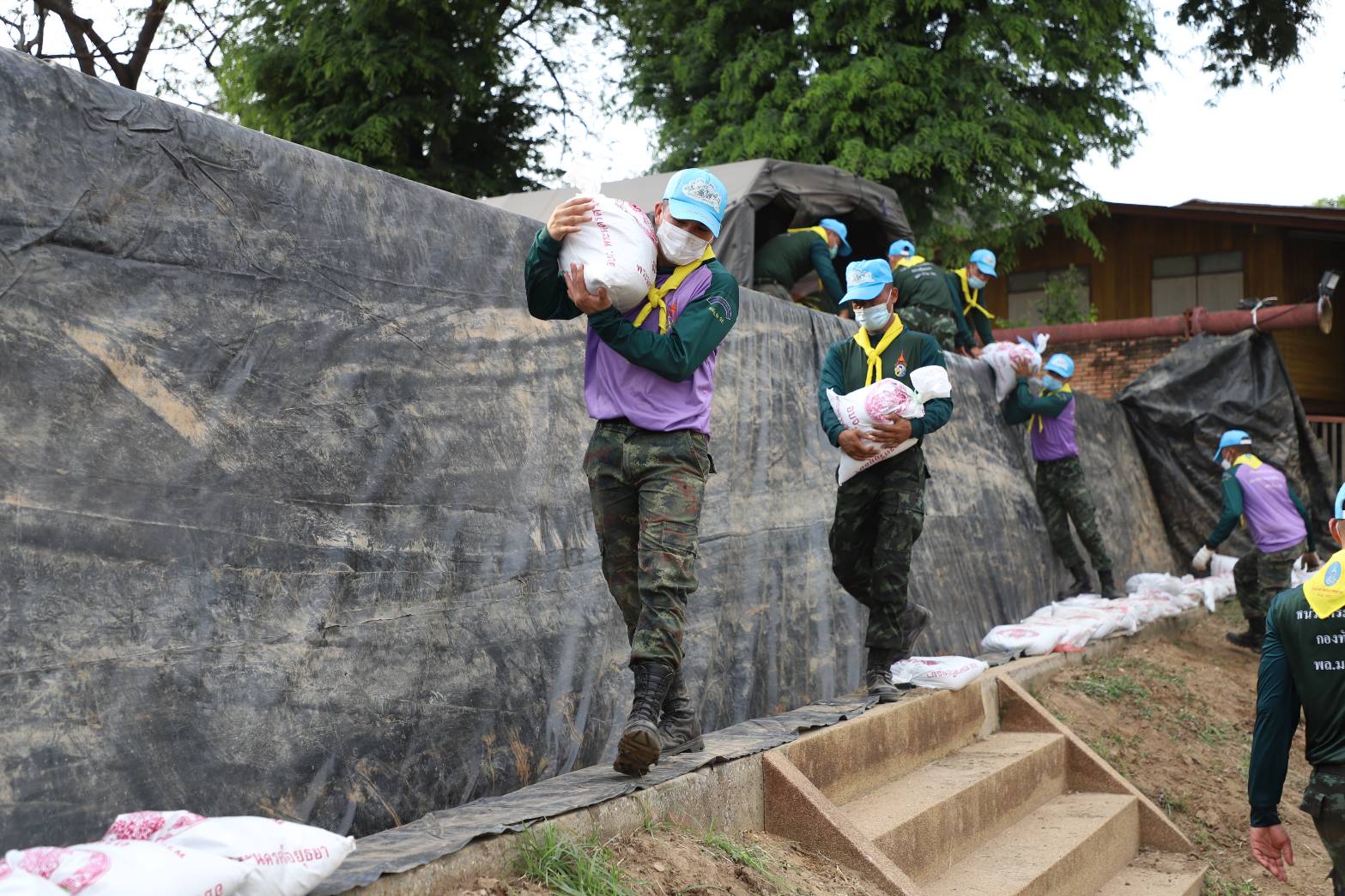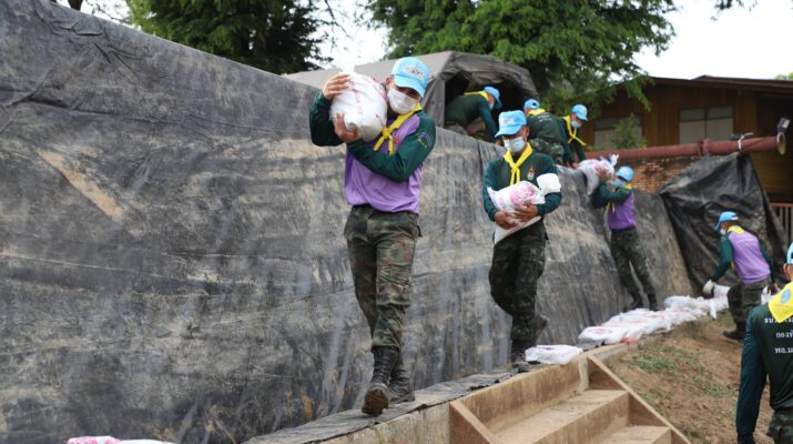 อยุธยา กอ.รมน.ร่วมกับ มทบ.18 นำกำลังพลกรอกกระสอบทรายปิดบังเกอร์ เตรียมป้องกันน้ำวัดไชยวัฒนาราม ระดับน้ำมีแนวโน้มลดลง