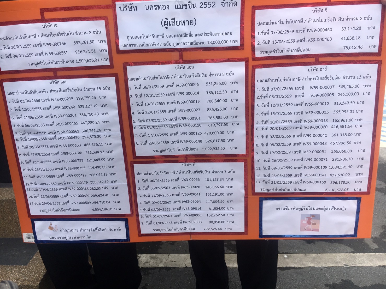 *****จากการตรวจสอบบริษัทถูกขบวนการขายใบกำกับภาษีปลอมดังกล่าวแอบอ้างไปยื่นกรมสรรพากร มากว่า 5 ปี แล้วสร้างความเสียหายอย่างหนัก โดยบริษัทได้มีการล่อซื้อใบกำกับภาษีปลอมจากช่องทางไลน์ และนำหลักฐานไปยื่นหลายหน่วยงานซึ่งก่อนหน้านี้ตนเคยเข้าแจ้งความตำรวจ สน.พลับพลาไชย เมื่อปี 2559 แต่คดีไม่มีความคืบหน้า และเมื่อเดือน เมษายน 2564 ได้เข้าแจ้งกองบังคับการปราบปราม แต่ก็ไม่มีดำเนินการเช่นกัน จึงไปที่ ปอท. ช่วยตรวจสอบเอาผิดขบวนการกันโกงภาษี ทั้งหมดมาดำเนินคดีตามกฎหมาย และในวันนี้จึงได้รวบรวมหลักฐานเข้าแจ้งความร้องทุกข์กับพนักงานสอบสวน สภ.สำโรงเหนือเพื่อให้สอบสวนดำเนินคดีแก่ผู้รวมกระบวนการ เนื่องจากสืบทราบมาว่าบริษัทที่ร่วมกระทำผิดอยู่ในพื้นที่สำโรงเหนือ จังหวัดสมุทรปราการ
