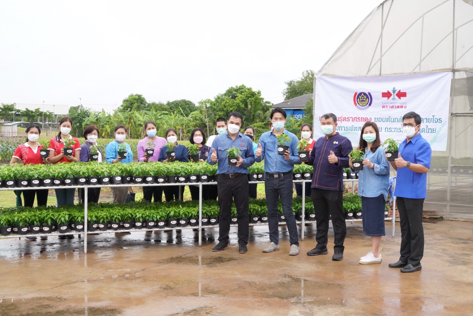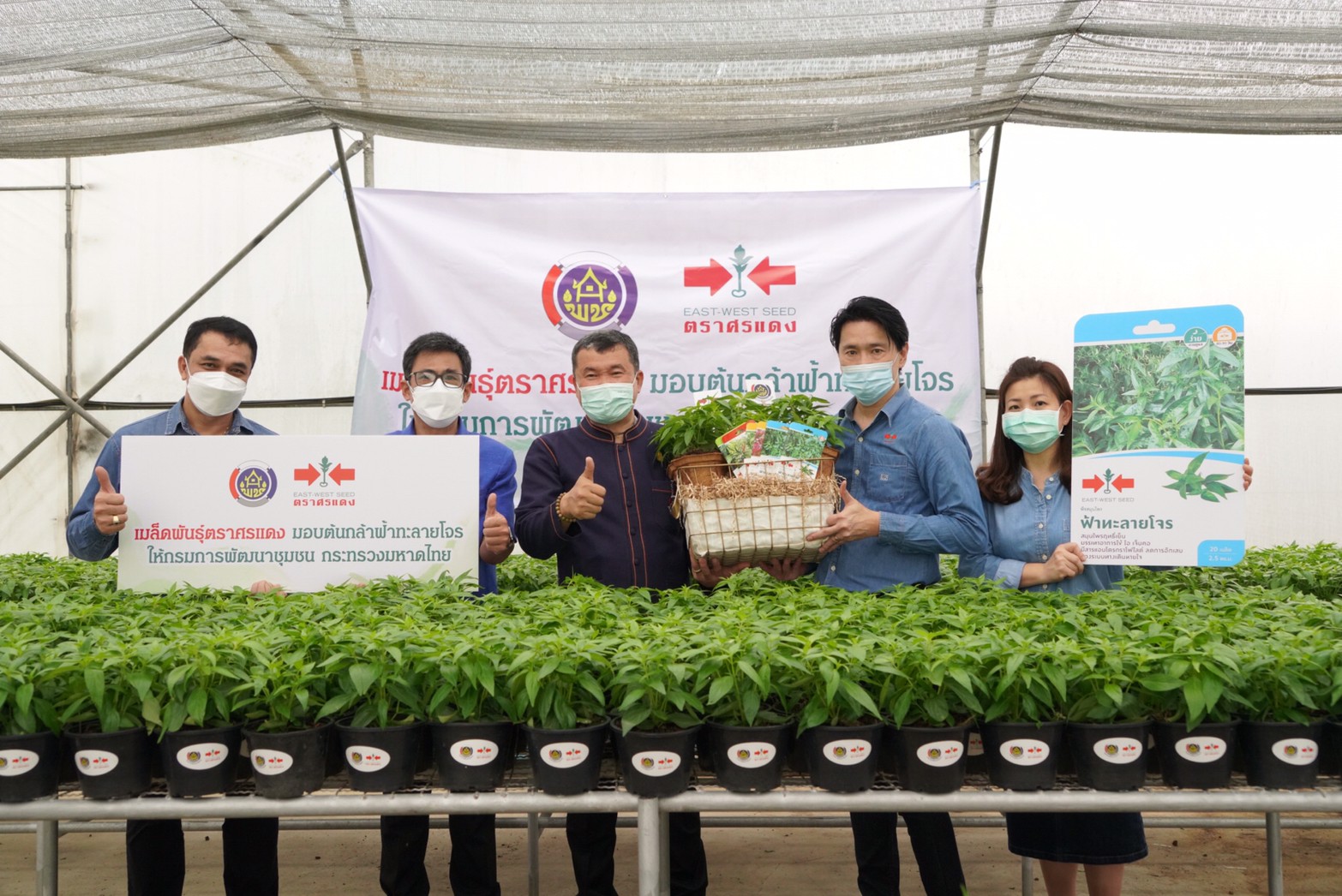 สุดท้ายนี้ กรมการพัฒนาชุมชน กระทรวงมหาดไทย จะเป็นตัวแทนส่งมอบต้นกล้าฟ้าทะลายโจรจำนวน 4,000 ต้น ให้พี่น้องคนไทยทั่วประเทศ และส่งเสริมการขยายพันธุ์ และส่งเสริมอนุรักษ์พันธุกรรมพืชต่อไป จะเห็นได้ว่าประเทศชาติจะอยู่รอดได้ ถ้าทุกคนไม่ทอดทิ้งกัน อย่างเช่นบริษัท อีสท์ เวสท์ ซีด จํากัด (เมล็ดพันธุ์ตราศรแดง) และเราจะเป็นภาคีเครือข่ายที่ดี เพื่อช่วยเหลือพี่น้องประชาชนให้รอดพ้นจากวิกฤตในครั้งนี้ได้อย่างแน่นอน ทำให้สังคมเป็นสังคมแห่งความรัก ความสามัคคี เอื้อเฟื้อเผื่อแผ่ ซึ่งพืชผักที่ปลูกจะสามารถช่วยบรรเทาความเดือดร้อน อย่างน้อยช่วยลดค่าใช้จ่ายในครัวเรือน มีผักกินเองในบ้านโดยที่ไม่ต้องซื้อหาจากข้างนอก ปลูกผักที่กิน กินผักที่ปลูก ประหยัดรายจ่าย เท่ากับเพิ่มรายได้ ทำให้เศรษฐกิจฐานรากของประเทศเกิดความมั่นคง มีความเข้มแข็ง อย่างยั่งยืนต่อไป และขอเชิญชวนทุกท่านร่วมสมัครเป็นสมาชิก Fanpage Facebook “ปลูกพืช ปลูกผัก ปลูกรักกับ พช” ด้วยการกด Like กด Share เพื่อเป็นช่องทางให้เกิดการแลกเปลี่ยนเรียนรู้ สร้างแรงบันดาลใจร่วมกัน พร้อมเป็นการสร้างวัฒนธรรมการพึ่งพาตนเอง ด้วยการปลูกพืชผักสวนครัวและพืชสมุนไพรไว้บริโภคเองในครัวเรือน จนเป็นอุปนิสัยเพื่อสร้างความมั่นคงทางอาหาร เป็นต้นแบบให้กับพี่น้องประชาชนทั่วโลกได้ชื่นชมต่อไป อธิบดี พช. กล่าวปิดท้าย