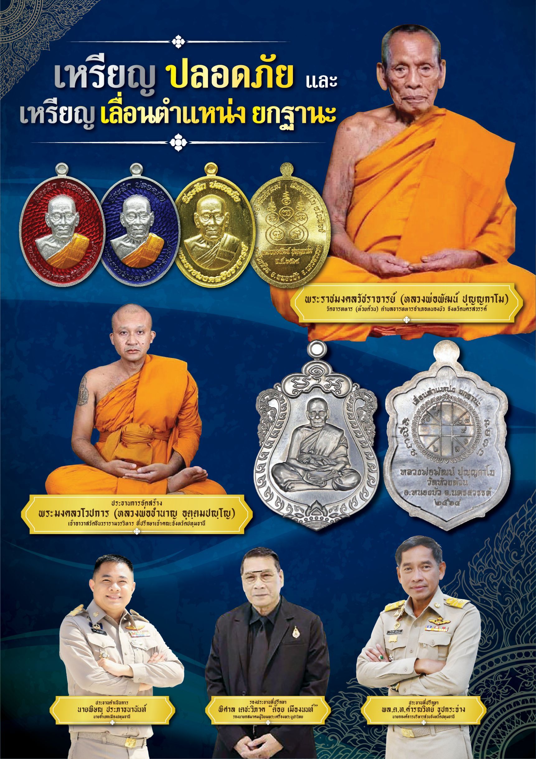 รายละเอียดในการจัดสร้างเหรียญหลวงพ่อพัฒน์ รุ่นเลื่อนตำแหน่ง ยกฐานะ และรุ่น ปลอดภัย 2 รุ่นนี้ประกอบด้วย เนื้อทองคำหนัก 25 กรัม จัดสร้างตามสั่งจอง เหรียญละ 59,999 บาท เหรียญรวมเนื้อ 9 ชนิด ชุดใหญ่(100เหรียญ) จัดสร้าง 299 ชุด ชุดละ 22,000 บาท เหรียญรวมเนื้อ 9 ชนิด ชุดกลาง(9เหรียญ)จัดสร้าง 99ชุด ชุดละ3,999 บาท เหรียญรวมเนื้อ 9 ชนิด ชุดเล็ก(7เหรียญ) จัดสร้าง 99ชุด ชุดละ 2,999 บาท เหรียญรวมเนื้อ9ชนิด ประกอบด้วย 1.เนื้อเงินลงยา 2.เนื้อเงิน 3.เนื้อนวะลงยา 4.เนื้ออัลปาก้าลงยา 5.เนื้อทองแดงลงยา 6.เนื้อทองเหลืองลงยา 7.เนื้อสัตตะลงยา 8.เนื้อซาติน 9.เนื้อทองเหลืองผิวรุ้ง โดยเหรียญทั้งหมดนี้ ปลุกเสกและนั่งอธิฐานจิต โดยหลวงพ่อพัฒน์ ปุญญกาโม และหลวงพ่อชำนาญ อุตฺตมปญฺโญ