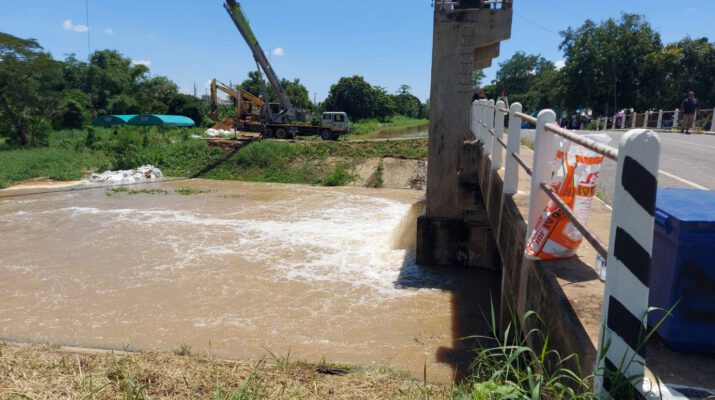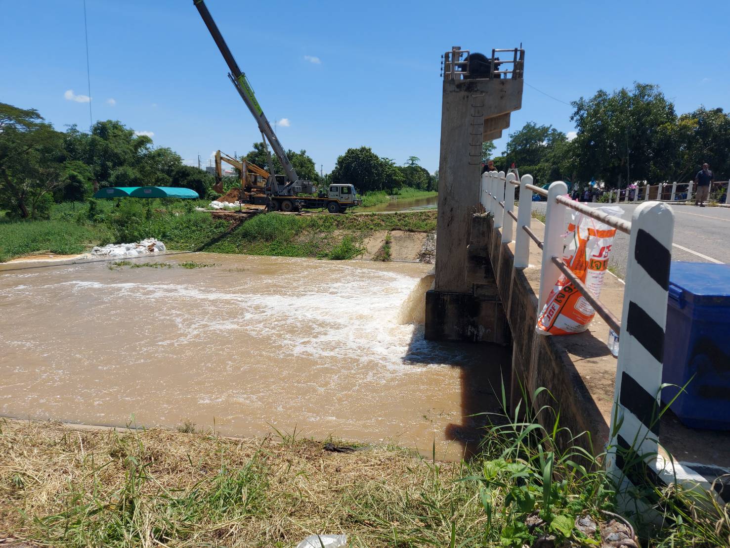 กำลังพลจากหน่วยบัญชาการสงครามพิเศษร่วมกับฝ่ายปกครอง ผู้นำชุมชน เร่งนำถุงบิ๊กแบคบรรจุทราย เสริมทำแนวป้องกันน้ำหน้าประตูระบายน้ำเก้าชั่งที่จะไหลสู่พื้นที่การเกษตร