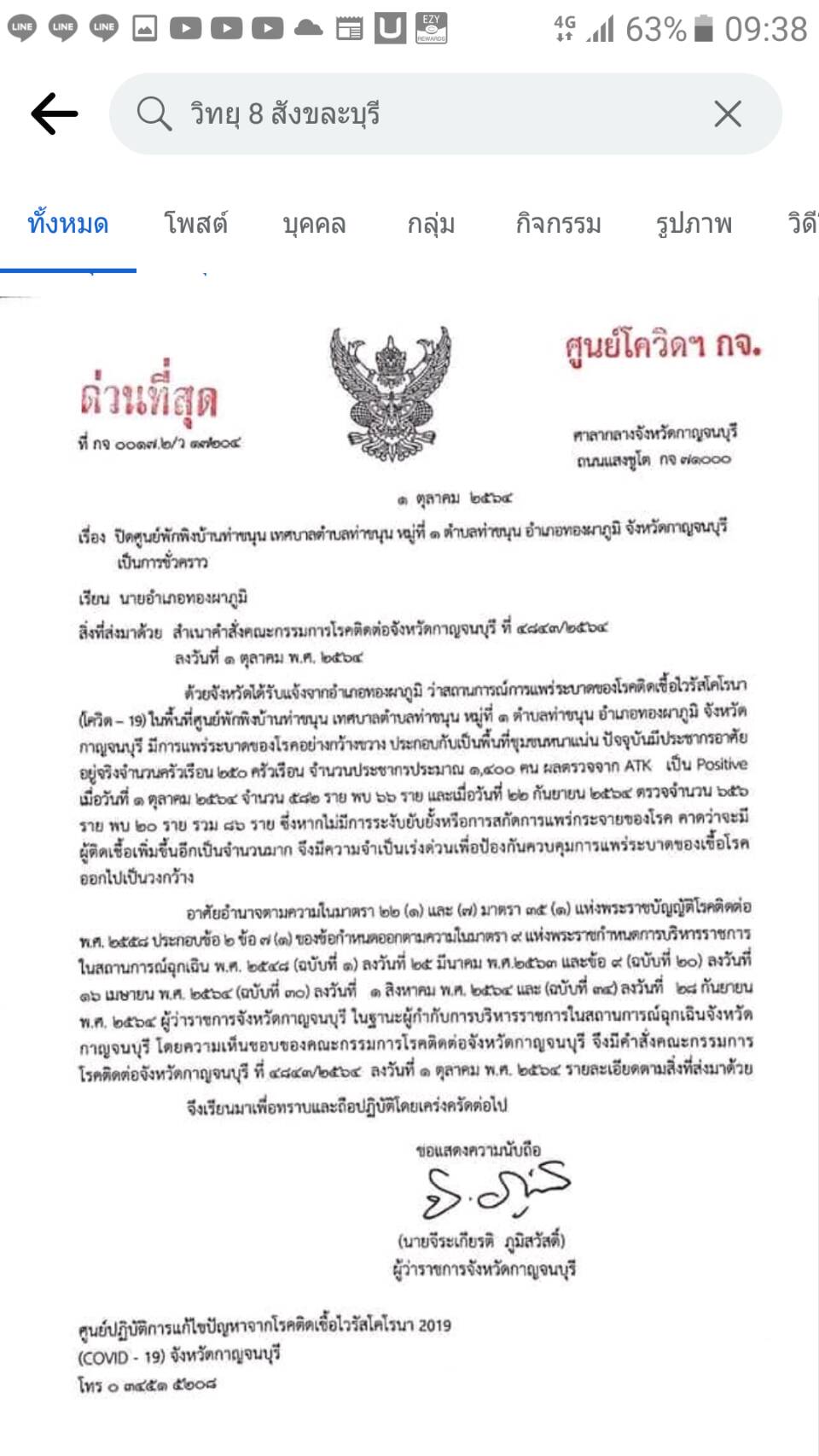 วันที่ 1 ต.ค.64 นายจีระเกียรติ ภูมิสวัสดิ์ ผู้ว่าราชการจังหวัดกาญจนบุรี ประธานคณะกรรมการโรคติดต่อจังหวัดกาญจนบุรี ลงนามในคำสั่งคณะกรรมการโรคติดต่อจังหวัดกาญจนบุรี เรื่อง ปิดศูนย์พักพิงบ้านท่าขนุน เทศบาลตำบลท่าขนุน หมู่ที่ 1 ตำบลท่าขนุน อำเภอทองผาภูมิ จังหวัดกาญจนบุรี เป็นการชั่วคราว เนื่องด้วยสถานการณ์การแพร่ระบาดของโรคติดต่อเชื้อไวรัสโคโรนา (โควิด-19) ในพื้นที่ศูนย์พักพิงบ้านท่าขนุน เทศบาลตำบลท่าขนุน หมู่ที่ 1 ตำบลท่าขนุน อำเภอทองผาภูมิ จังหวัดกาญจนบุรี มีการแพร่ระบาดของโรคอย่างกว้างขวาง ประกอบกับเป็นพื้นที่ชุมชนหนาแน่น ปัจจุบันมีประชากรอาศัยอยู่จริงจำนวนครัวเรือน 250 ครัวเรือน จำนวนประชากรประมาณ 1,400 คน ผลตรวจจาก ATK เป็น Positive เมื่อวันที่ 1 ตุลาคม 2564 จำนวน 582 ราย พบ 66 ราย