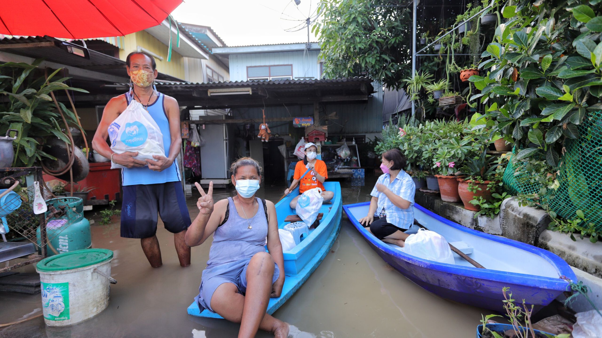 จากนั้นคณะได้ลงพื้นที่ชุมชนริมแม่น้ำเจ้าพระยา หมู่ที่ 5 ตำบลบ้านกลาง อำเภอเมือง จังหวัดปทุมธานี มอบถุงยังชีพ ให้กับประชาชนที่ได้รับผลกระทบภาวะน้ำท่วมขัง เพื่อบรรเทาความเดือดร้อนให้กับประชาชนในเบื้องต้น โดยประชาชนได้พายเรือออกมารับถุงยังชีพ เนื่องจากน้ำแม่น้ำเจ้าพระยาได้เอ่อล้นเข้าท่วมจนไม่สามารถสัญจรไปมาได้