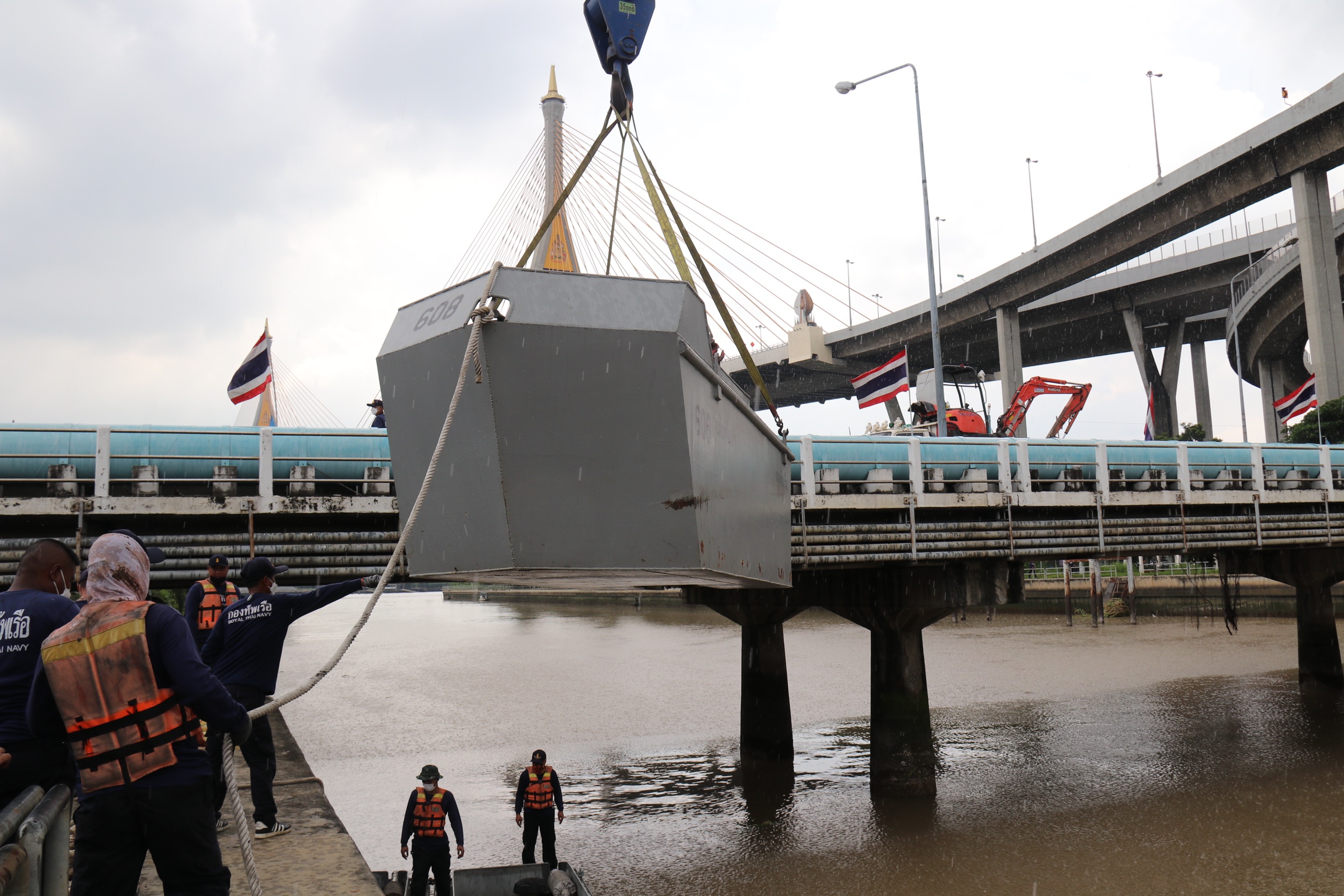 สมุทรปราการ กองทัพเรือ ลำเลียงเรือผลักดันน้ำลงจุดประตูระบายน้ำคลองลัดโพธิ์ เสริมกำลังเร่งระบายน้ำออกสู่ทะเล