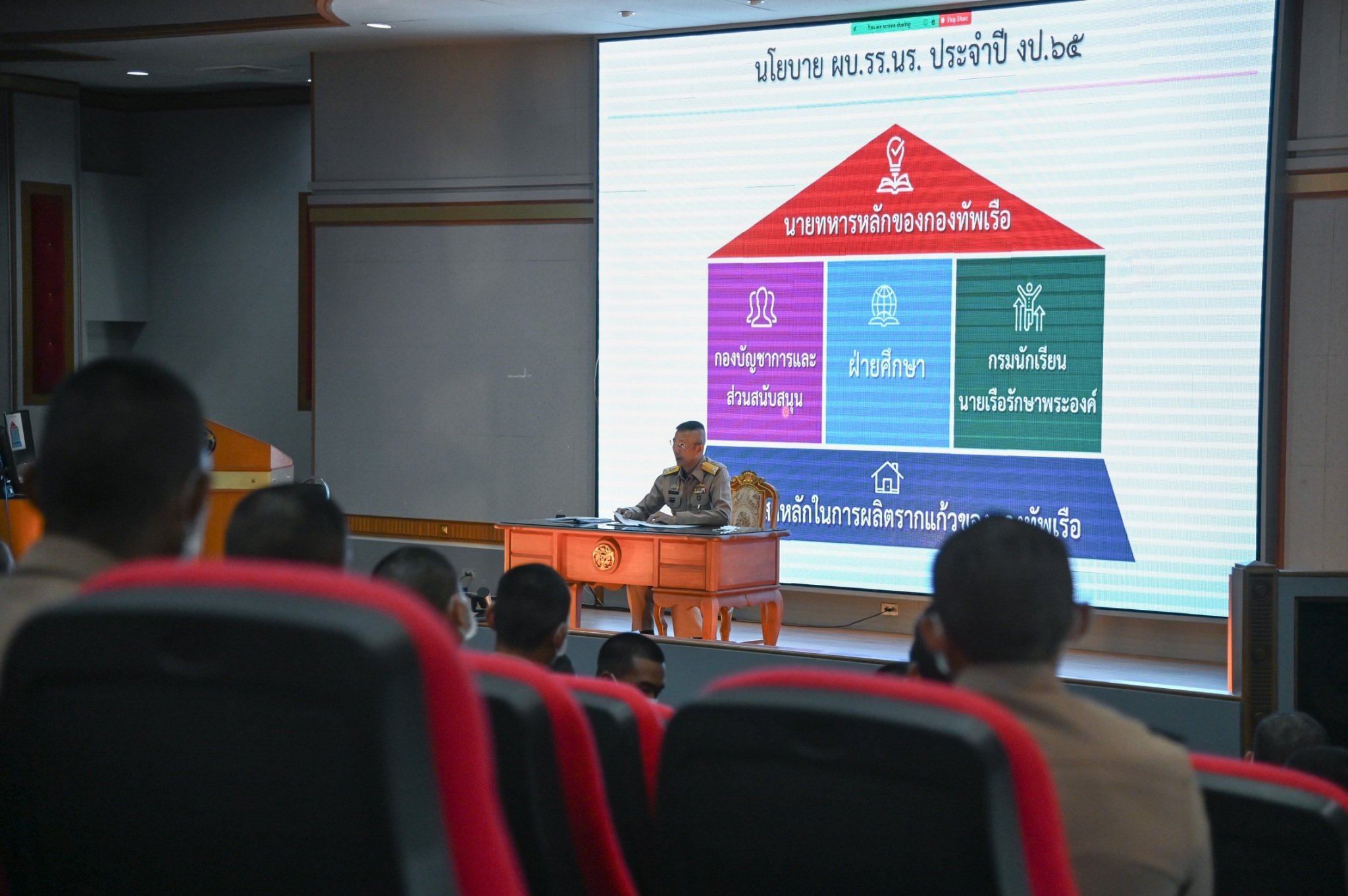ผู้บัญชาการโรงเรียนนายเรือแถลงเจตนารมณ์ และ มอบนโยบายประจำปีงบประมาณ 2565 แก่หน่วยขึ้นตรงโรงเรียนนายเรือ มุ่งเน้นการสร้างนักเรียนนายเรือเป็นนายทหารสัญญาบัตรที่มีความรู้ความสามารถ ความคิดริเริ่ม มีความเป็นผู้นำ มีคุณธรรมและจริยธรรม และมีความจงรักภักดีต่อชาติ ศาสนา และพระมหากษัตริย์ โดยให้ 3เสาหลักร่วมมือร่วมใจกันปฏิบัติหน้าที่ เพื่อสู่เป้าหมาย “ร่วมใจสร้างรากแก้วให้เข้มแข็ง เป็นแรงขับทัพเรือสู่เป้าหมาย”