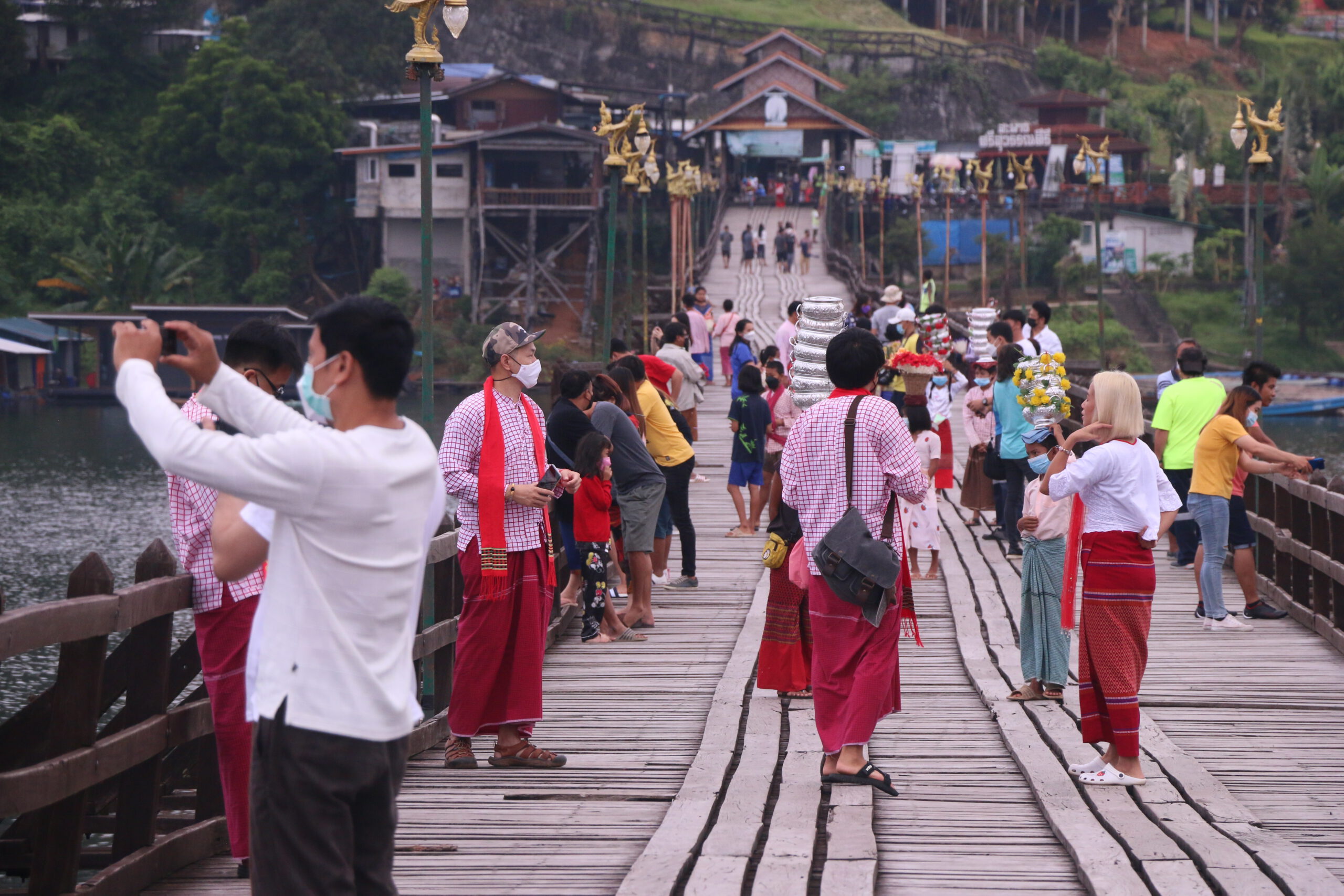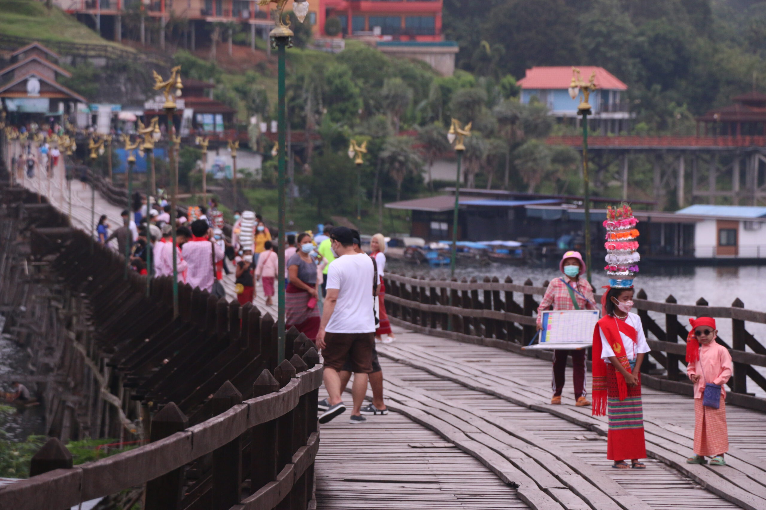 ขณะที่สังขละบุรีช่วงนี้เริ่มเข้าสู่ฤดูการท่องเที่ยว ในช่วงเช้าอากาศเย็นสบาย ภายหลังจากใส่บาตรพระสงฆ์เป็นที่เรียบร้อย นักท่องเที่ยวส่วนใหญ่เลือกที่จะเดินทางมาเก็บภาพสวยๆบนสะพานไม้ฯ เพื่อเก็บไว้เป็นที่ระลึก หรือจะเลือกถ่ายรูปคู่กับเด็กตัวน้อยๆที่คอยนำเสนอบริการปะแป้งทะนาคา (แป้งพม่า) ท่ามกลางอากาศตอนเช้าที่เย็นสบาย ก่อนจะลงเรือนำเที่ยวพาชมธรรมชาติในทะเลสาบเขื่อนวชิราลงกรณ์ รวมทั้งการนั่งเรือไปชมวัดจมน้ำ ไหว้พระขอพร