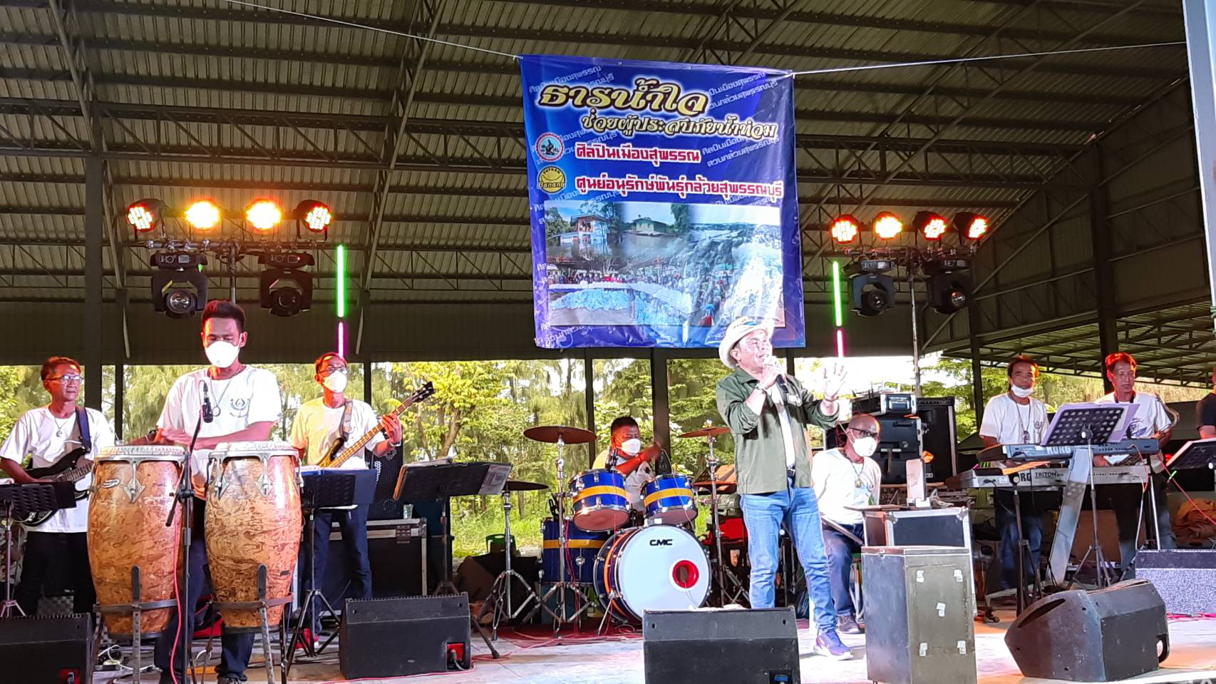 ที่ จ.สุพรรณบุรี พระธรรมพุทธิมงคล เจ้าอาวาสวัดป่าเลไลยก์วรวิหาร นายอานนท์ รักผล ประธานศูนย์อนุรักษ์พันธุ์กล้วยสุพรรณบุรี นาย ศรีธรรม ราชแก้ว นายอำเภอเมืองสุพรรณบุรีได้จัดการแสดงดนตรีไลฟ์สด ที่ลานแสดงดนตรี สวนกล้วยสุพรรณบุรี หลังวัดป่าเลไลยก์วรวิหาร โดยมีศิลปิน นักร้อง นักดนตรี ลูกหลานชาวสุพรรณบุรีทั้งวงสตริง ลูกทุ่งและสากล มาเล่นดนตรี เช่น ไผ่ เทอร์โบ โฟลค์เหน่อ ลำภา เพื่อนศิลปินอีกกว่า 30 วง ผลัดกันขึ้นเวทีเล่นตรี ให้ความบันเทิงผ่านการไลฟ์สดที่เพจ ศิลปินเมืองสุพรรณช่วยน้ำท่วม การแสดงดนตรีครั้งนี้ได้ปฏิบัติตามมาตรการป้องกันแพร่ระบาดโควิด ของกระทรวงสาธารณสุข อย่างเคร่งครัด ถึงแม้จะไม่มีคนนั่งชม มีแต่เก้าอี้และแผงเหล็กกั้น แต่ศิลปินทุกวงก็เล่นอย่างเต็มที่ แบบไม่มียั้ง