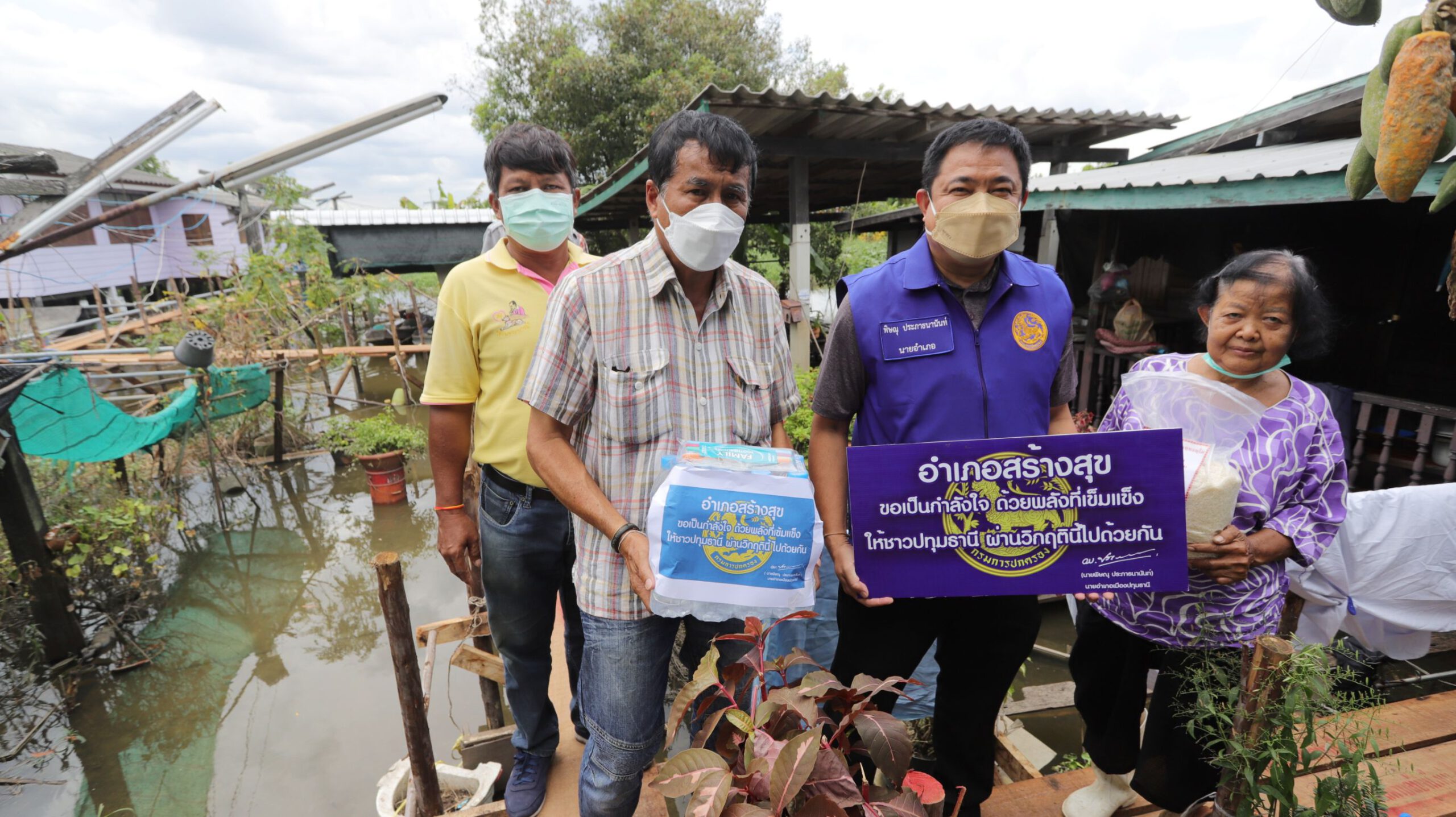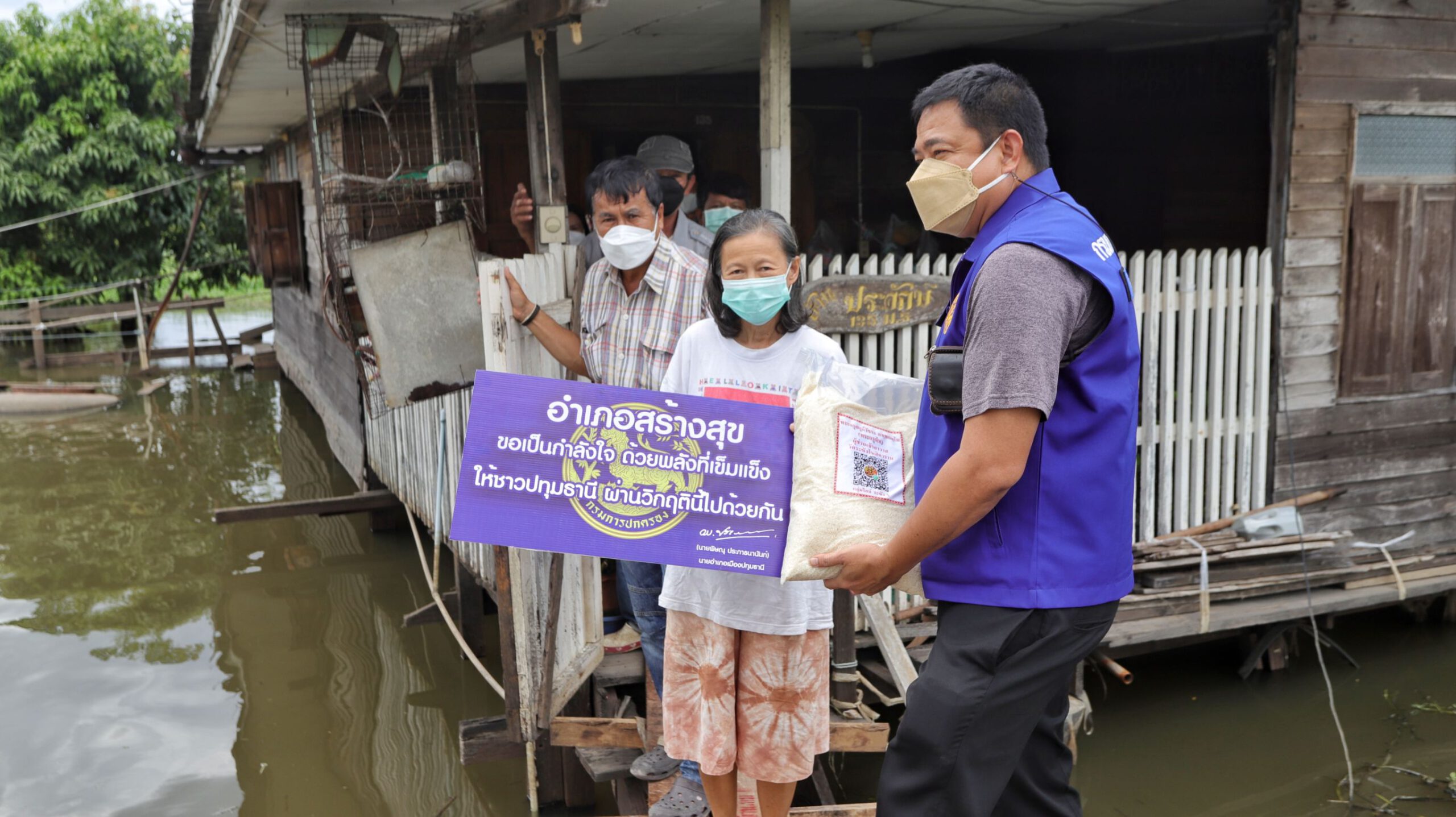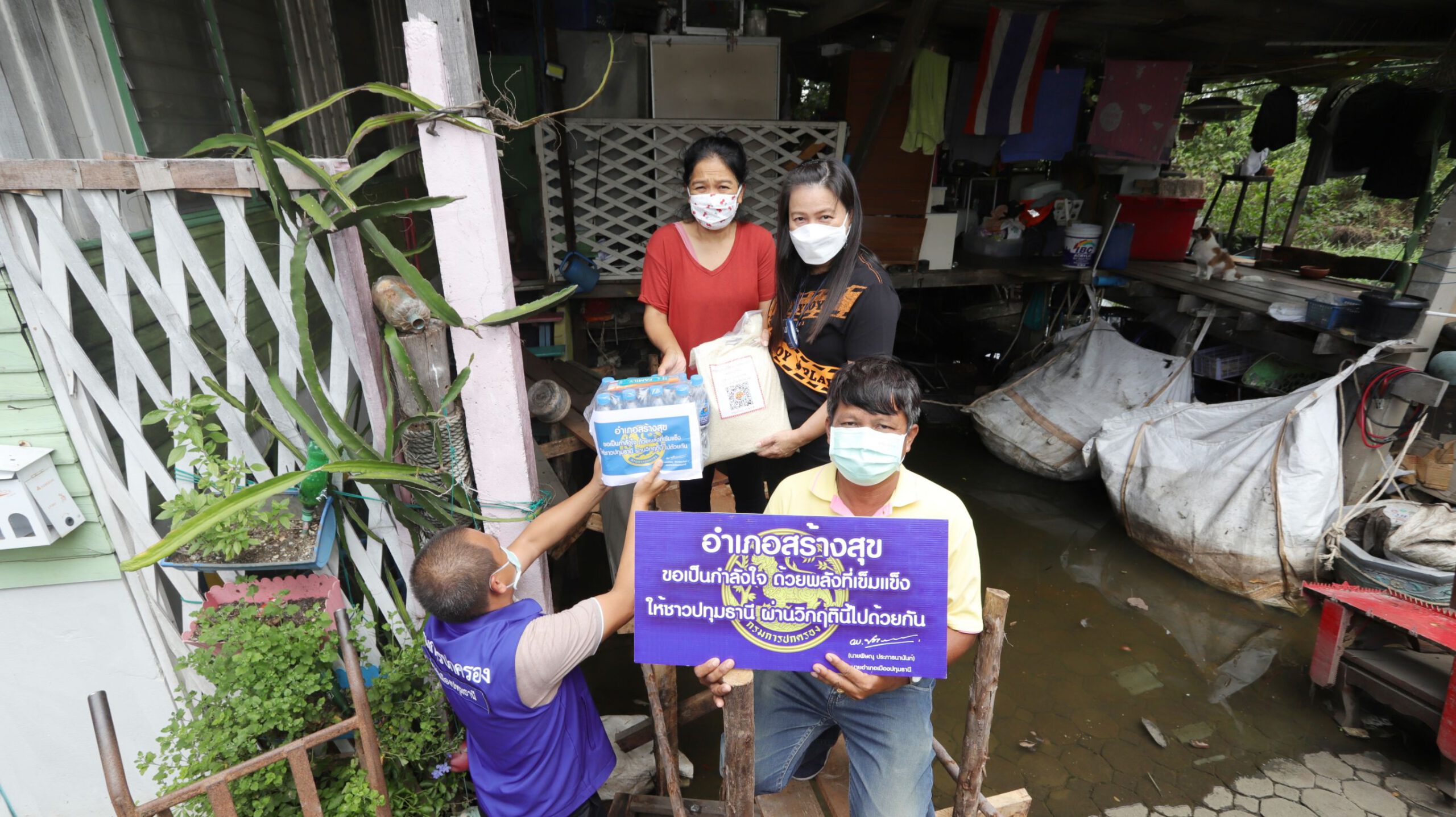 ช่วยต่อเนื่อง นอภ.เมืองปทุมธานีลุยเคาะประตู มอบข้าวสาร น้ำดื่ม ชาวบ้านริมน้ำ สู้ภัยน้ำท่วม