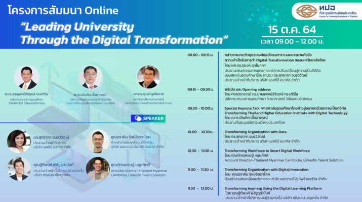 ในวันศุกร์ที่ 15 ตุลาคม 2564 มทร.รัตนโกสินทร์ นำโดย ผศ.ศิวะ วสุนธราภิวัฒก์ มอบหมาย ผศ.ดร.อาคีรา ราชเวียง รองอธิการบดี มทร.รัตนโกสินทร์ เข้าร่วมโครงการสัมมนา Leading University Through the Digital Transformation ผ่านระบบสื่ออิเล็กทรอนิกส์ (Zoom Meeting ) โดยได้รับเกียรติจาก ศ.นพ. สิริฤกษ์ ทรงศิวิไล ปลัดกระทรวงกระทรวงการอุดมศึกษา วิทยาศาสตร์ วิจัยและนวัตกรรม เป็นประธานในพิธีเปิด ผศ.ดร.ภุชงค์ อุทโยภาศ ประธานคณะกรรมการยุทธศาสตร์การปรับเปลี่ยนสู่การเป็นดิจิทัล ของสถาบันอุดมศึกษาไทย ที่ประชุมอธิการบดีแห่งประเทศไทย (ทปอ) เป็นผู้กล่าวรายงานวัตถุประสงค์ของโครงการฯ
