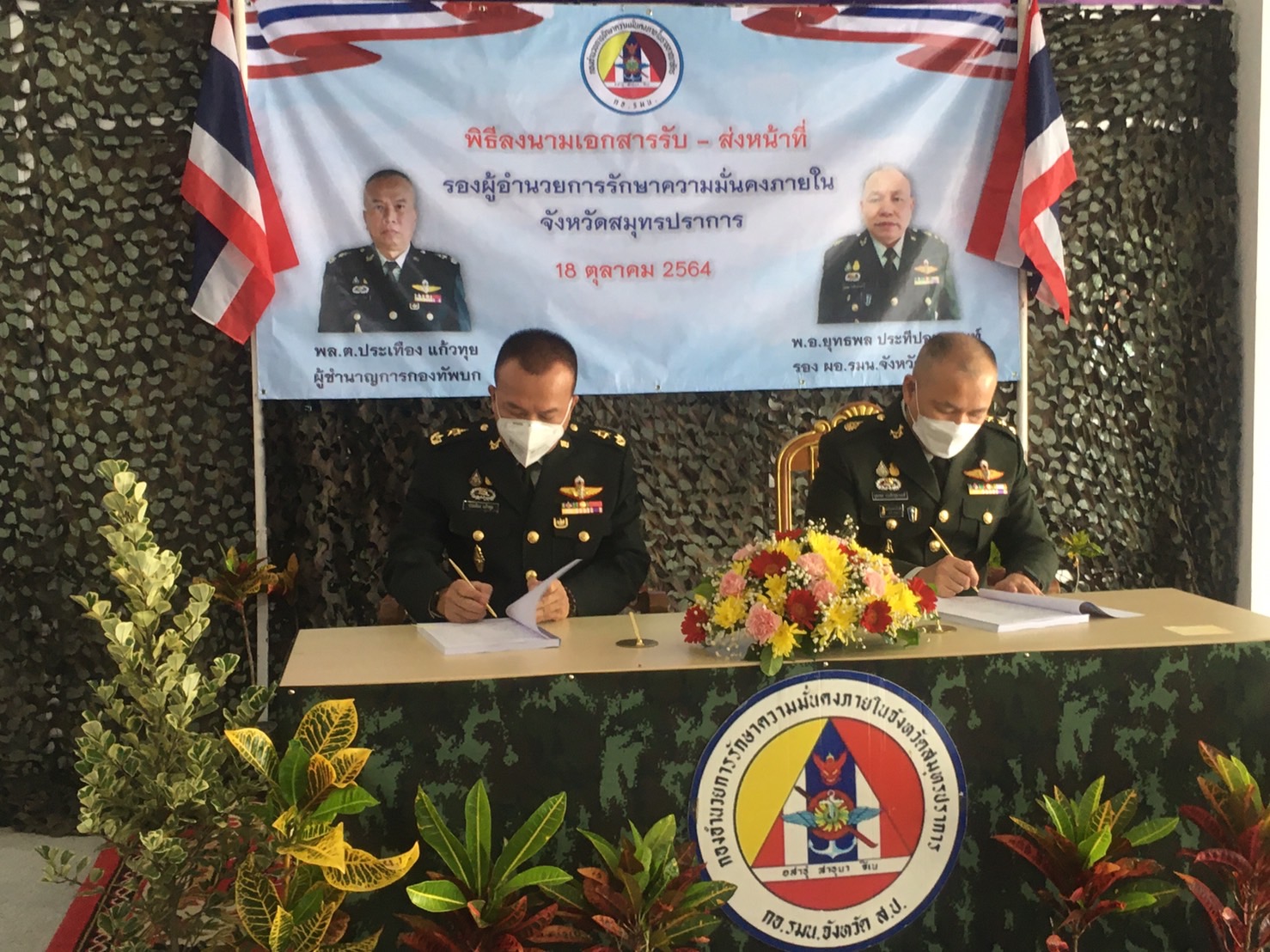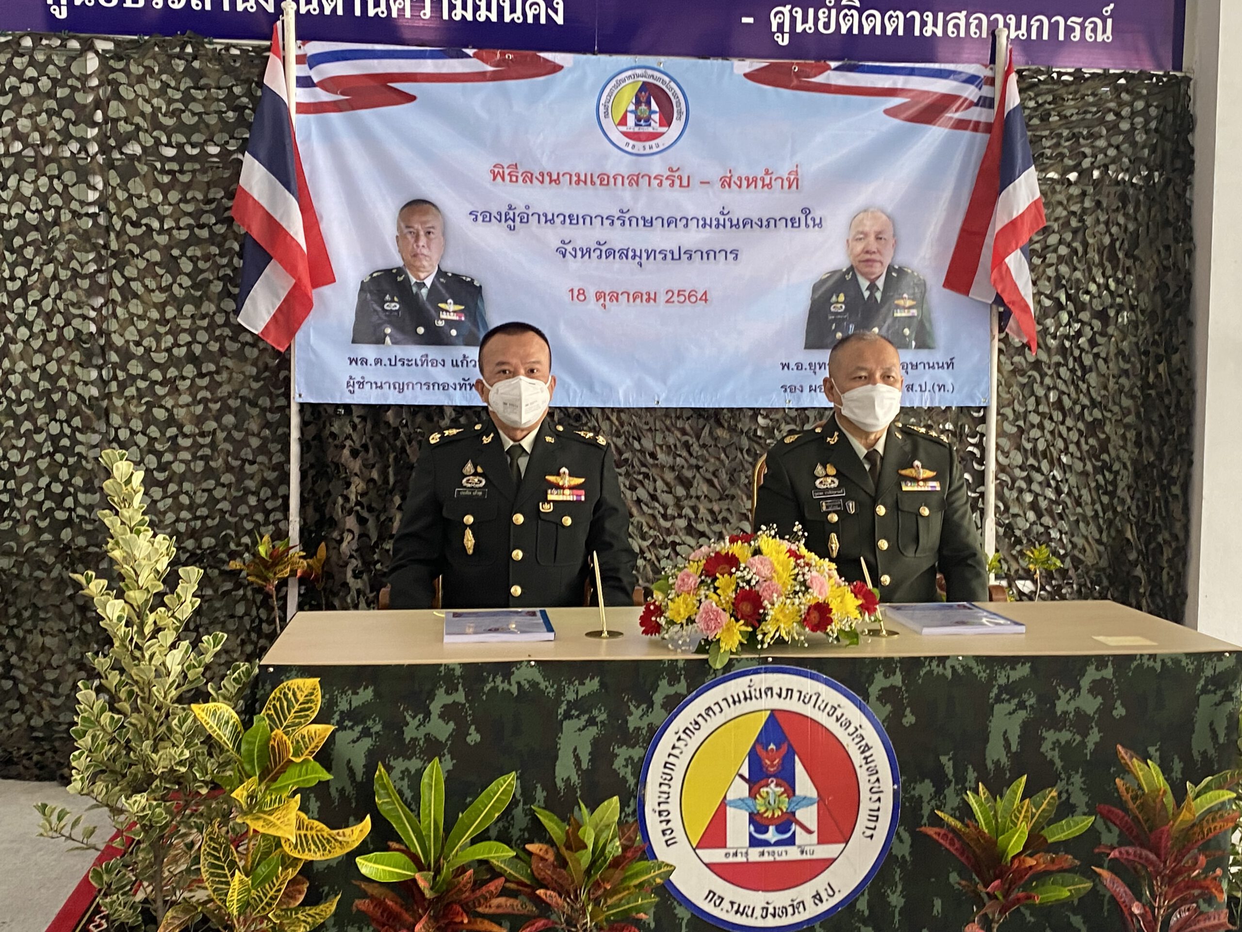 *****เมื่อเวลา 10.00น. วันที่ 18 ต.ค.2564 ที่ อาคารอเนกประสงค์เทศบาลนครสมุทรปราการ ถนนสุทธิภิรมย์ อำเภอเมือง จังหวัดสมุทรปราการ กองอำนวยการรักษาความมั่นคงภายในจังหวัดสมุทรปราการ จัดพิธีรับ ส่งหน้าที่ และมอบการบังคับบัญชา รองผู้อำนวยการรักษาความมั่นคงภายในจังหวัดสมุทรปราการ (ฝ่ายทหาร) ระหว่าง พลตรีประเทือง แก้วทุย ผู้ชำนาญการกองทัพบก กับพันเอกยุทธพล ประทีปอุษานนท์ รองผู้อำนวยการสำนักปฏิบัติรักษาความมันคงภายในจังหวัดมณฑลทหารบกที่ 11
