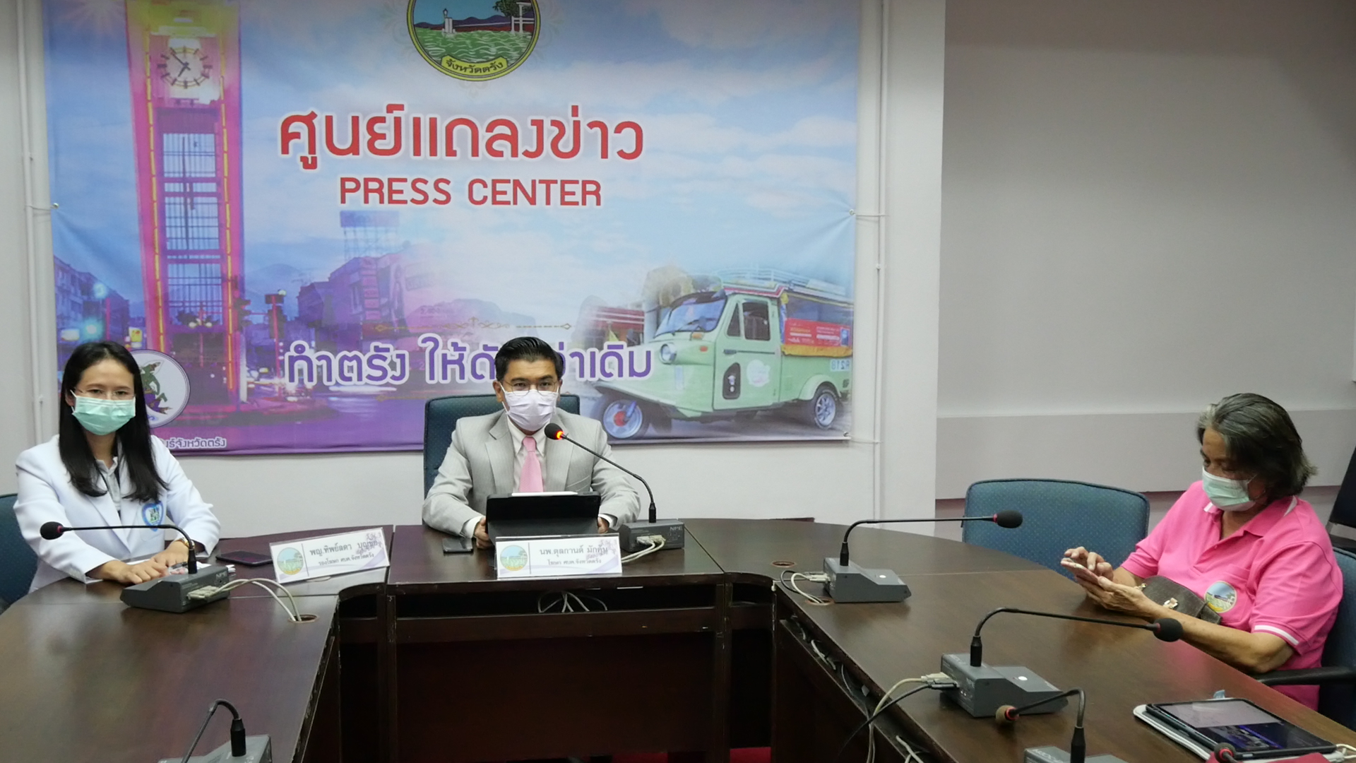 ที่ศูนย์แถลงข่าว ศูนย์บริหารสถานการณ์การแพร่ระบาดของโรคติดเชื้อไวรัสโคโรนา 2019 จังหวัดตรัง ห้องลิบง ชั้น 2 ศาลากลางจังหวัดตรัง นายแพทย์ ตุลกานต์ มักคุ้น นายแพทย์ชำนาญการพิเศษ โรงพยาบาลตรัง ในฐานะโฆษกศูนย์บริหารสถานการณ์การแพร่ระบาดของโรคติดเชื้อไวรัสโคโรนา 2019 จังหวัดตรัง พร้อมด้วย แพทย์หญิงทิพย์ลดา บุญชัย นายแพทย์ชำนาญการ โรงพยาบาลตรัง ในฐานะรองโฆษกศูนย์บริหารสถานการณ์การแพร่ระบาดของโรคติดเชื้อไวรัสโคโรนา 2019 จังหวัดตรัง ร่วมแถลงข่าวสถานการณ์การแพร่ระบาดของโรคติดเชื้อไวรัสโคโรนา 2019 จังหวัดตรังมีผู้ติดเชื้อรายใหม่ในจังหวัดตรัง จำนวน 155ราย ติดเชื้อจากต่างจังหวัด 32 ราย รวมเป็นผู้ติดเชื้อรายใหม่ 187 ราย ผู้ติดเชื้อตามการระบาดระลอกใหม่นับตั้งแต่วันที่ 1 เมษายน 2564 เป็นจำนวน 8,206 ราย ผู้ติดเชื้อรายใหม่ในจังหวัดตรังต่อวันเฉลี่ยรอบสัปดาห์ 163.4 ราย/วัน อัตรานี้เพิ่มขึ้นสูงสุด นอกจากผู้ที่มารักษาที่จังหวัดตรังในรอบสัปดาห์เฉลี่ยต่อวัน 180.5 ราย/วัน อัตรานี้เกินกว่าระดับสูงสุดที่โรงพยาบาลในจังหวัดตรังจะรับไว้ได้ ถ้ายังคงมีอัตรานี้อยู่ในเวลา 15 วัน