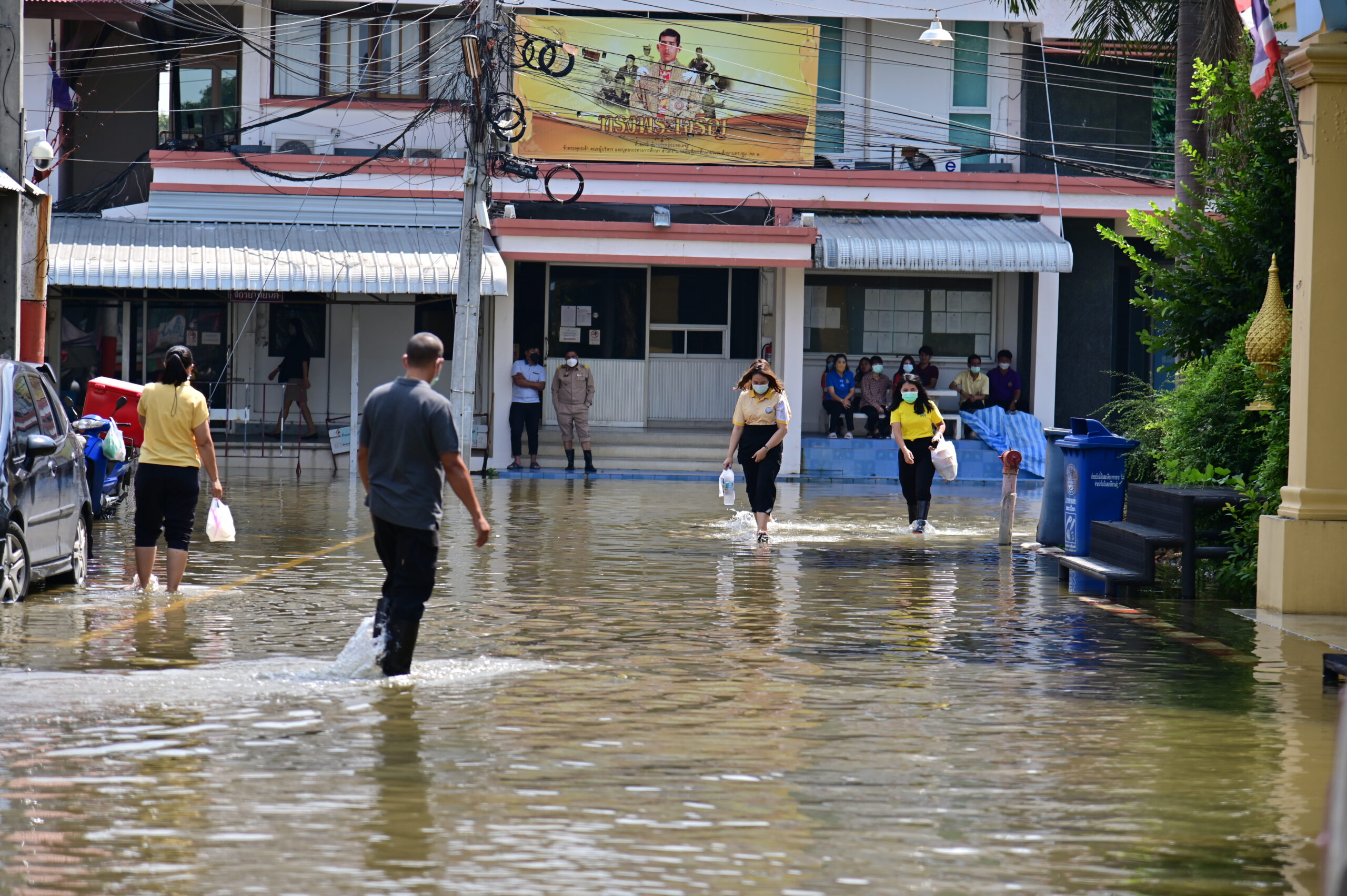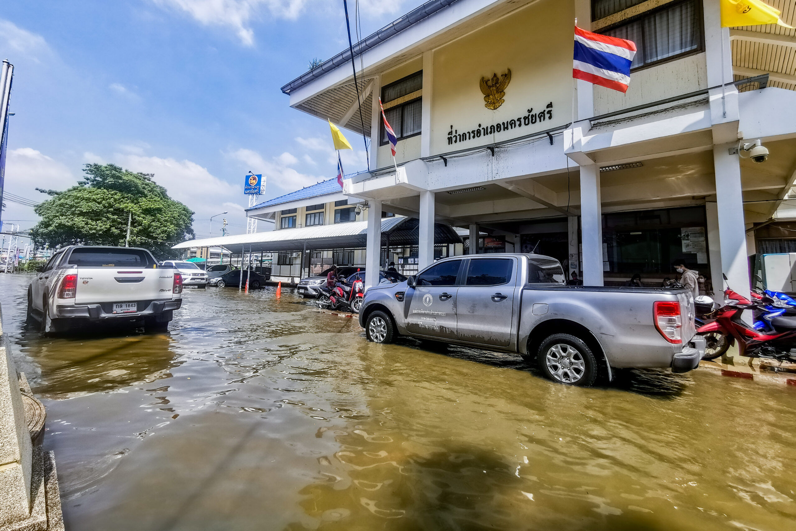 วันที่ 25 ตุลาคม 2564 สถานการณ์การอุทกภัยในพื้นที่จังหวัดนครปฐม จากปริมาณน้ำในแม่น้ำท่าจีนที่เพิ่มสูงขึ้นอย่างต่อเนื่อง ล่าสุดเอ่อล้นท่วมบริเวณหน้าที่ว่าการอำเภอนครชัยศรี ประมาณ 30 เซนติเมตร เนื่องจากที่ว่าการอำเภอตั้งอยู่ริมแม่น้ำท่าจีน โดยยังคงเปิดให้บริการประชาชนตามปกติ พร้อมทั้งเร่งสูบน้ำและวางกระสอบทรายเสริมแนวคันกั้นน้ำเพิ่มเติม ขณะที่ชาวบ้านหมู่ 2 ตำบลแหลมบัว อำเภอนครชัยศรี ได้เร่งช่วยกันลงแขกเกี่ยวข้าวใส่เรือ ก่อนที่จะได้รับความเสียหายจากปริมาณน้ำที่เพิ่มสูงขึ้น
