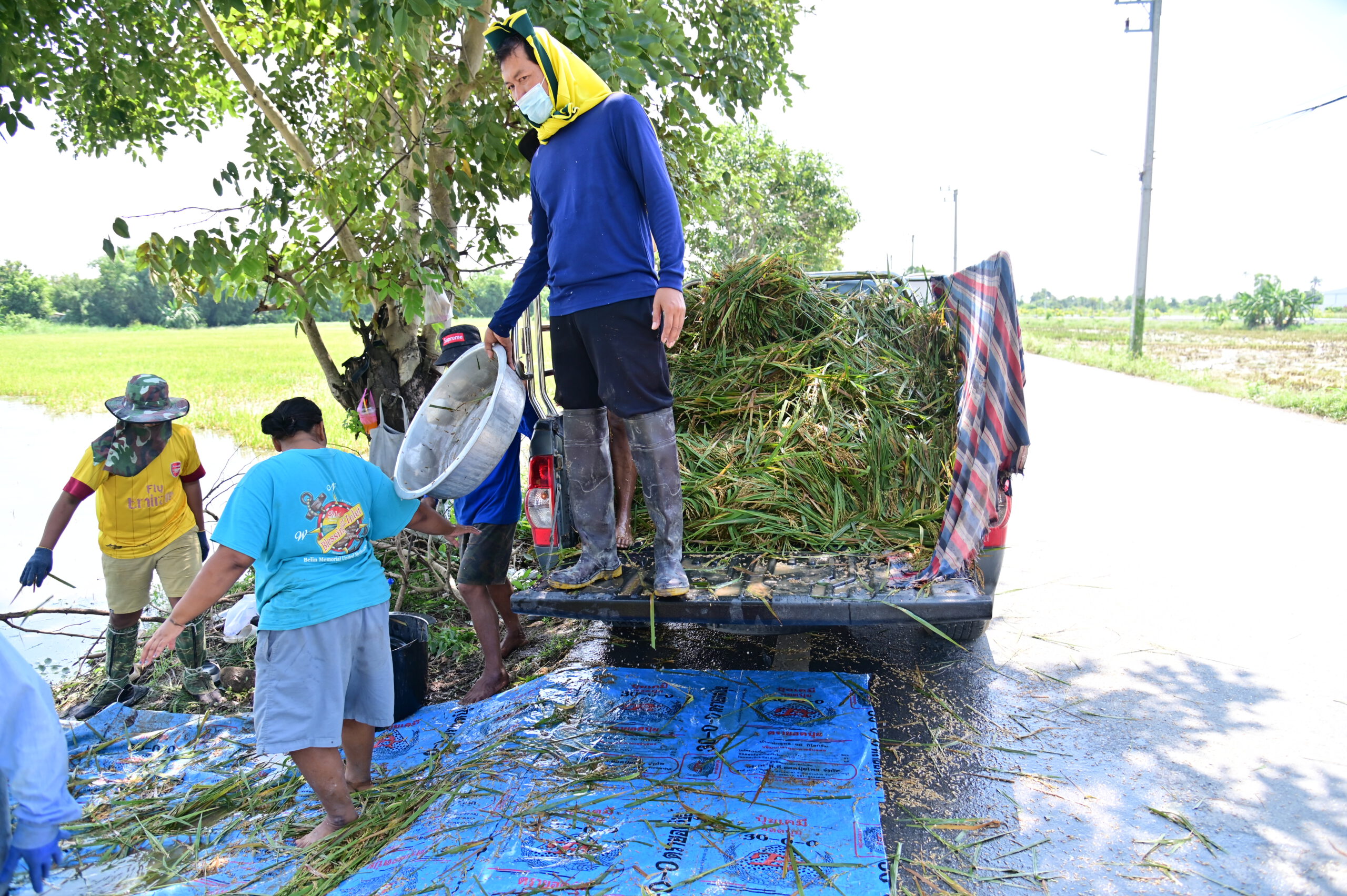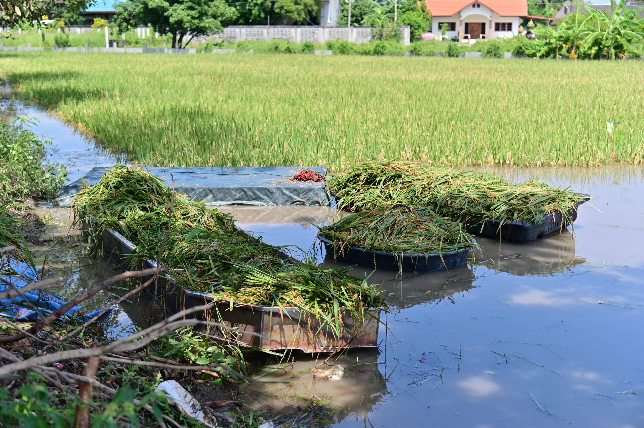 นายสมหมาย โพธิ์ทองนาค ผู้ช่วยผู้ใหญ่บ้าน หมู่ 2 ตำบลแหลมบัว อำเภอนครชัยศรี ซึ่งเป็นเจ้าของนาข้าวแห่งนี้ กล่าวว่า จากสถานการณ์อุทกภัยที่เกิดขึ้นตั้งแต่ช่วงต้นเดือนตุลาคม ทำให้พื้นที่นาข้าวของชาวบ้านได้รับความเสียหาย ตนเองและชาวบ้าน จึงได้ร่วมกันลงแรงเก็บเกี่ยวผลผลิตและช่วยเหลือผู้ที่ได้รับความเดือดร้อน จนกระทั่งในวันนี้ ชาวบ้านได้มาร่วมกันช่วยเก็บเกี่ยวผลผลิตของตนเอง ซึ่งมีประมาณ 20 ไร่ ขณะนี้เก็บเกี่ยวไปแล้วประมาณ 4 ไร่ โดยไม่หวังว่าจะเก็บเกี่ยวได้ทั้งหมด เนื่องจากระดับน้ำที่ยังคงเพิ่มสูงขึ้น นับเป็นครั้งแรกในชีวิตที่เกิดน้ำท่วมพื้นที่นาข้าวของตนเองและชาวบ้าน ส่วนข้าวที่เก็บเกี่ยวมาแล้วจะต้องนำไปตากให้แห้ง ก่อนนำไปจำหน่ายให้กับโรงสีต่อไป