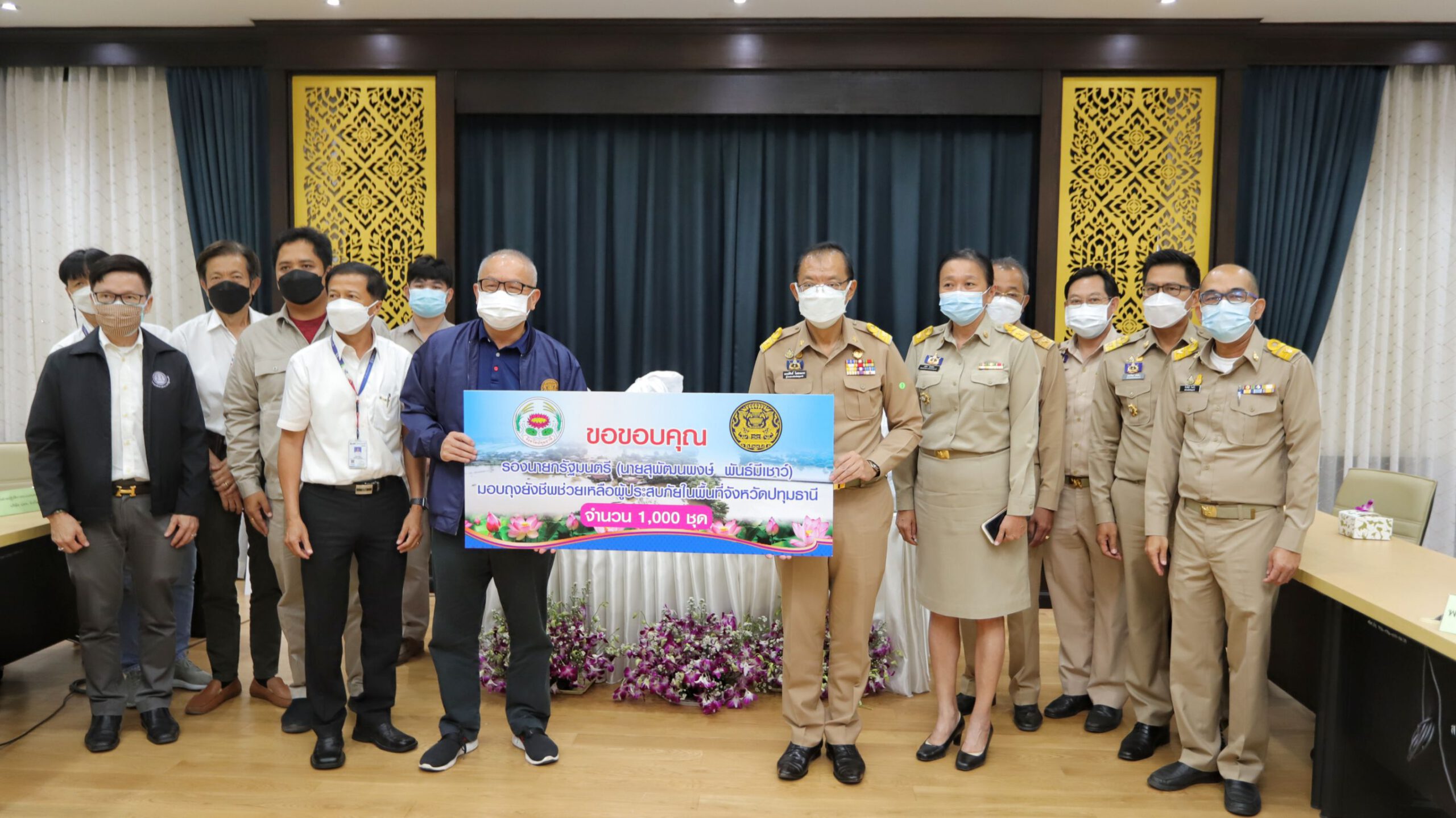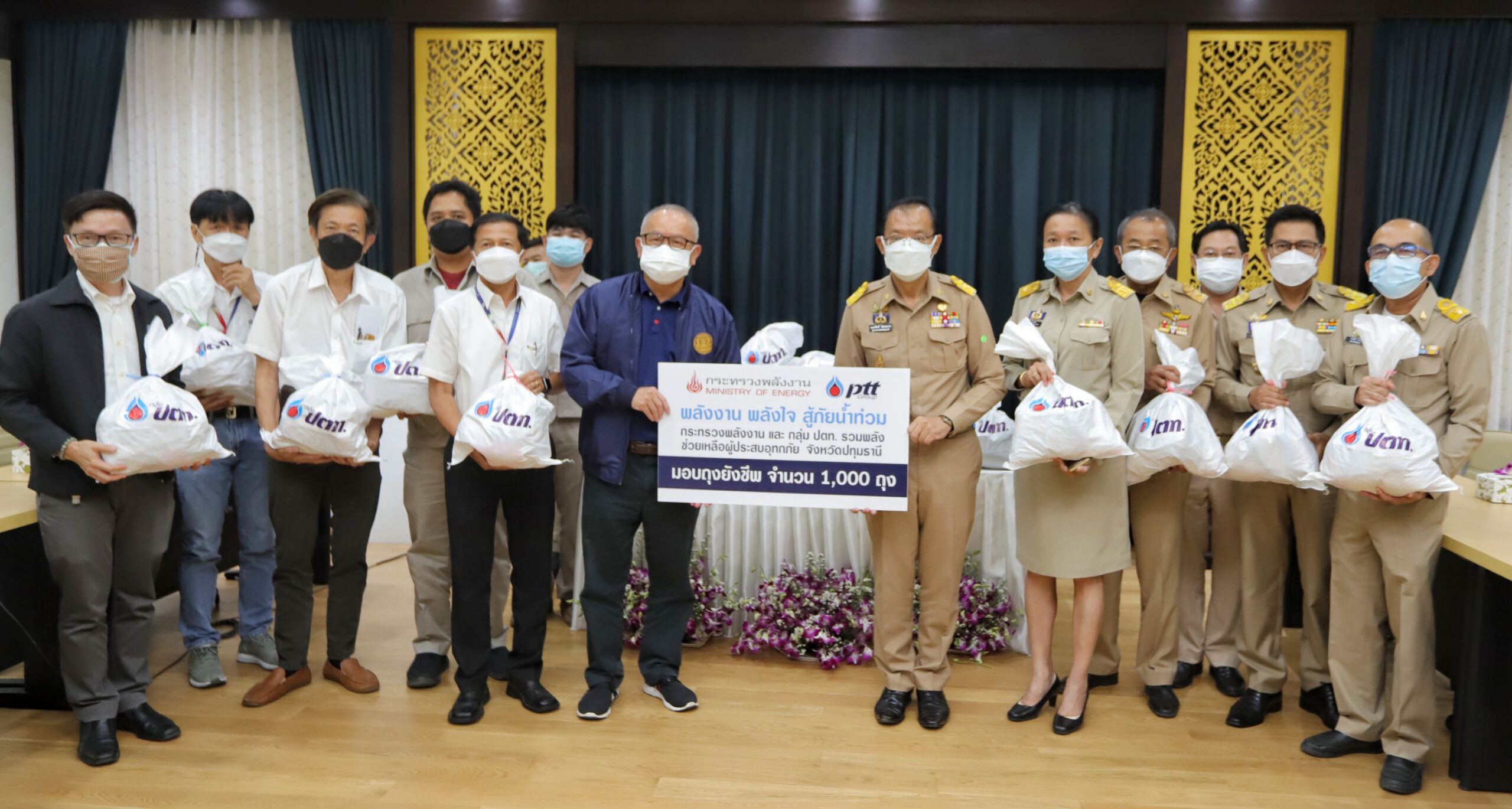 เมื่อเวลา 10.00 น. วันที่ 28 ต.ค.2564 ที่ห้องประชุม ชั้น 2 ศาลากลางจังหวัดปทุมธานี นายสุพัฒนพงษ์ พันธ์มีเชาว์ รองนายกรัฐมนตรี และรัฐมนตรีว่าการกระทรวงพลังงาน พร้อมนางพิชชารัตน์ เลาหพงศ์ชนะ ส.ส.บัญชีรายชื่อ พรรคพลังประชารัฐ โฆษกคณะกรรมาธิการ กมธ. การพลังงาน สภาผู้แทนฯ และ คณะผู้บริหาร บริษัท ปตท. จำกัด (มหาชน) ลงพื้นที่ ติดตามสถานการณ์น้ำท่วมและรับฟังการบรรยายสรุป สถานการณ์น้ำท่วม จังหวัดปทุมธานี พร้อมทั้งมอบถุงยังชีพ 1,000 ชุด เพื่อบรรเทาความเดือดร้อนผู้ประสบอุทกภัยเบื้องต้น ตามโครงการ “พลังงาน พลังใจ สู้ภัยน้ำท่วม 2564” โดยมี นายณรงค์ศักดิ์ โอสถธนากร ผู้ว่าราชการจังหวัดปทุมธานี นายดรณ์ สมิตะเกษตริน ปลัดจังหวัดปทุมธานี นางสาวธนิยา นัยพินิจ หัวหน้าสำนักงานจังหวัดปทุมธานี ว่าที่ ร.ต.ขรรค์ไชย ทันธิมา ท้องถิ่นจังหวัดปทุมธานี ร่วมรับมอบ เพื่อนำไปส่งต่อให้ประชาชนที่ได้รับผลกระทบจากน้ำท่วมในพื้นที่