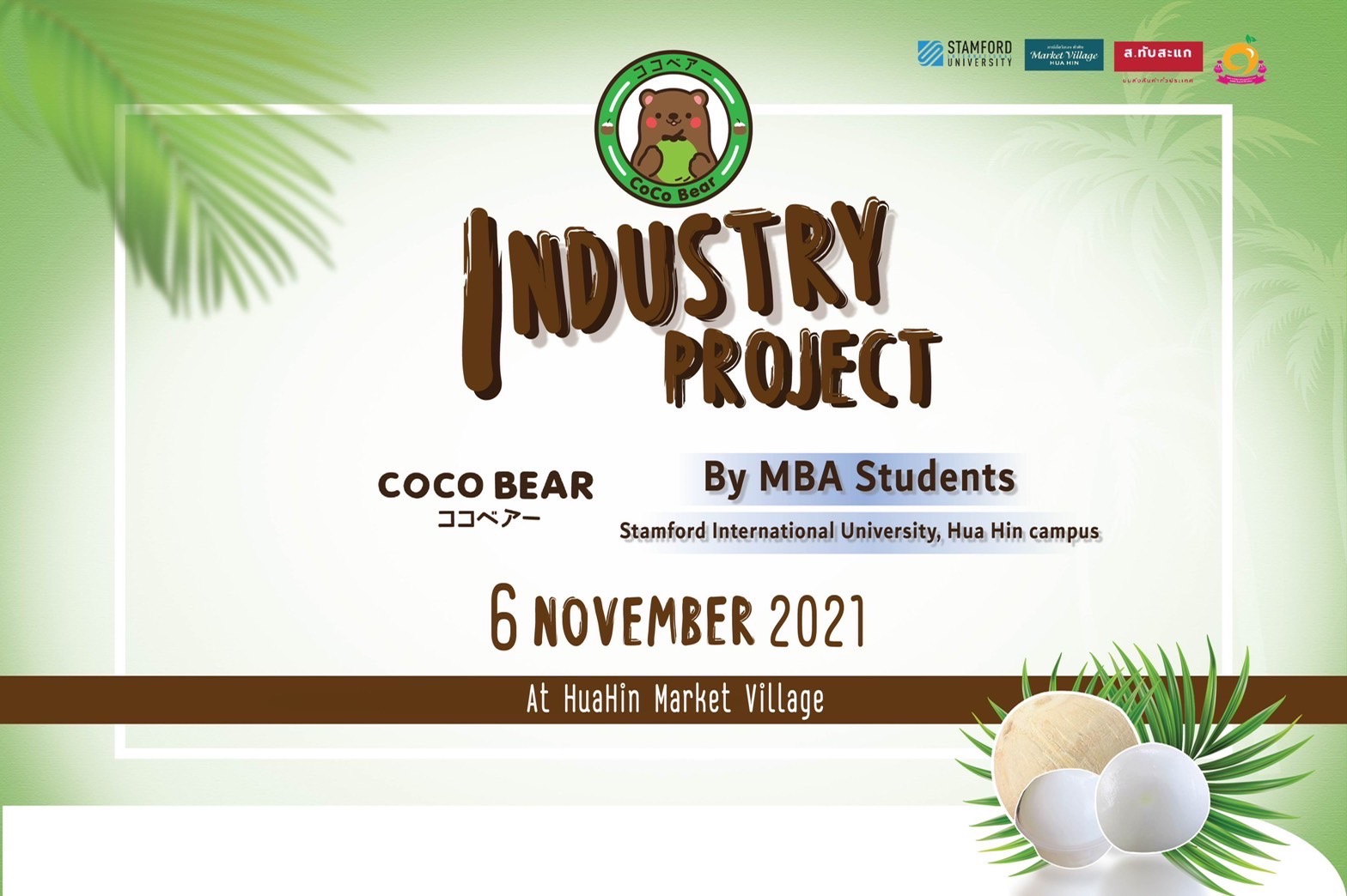 โดยจากการเรียนรู้ในห้องเรียนของนักศึกษาระดับ ป.โท มหาวิทยาลัยนานาชาติแสตมฟอร์ดฯ สู่การนำองค์ความรู้ที่ได้จากการเรียนรู้ในหลายๆ วิชามาบูรณาการ สู่การนำไปปฏิบัติจริง จึงได้เกิด “CoCo Bear” มะพร้าว ซึ่งมี ถิ่นกำเนิดจากอำเภอดำเนินสะดวก ซึ่งถือได้ว่าเป็นแหล่งปลูกมะพร้าวน้ำหอมที่มีคุณภาพที่ดีที่สุดในประเทศไทย โดยใช้มะพร้าวเกรดเอนำมาผลิต เพื่อการส่งออกในบรรจุภัณฑ์สะดวกพร้อมดื่ม เน้นความน่ารักในสไตล์ญี่ปุ่นและสะดวกในการดื่มในราคา ที่สมเหตุสมผล จนสามารถพัฒนาต่อยอดสร้างธุรกิจนี้ขึ้นมาได้จริงในรูปแบบ สตาร์ตอัพขนาดย่อม จนมีกลุ่มนายทุนภายนอกที่ได้เห็น รูปแบบแนวคิดและความน่าสนใจของ “CoCo Bear” ได้มีการติดต่อสนใจซื้อ ผลิตภัณ์กับทางกลุ่มนักศึกษาระดับปริญญาโท มหาวิทยาลัยนานาชาติแสตมฟอร์ด วิทยาเขตหัวหิน