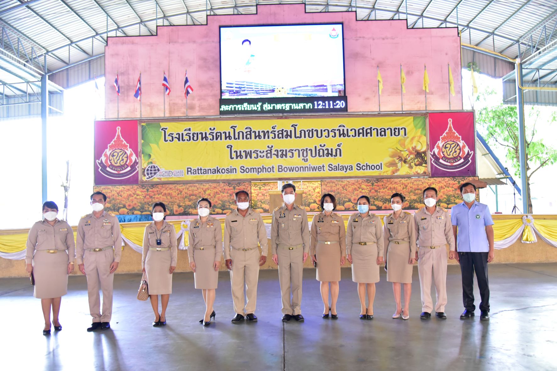 วันที่ 15 พฤศจิกายน 2564 นายสุรศักดิ์ เจริญศิริโชติ ผู้ว่าราชการจังหวัดนครปฐม พร้อมด้วย นางสาวสลารีวรรณ ทัพทวี นายอำเภอพุทธมณฑล ว่าที่ร้อยตรีพิษนุพล แตงอ่อน ผอ.โรงเรียนรัตนโกสินทร์สมโภชบวรนิเวศศาลายาในพระสังฆราชูปถัมป์ และสาธารณสุขอำเภอ ตรวจเยี่ยมความพร้อมเปิดเรียนแบบ on site ของโรงเรียนระดับมัธยมศึกษาตอนปลายวันแรก ที่โรงเรียนรัตนโกสินทร์สมโภชบวรนิเวศศาลายาในพระสังฆราชูปถัมป์ อำเภอพุทธมณฑล จังหวัดนครปฐม ซึ่งมีนักเรียนทั้งหมด 1,600 คน นักเรียนระดับมัธยมศึกษาตอนปลาย ที่เปิดเรียนแบบ on site จำนวน 456 คน โดยเปิดเรียนสลับเลขที่คี่และคู่ เพื่อลดความแออัดของนักเรียน ครูและบุคลากรทางการศึกษาได้รับการฉีดวัคซีนแล้ว 85 เปอร์เซ็นต์ ส่วนนักเรียนได้รับการฉีดวัคซีนครบ 2 เข็มแล้ว 90 เปอร์เซ็นต์ สำหรับการเปิดเรียนแบบ on site ของโรงเรียนแห่งนี้ นักเรียนต้องผ่านการตรวจ ATK ก่อนเข้าการเรียนการสอนทุกคน