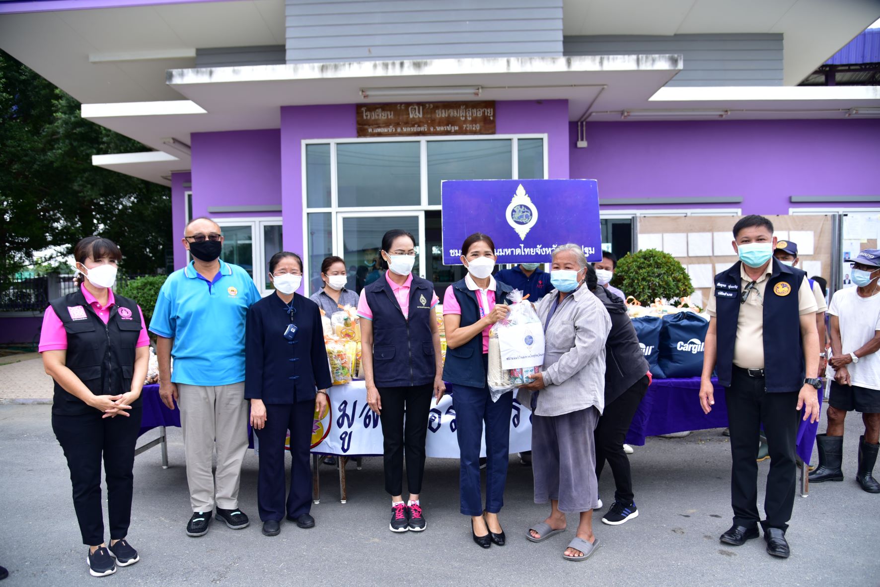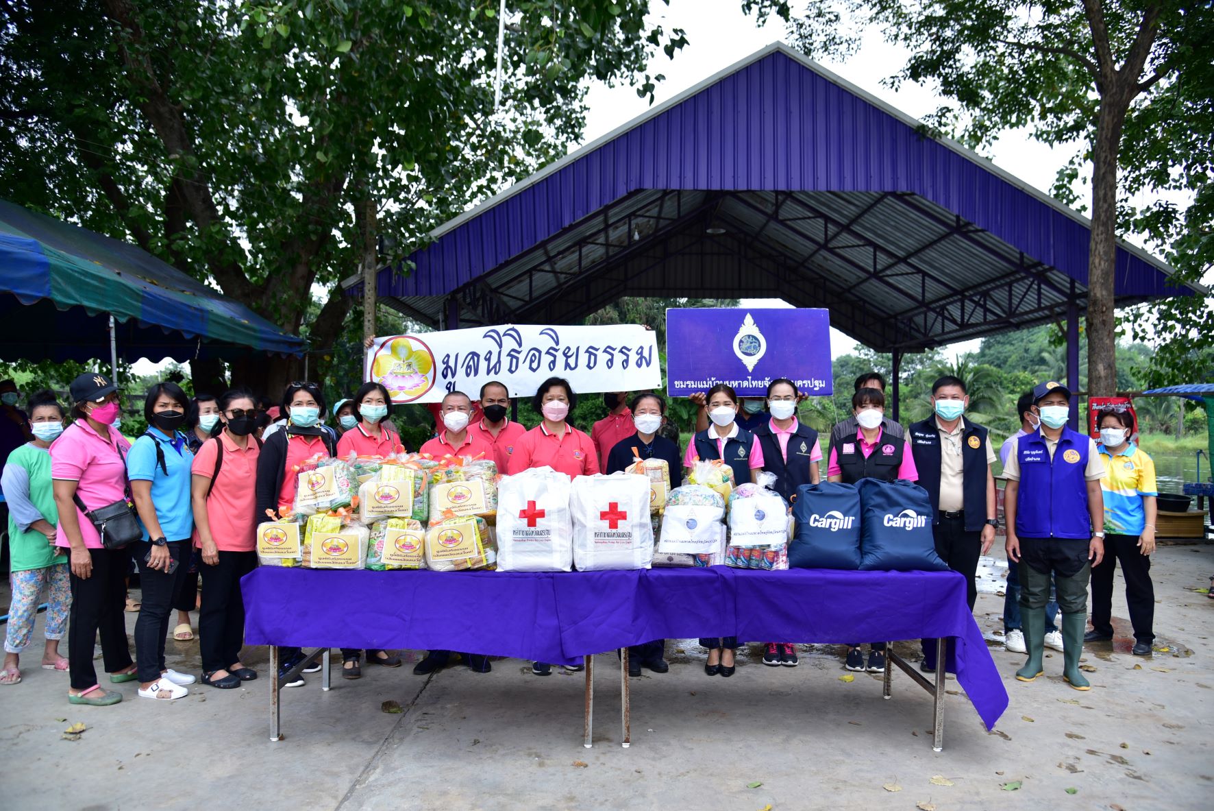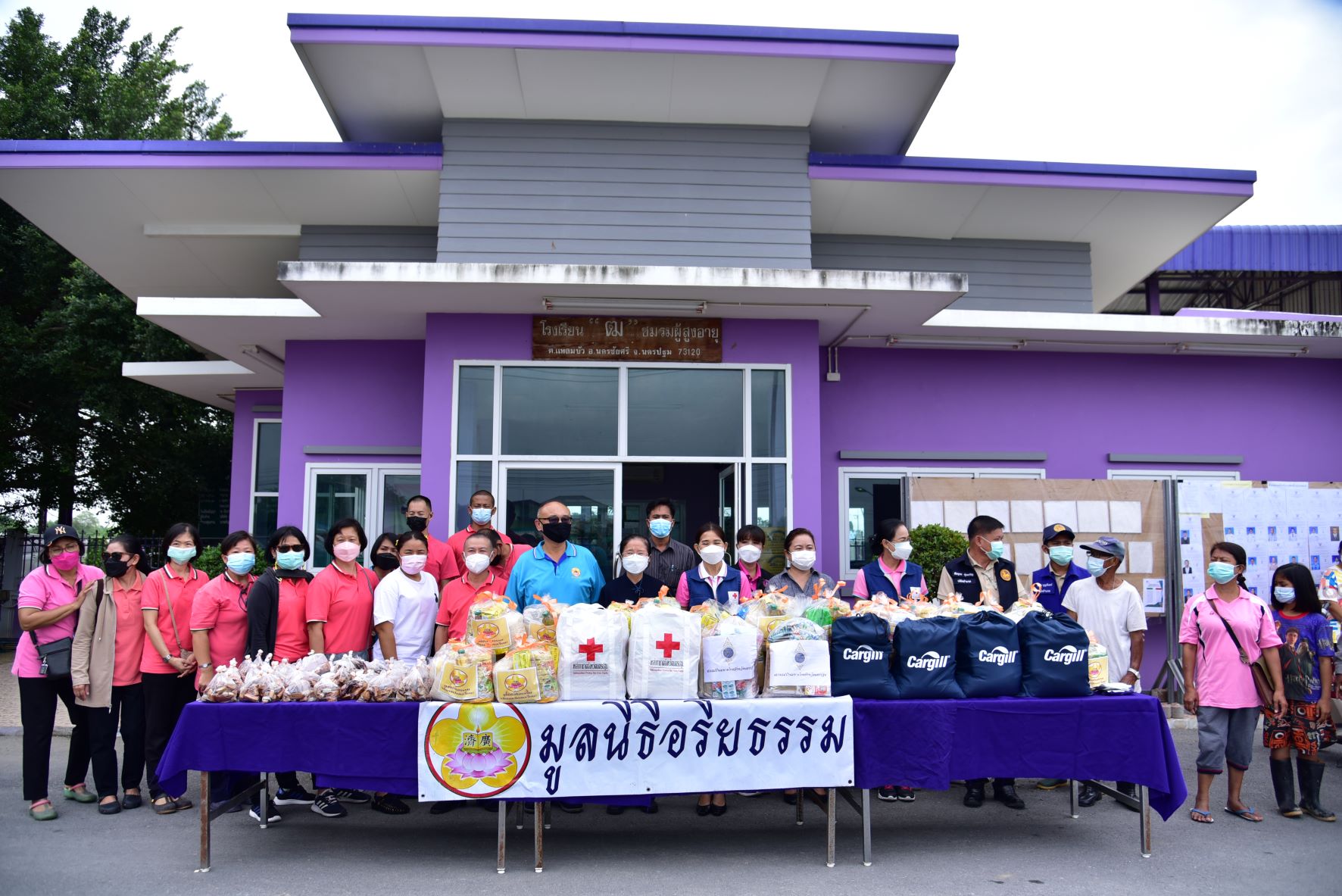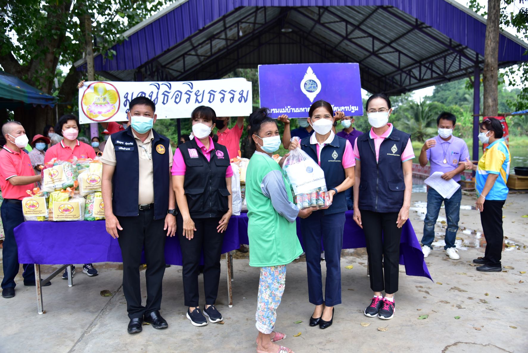 วันที่ 16 พฤศจิกายน พ.ศ. 2564 นางวราภรณ์ เจริญศิริโชติ นายกเหล่ากาชาดจังหวัดนครปฐม/ประธานแม่บ้านมหาดไทยจังหวัดนครปฐม พร้อมด้วย นางสาวชวนชม จันทะวงษ์ พัฒนาสังคมและความมั่นคงของมนุษย์ นางกัญจนา สร้อยอินทรากุล ผู้ช่วยนายกเหล่ากาชาดจังหวัดนครปฐม และหน่วยงานที่เกี่ยวข้อง ร่วมกับ มูลนิธิอริยธรรม (เสี่ยนเหลียงเอเวี่ยน) ลงพื้นที่มอบถุงยังชีพ จำนวน 200 ชุด และมอบหน้ากากอนามัย ให้กับผู้ที่ได้รับผลกระทบจากสถานการณ์อุทกภัย เพื่อบรรเทาความเดือดร้อนเบื้องต้น ในพื้นที่อำเภอนครชัยศรี จังหวัดนครปฐม ได้แก่ องค์การบริหารส่วนตำบลแหลมบัว วัดทุ่งน้อย และวัดโคกเขมา และตำบลศรีมหาโพธิ์ ได้แก่ วัดละมุด