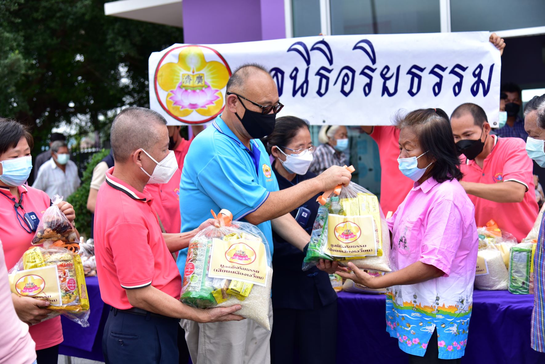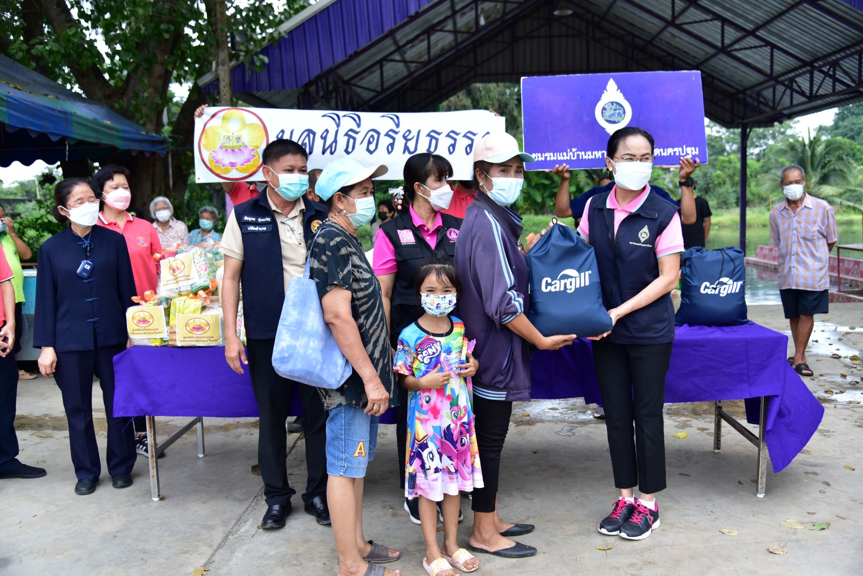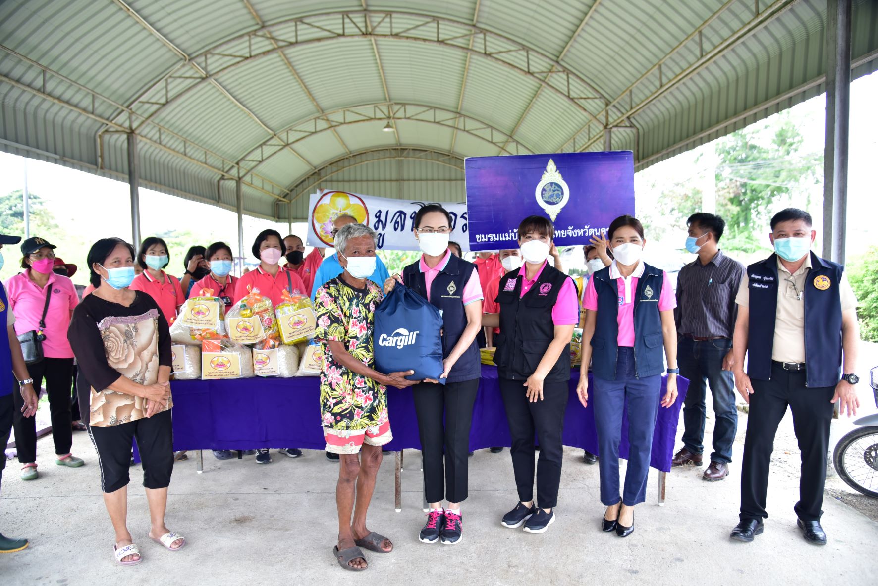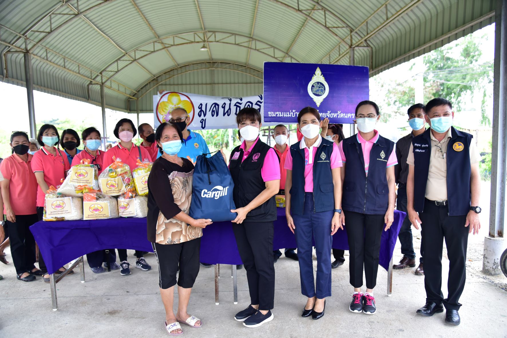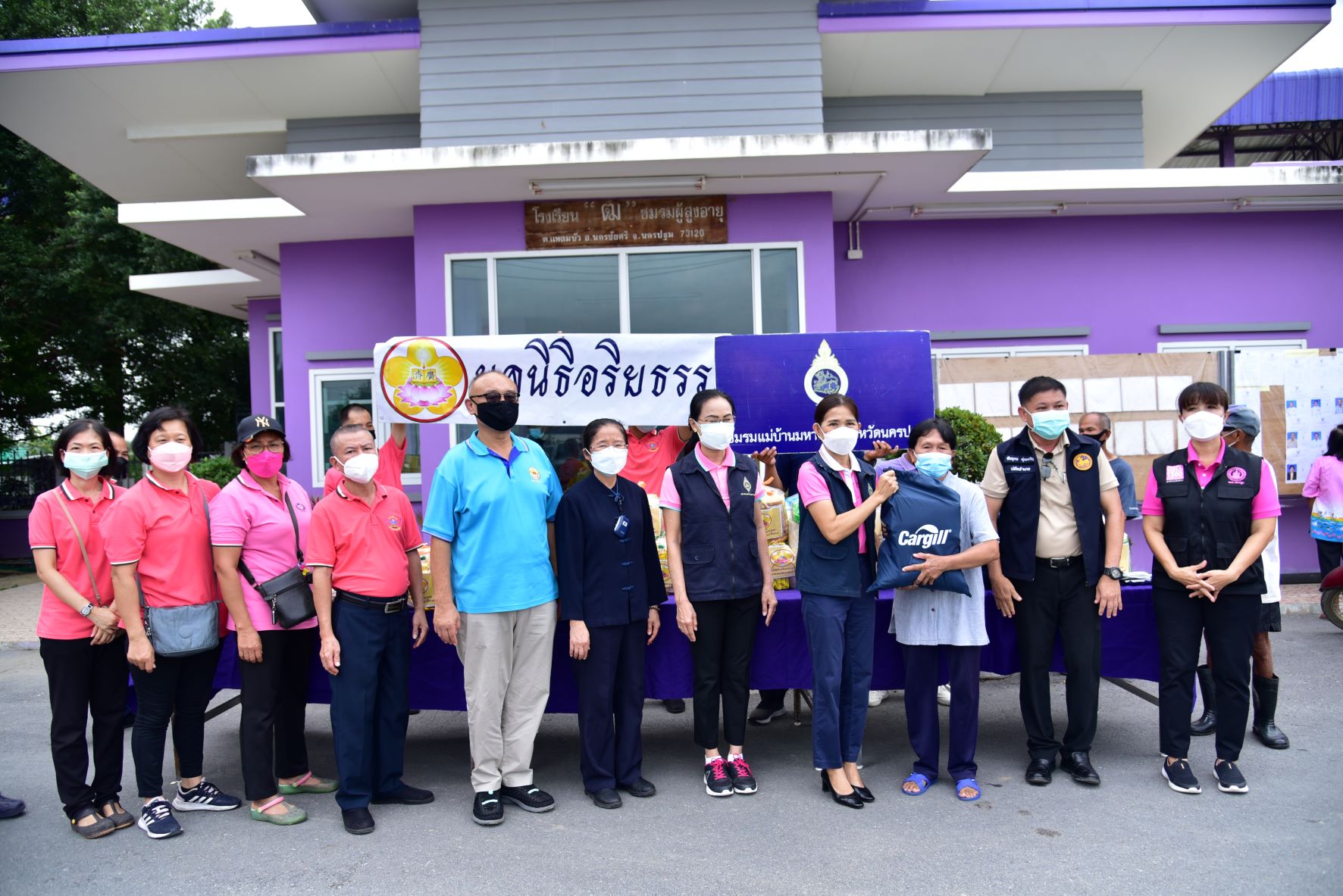 วันที่ 16 พฤศจิกายน พ.ศ. 2564 นางวราภรณ์ เจริญศิริโชติ นายกเหล่ากาชาดจังหวัดนครปฐม/ประธานแม่บ้านมหาดไทยจังหวัดนครปฐม พร้อมด้วย นางสาวชวนชม จันทะวงษ์ พัฒนาสังคมและความมั่นคงของมนุษย์ นางกัญจนา สร้อยอินทรากุล ผู้ช่วยนายกเหล่ากาชาดจังหวัดนครปฐม และหน่วยงานที่เกี่ยวข้อง ร่วมกับ มูลนิธิอริยธรรม (เสี่ยนเหลียงเอเวี่ยน) ลงพื้นที่มอบถุงยังชีพ จำนวน 200 ชุด และมอบหน้ากากอนามัย ให้กับผู้ที่ได้รับผลกระทบจากสถานการณ์อุทกภัย เพื่อบรรเทาความเดือดร้อนเบื้องต้น ในพื้นที่อำเภอนครชัยศรี จังหวัดนครปฐม ได้แก่ องค์การบริหารส่วนตำบลแหลมบัว วัดทุ่งน้อย และวัดโคกเขมา และตำบลศรีมหาโพธิ์ ได้แก่ วัดละมุด