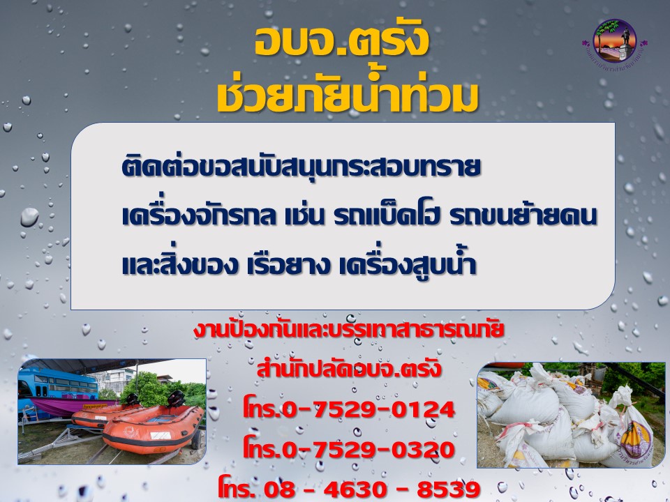 ทั้งนี้ ผู้นำท้องที่ ท้องถิ่นและประชาชนที่เดือดร้อนและมีความประสงค์ขอสนับสนุนอุปกรณ์ เครื่องจักรกล กระสอบทราย ดังกล่าว สามารถติดต่อเจ้าหน้าที่งานฝ่ายป้องกันและบรรเทาสาธารณภัย อบจ.ตรัง โทร. 0-7529-0124 /0-7529-0320 และ 08 – 4630 – 8539 ได้ตลอด 24 ชั่วโมง หรือประสานงานผ่านสมาชิกสภา อบจ.ตรัง ในพื้นที่ของท่าน