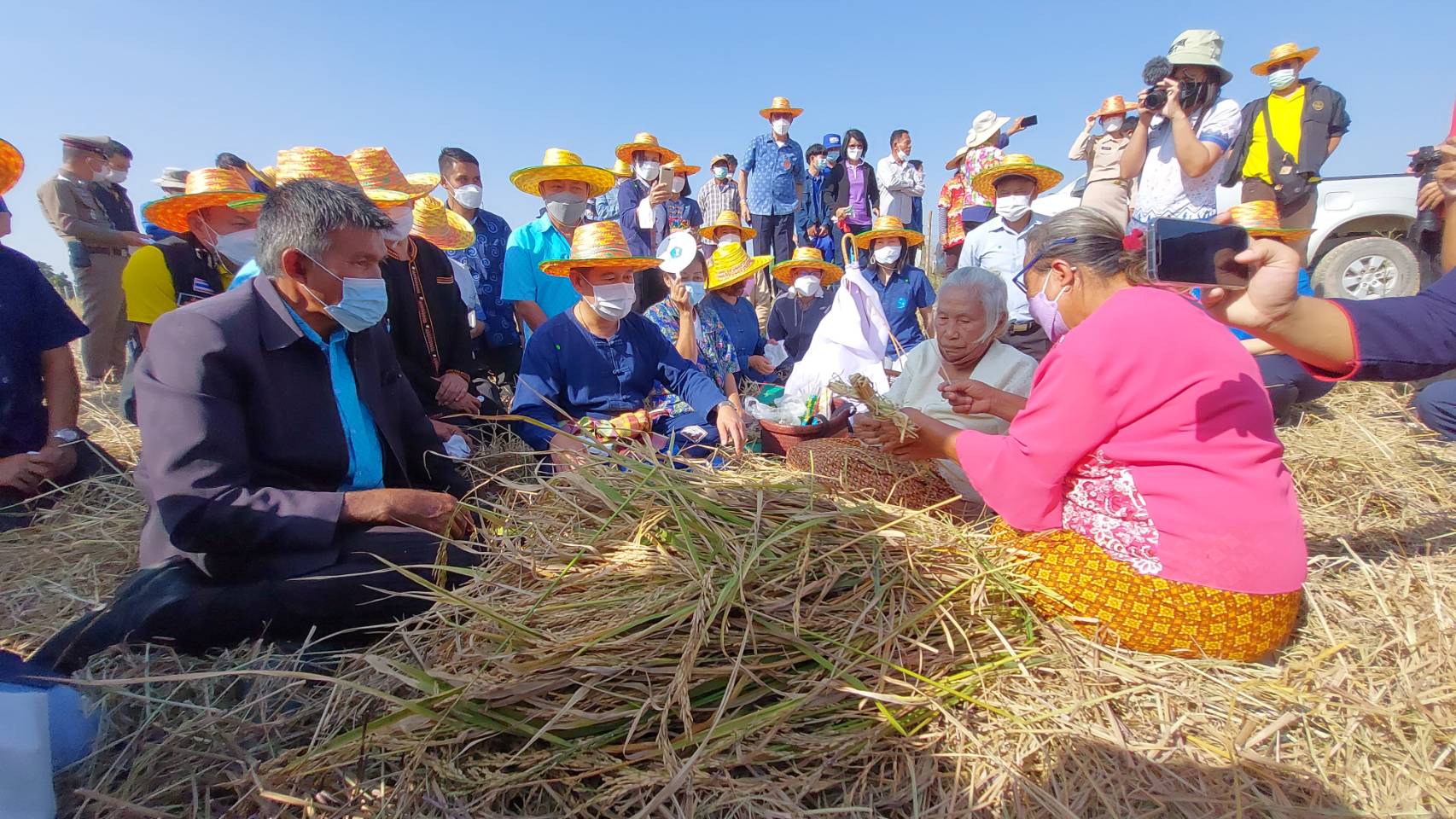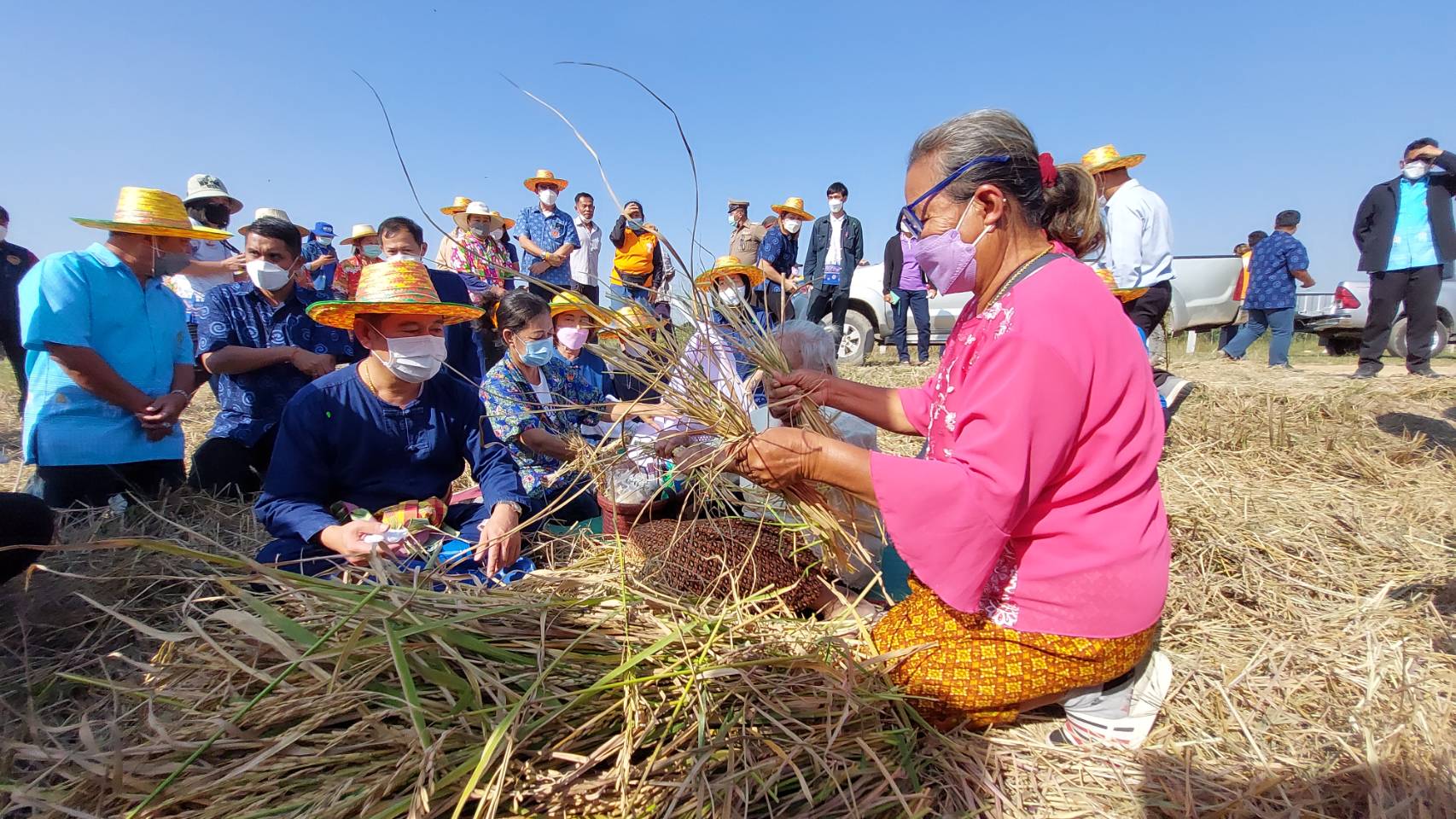 จากนั้นนายณัฐภัทร สุวรรณประทีป ผู้ว่าราชการจังหวัดสุพรรณบุรี พร้อมผู้ร่วมงานและเกษตรกร ได้ร่วมกันทำกิจกรรมลงแขกเกี่ยวข้าวด้วยเคียวแบบโบราณ ร่วมพิธีรับขวัญเข้าบ้าน หรือพิธีกู่ข้าว การตำข้าวเม่า เผาข้าวหลาม โดยมีคุณยายพจน์ ชาวนา ต.หนองราชวัตร อ.หนองหญ้าไซ เป็นผู้ประกอบพิธีเรียกขวัญพระแม่โพสพ ตามพิธีโบราณที่สืบทอดกันมาตั้งแต่สมัยปู่ย่า ตายาย โดยการนำฟางข้าวมามัดเป็นหุ่น เป็นตัวแทนของพระแม่โพสพ มีเครื่องเซ่นไหว้พระแม่โพสพ เช่น ผลไม้ น้ำเปล่า กล้วยหวีงาม ขนมต้มแดง-ต้มขาว ขนมจันอับ ถั่วงา ฝักเชื่อม มาเป็นเครื่องพลีกรรม และได้ขับร้องบทเพลงกล่อม เพื่อถวายพลีกรรมพระแม่โพสพ เป็นการย้อนยุคประเพณีโบราณเก่าแก่และเป็นการอนุรักษ์วัฒนธรรมอันดีงามของเกษตรกรสมัยโบราณไว้ให้เยาวชนได้สืบสานต่อไป