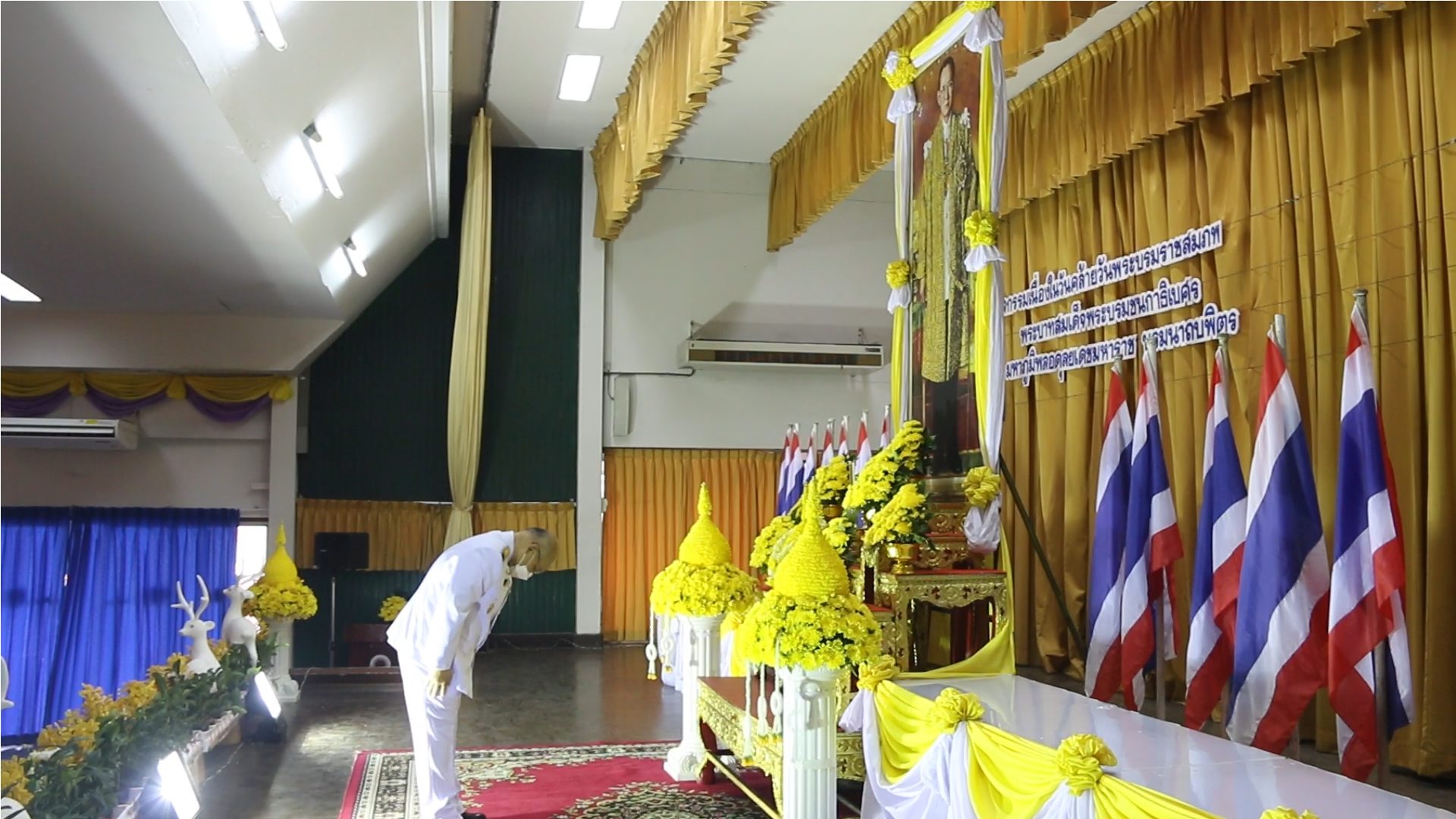 ต่อจากนั้น นายชัยชาญ สิทธิวิรัชธรรม ผู้ว่าราชการจังหวัดสิงห์บุรี เป็นประธานในพิธีวางพวงมาลาและถวายบังคม หน้าพระบรมฉายาลักษณ์ พระบาทสมเด็จพระบรมชนกาธิเบศร มหาภูมิพลอดุลยเดชมหาราช บรมนาถบพิตร ในหลวง รัชกาลที่ 9 เพื่อแสดงออกถึงความจงรัก ภักดี และน้อมรำลึกในพระมหากรุณาธิคุณ ที่พระองค์ทรงมีต่อพสกนิกรชาวไทย พระองค์บำเพ็ญพระราชกรณียกิจมากมาย และทรงตรากตรำพระวรกายอย่าไม่รู้จักเหน็ดเหนื่อย พสกนิกรจังหวัดสิงห์บุรี ต่างสำนึกในพระมหากรุณาธิคุณของพระองค์อย่างหาที่สุดมิได้ ณ หอประชุมองค์การบริหารส่วนจังหวัดสิงห์บุรี