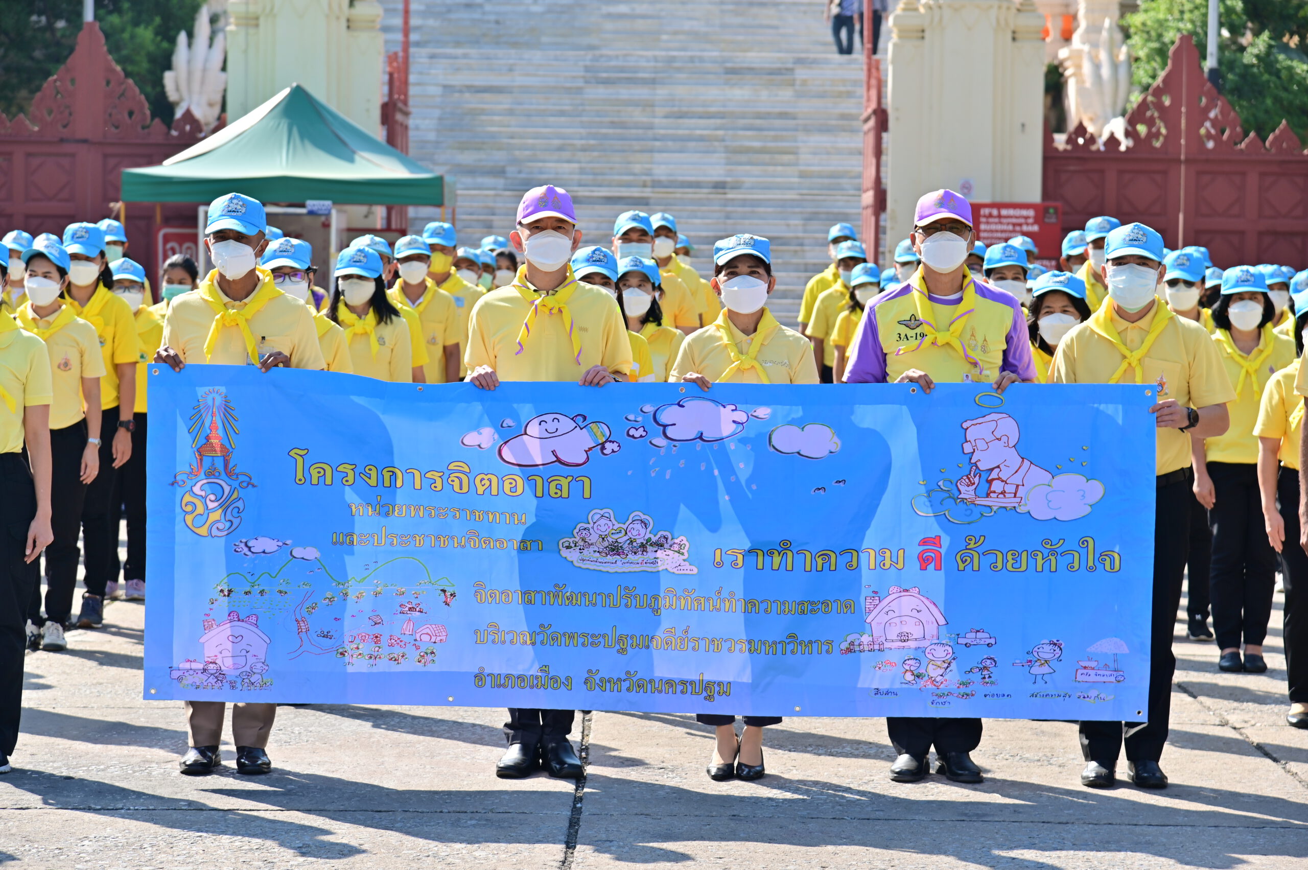 โอกาสนี้ ผู้ว่าราชการจังหวัดนครปฐม นำข้าราชการ ทหาร ตำรวจ และประชาชนจิตอาสา ร่วมกิจกรรมจิตอาสาทำความสะอาด ณ บริเวณลานหน้าพระร่วงโรจนฤทธิ์ องค์พระปฐมเจดีย์ โดยร่วมกันกวาดขยะ ใบไม้ ฉีดน้ำล้างสิ่งสกปรกบริเวณดังกล่าว ให้มีความสะอาดสวยงามอีกด้วย