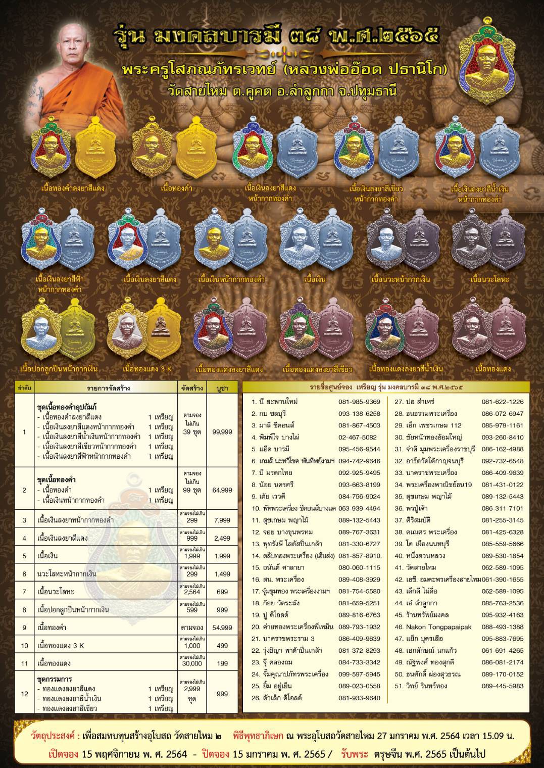 รายการจัดสร้างประกอบด้วย – ชุดเนื้อทองคำอุปถัมภ์ ตามสั่งจองไม่เกิน 39 ชุด บูชา 99,999 บาทประกอบด้วย 1.เนื้อทองคำลงยาแดง 1เหรียญ 2.เนื้อเงินลงยาสีแดงหน้ากากทองคำ 1 เหรียญ 3.เนื้อเงินลงยาสีน้ำเงินหน้ากากทองคำ 1 เหรียญ 4.เนื้อเงินลงยาสีเขียวหน้ากากทองคำ 1 เหรียญ 5.เนื้อเงินลงยาสีฟ้าหน้ากากทองคำ 1 เหรียญ