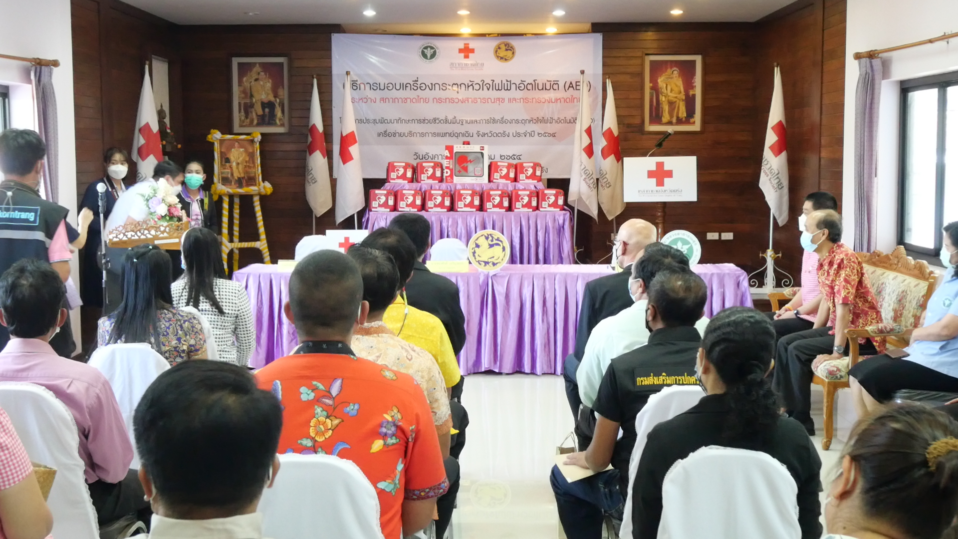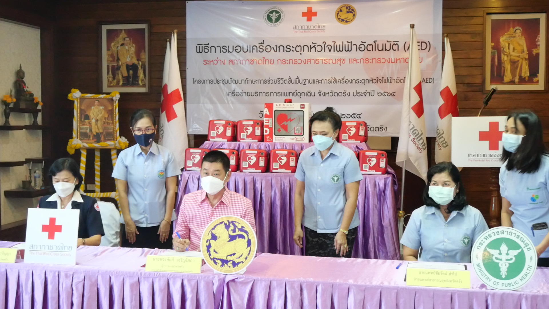 ที่สำนักงานเหล่ากาชาดจังหวัดตรัง นายขจรศักดิ์ เจริญโสภา ผู้ว่าราชการจังหวัดตรัง เป็นประธานในพิธีส่งมอบเครื่องกระตุกหัวใจไฟฟ้าอัตโนมัติ (AED) และพิธีลงนามบันทึกข้อตกลงความร่วมมือโครงการบริจาคเครื่องกระตุกหัวใจไฟฟ้าอัตโนมัติ
