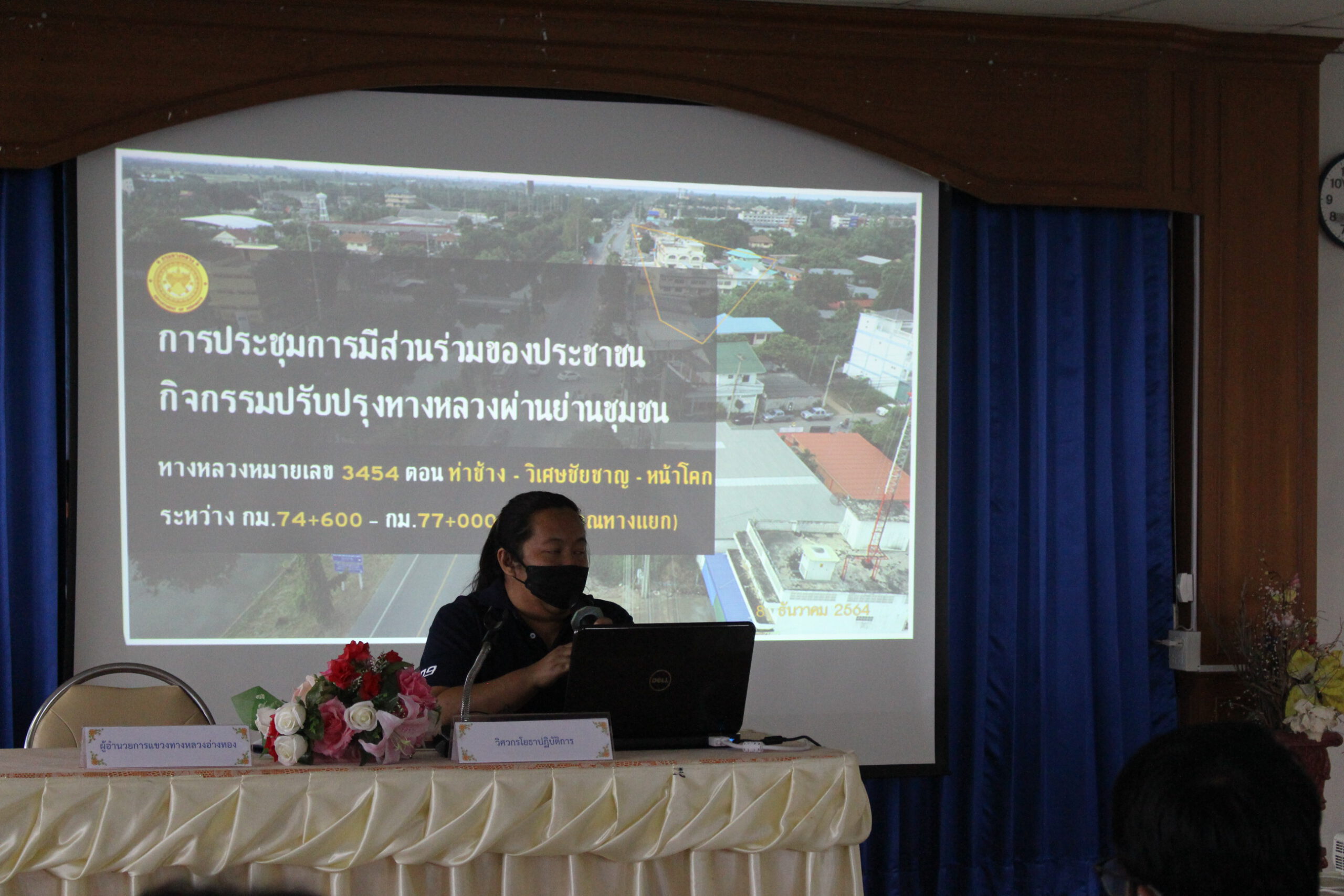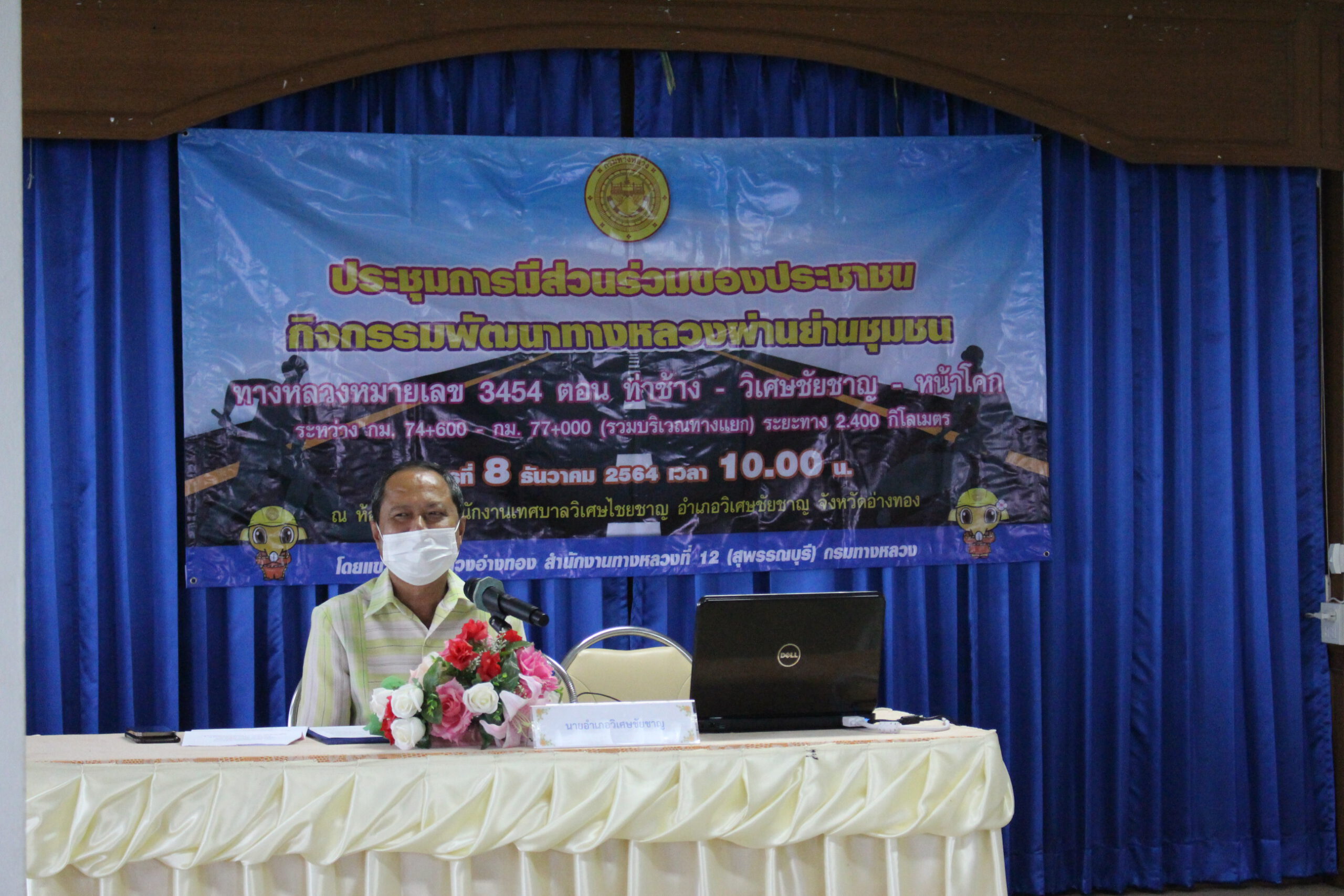 เมื่อวันที่ 8 ธันวาคม พ.ศ. 2564 เวลา 10.00 น.นายไพบูลย์ ศุภบุญ นายอำเภอวิเศษชัยชาญ จังหวัดอ่างทอง เป็นประธานในการเปิดเวที รับฟังความคิดเห็นของประชาชน โดยมี นายวิชัย ลิมป์วัฒนชัย นายกเทศมนตรีตำบลศาลเจ้าโรงทอง นายจตุพล เทพมังกร รองผู้อำนวยการสำนักงานทางหลวงที่ 12 สุพรรณบุรี ผู้แทนนายกเทศมนตรีตำบลท่าช้างและหน่วยงานโครงการส่งน้ำและบำรุงรักษายางมณี หน่วยงานการไฟฟ้าส่วนภูมิภาคสาขาวิเศษชัยชาญ ผู้นำท้องที่ได้แก่ กำนัน ผู้ใหญ่บ้าน ผู้ช่วยฯ พร้อมด้วยประชาชนที่อยู่ในพื้นที่ ซึ่งจะได้รับผลการะทบจากการดำเนินการก่อสร้างในครั้งนี้เข้าร่วมประชุม กว่า 107 คน ณ ห้องประชุมชั้น 3 ของเทศบาลตำบลวิเศษไชยชาญ อำเภอวิเศษชัยชาญ จังหวัดอ่างทอง