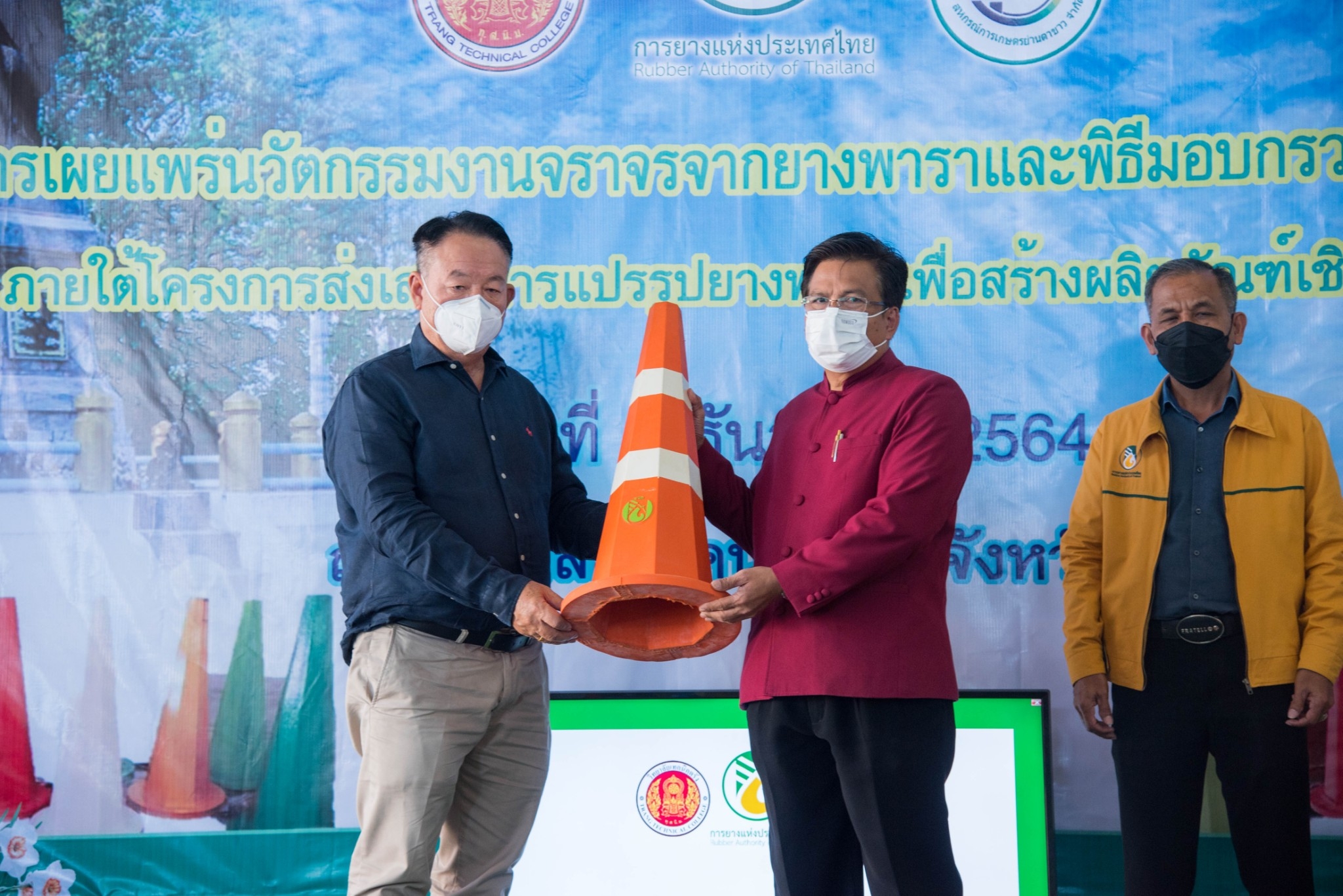 นายก อบจ.ตรัง รับมอบผลิตภัณฑ์กรวยจราจรยางพารา จากวิทยาลัยเทคนิคตรัง