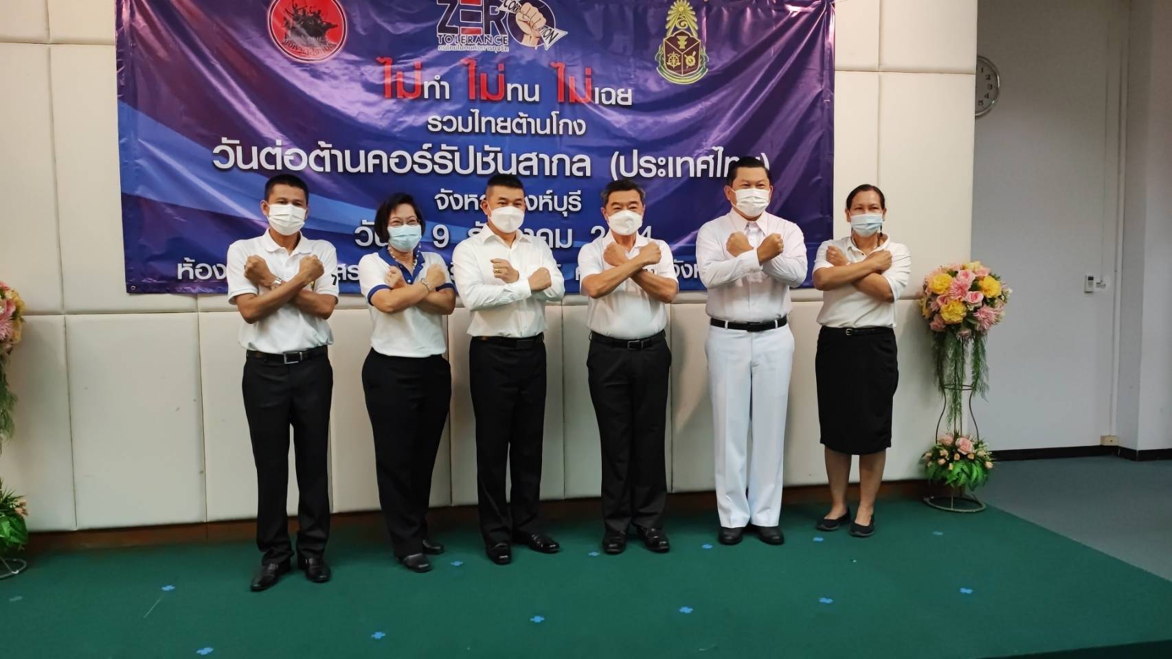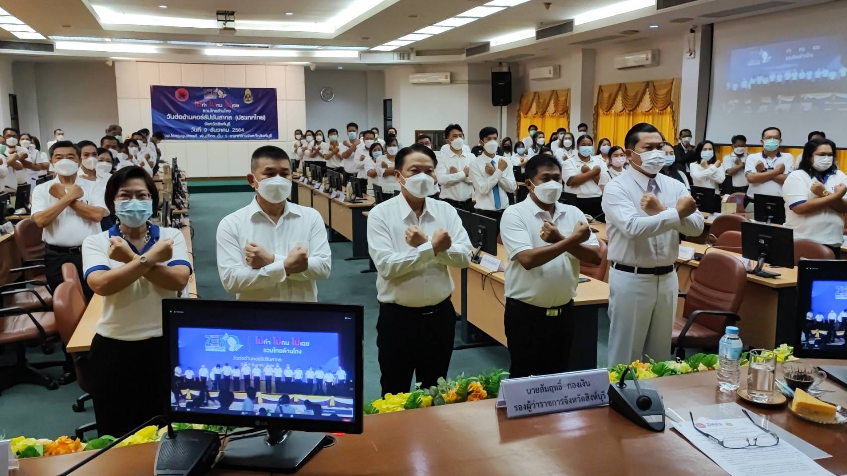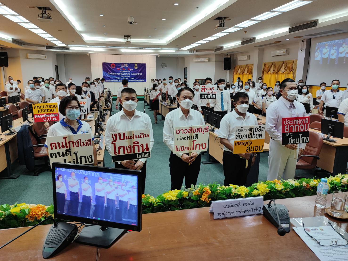 วันพฤหัสบดีที่ 9 ธันวาคม พ.ศ.2564 เวลา 09.30 น.นายสัมฤทธิ์ กองเงิน รองผู้ว่าราชการจังหวัดสิงห์บุรี นายสมชาย หลีหล้าน้อย รองผู้ว่าราชการจังหวัดสิงห์บุรี ผู้บังคับการตำรวจภูธรจังหวัดสิงห์บุรีพร้อมด้วยหัวหน้าส่วนราชการ หัวหน้าหน่วยงานภาครัฐ ภาคเอกชน องค์กรปกครองส่วนท้องถิ่น ภาคประชาสังคม ทุกภาคส่วน ที่เกี่ยวข้องใส่เสื้อสีขาว ร่วมกิจกรรมประกาศเจตนารมณ์เนื่องในวันต่อต้านคอร์รัปชันสากล (ประเทศไทย) แบบออนไลน์ ณ ห้องประชุมขุนสรรค์ พันเรือง ชั้น 5 ศาลากลางจังหวัดสิงห์บุรี ได้รับฟัง พลเอกประยุทธ์ จันทร์โอชา นายกรัฐมนตรี แถลงผลการประเมินคุณธรรมและความโปร่งใสในการดำเนินงานของหน่วยงานภาครัฐ (ITA) และสถานการณ์การทุจริต โดย พลตำรวจเอกวัชรพล ประสานราชกิจ ประธานกรรมการ ป.ป.ช. พร้อมด้วย สำนักงาน ป.ป.ท. และองค์กรต่อต้านคอร์รัปชัน (ประเทศไทย) ร่วมแสดงสัญลักษณ์ต่อต้านการทุจริต ผ่านสัญญาณการถ่ายทอดสดทาง Facebook Live เพจสำนักงาน ป.ป.ช.
