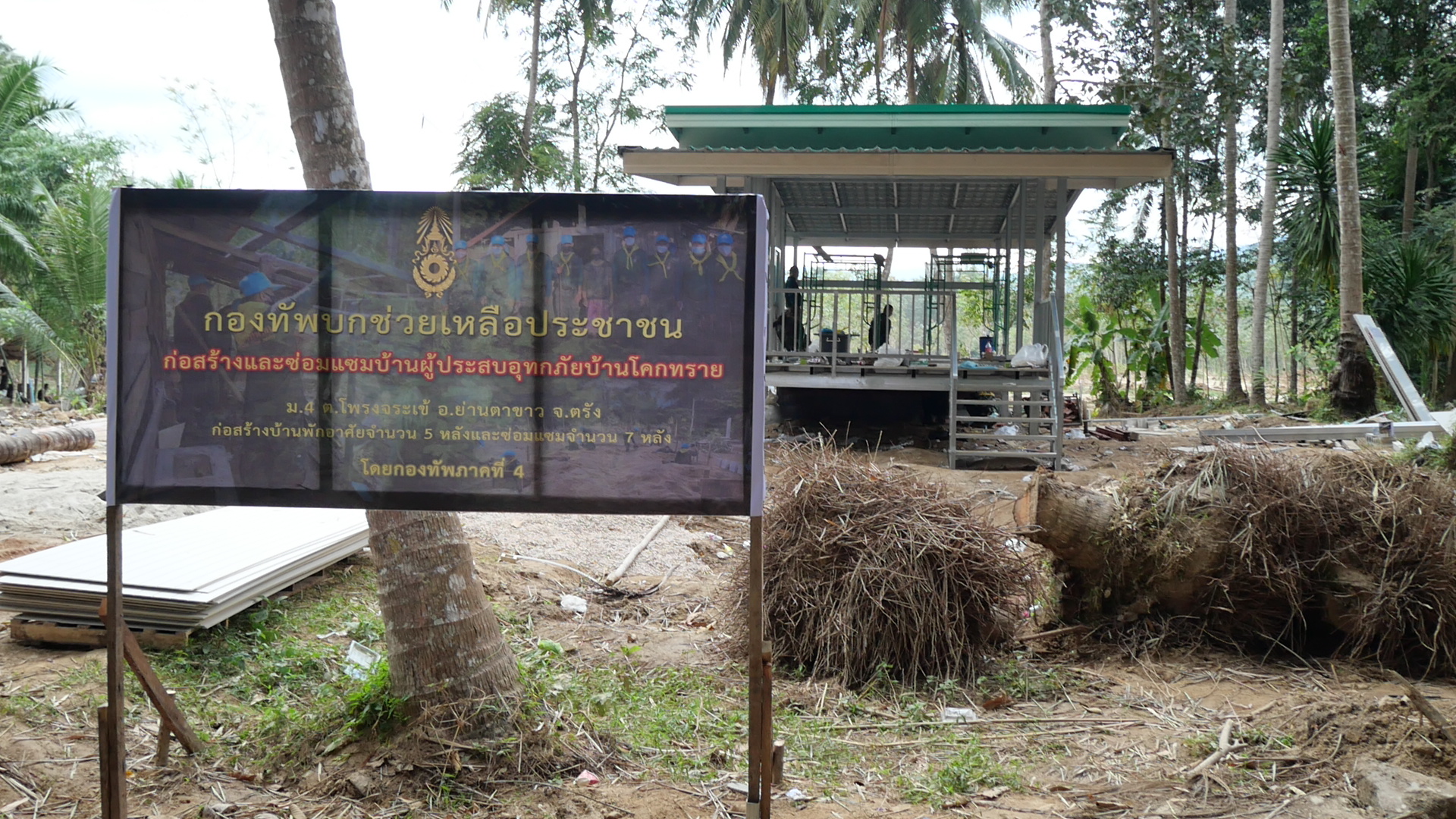 ทั้งนี้แม่ทัพภาคที่ 4 สั่งการให้จิตอาสาในกองทัพภาคที่ 4 ลงพื้นที่ช่วยเหลือประชาชน ซึ่งจิตอาสามณฑลทหารบกที่ 43 ค่ายเทพสตรีศรีสุนทร อำเภอทุ่งสง จังหวัดนครศรีธรรมราช นำรถครัวสนาม มาทำข้าวกล่อง แจกจ่ายให้กับประชาชนวันละ 3 มื้อ มื้อละ 400 กล่อง ทางด้านองบัญชาการช่วยรบที่ 4 กองพลทหารราบที่ 5 ค่ายเทพสตรีศรีสุนทร อำเภอทุ่งสง จังหวัดนครศรีธรรมราช นำรถมาผลิตน้ำดื่มแจกให้กับประชาชน ในขณะที่จิตอาสากองพันทหารช่าง 401,402 จังหวัดพัทลุง และจิตอาสากองพันทหารราบที่ 4 กรมทหารราบที่ 15 ค่ายพระยารัษฎานุประดิษฐ์ อำเภอห้วยยอด จังหวัดตรัง ช่วยกันก่อสร้างบ้านเรือให้กับประชาชนรวมถึงซ่อมแซมบ้านของประชาชนที่ได้รับความเสียหาย ความคืบหน้าในการก่อสร้างบ้านนั้นมีความคืบหน้าประมาณ 50-60 เปอร์เซ็นต์ มีการกำหนดส่งมอบบ้านที่ก่อสร้างแล้วเสร็จประมาณวันที่ 28 ธันวาคม ที่จะถึงนี้
