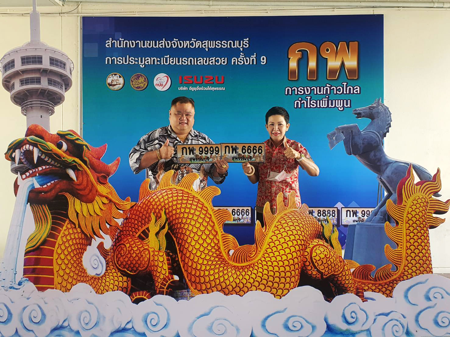 สำหรับแผ่นป้ายทะเบียนเลขสวย หมวดอักษร “กพ” มีความหมายที่เป็นมงคลคือ “การงานก้าวไกล กำไรเพิ่มพูน” รูปแบบป้ายทะเบียนกราฟิก สีสันสวยงาม มีรูปภาพสัญลักษณ์ที่สำคัญของจังหวัดสุพรรณบุรี เช่น บึงฉวาก หอคอยเฉลิมพระเกียรติ รูปมังกรสวรรค์ ที่บ่งบอกถึงความมีอำนาจ บารมี ความสุข และความปลอดภัย เป็นมงคลแก่ผู้ครอบครอง โดยทะเบียนเลขสวยที่นำออกประมูลจำนวน 301 หมายเลข ประกอบด้วย เลขโฟร์ เลขตอง เลขคู่ เลขตัวเดียว เลขคู่สลับ เลขคู่เหมือน และเลขเรียง สามารถเลือกประมูลหมายเลขที่ถูกใจ เป็นมงคลแก่ตนเอง พร้อมทั้งรับสิทธิพิเศษสามารถจดทะเบียนได้ทันที หรือจะนำไปใช้กับรถที่จดทะเบียนแล้ว